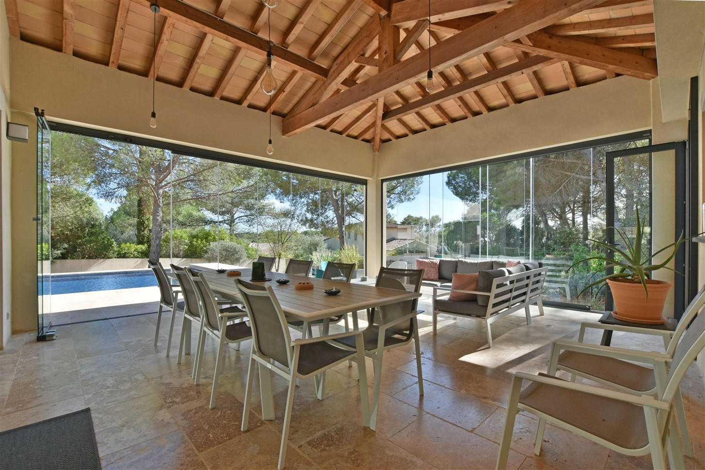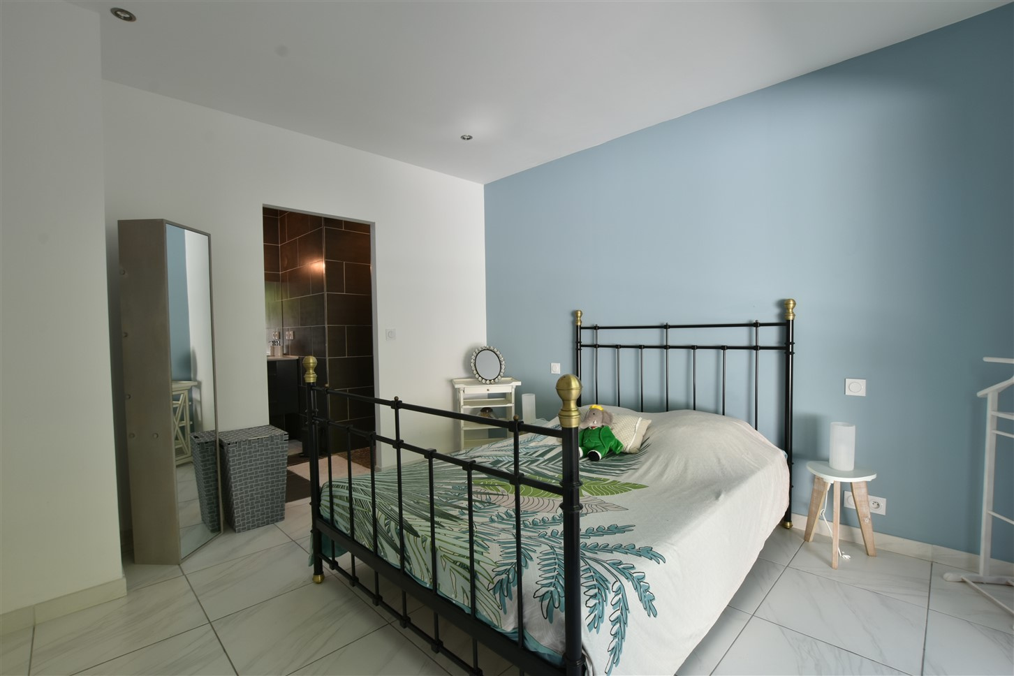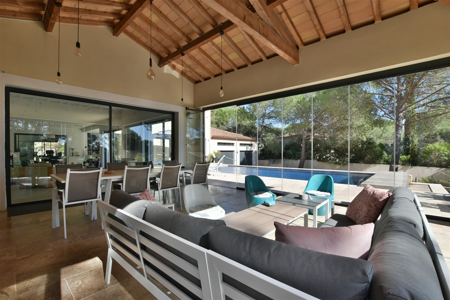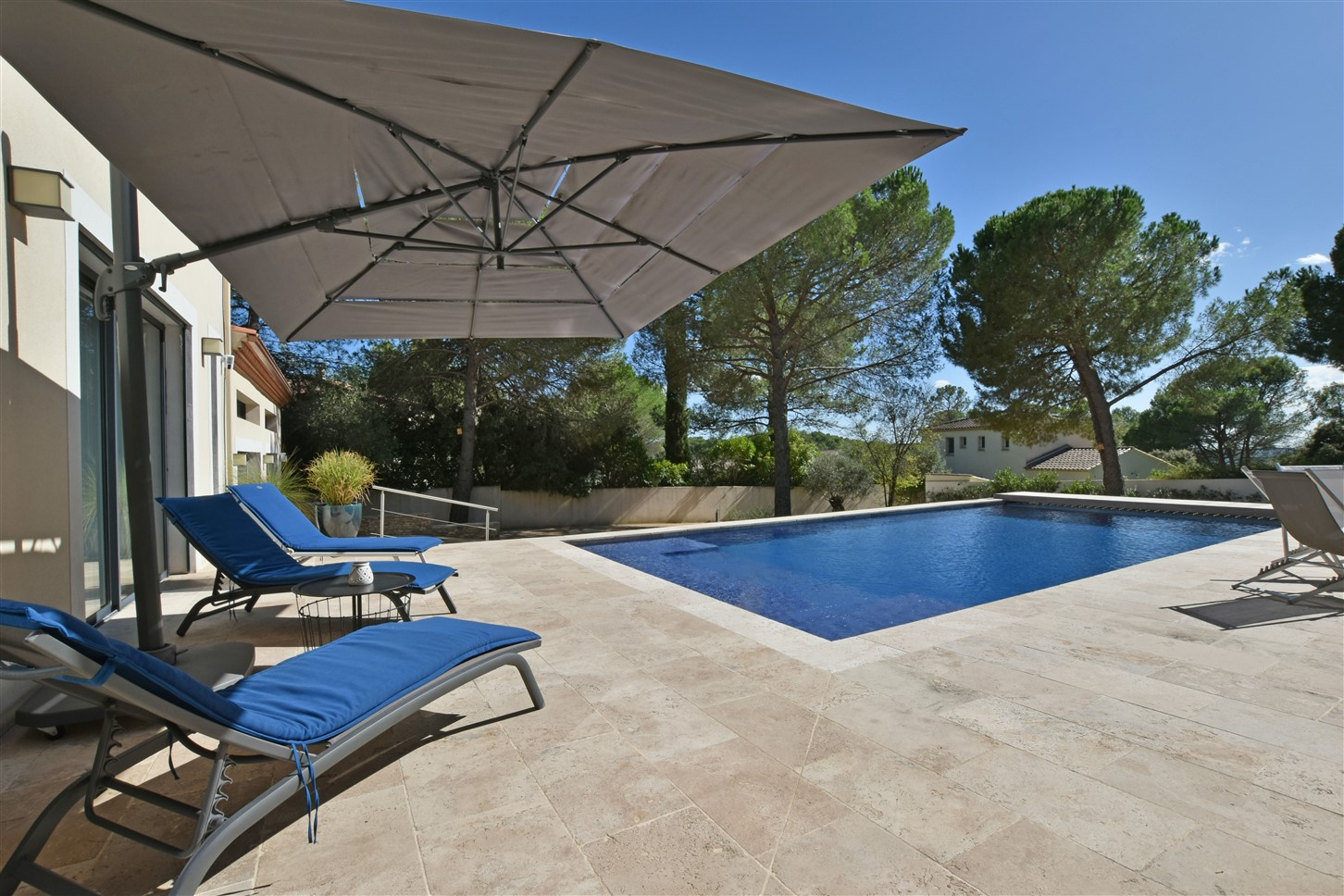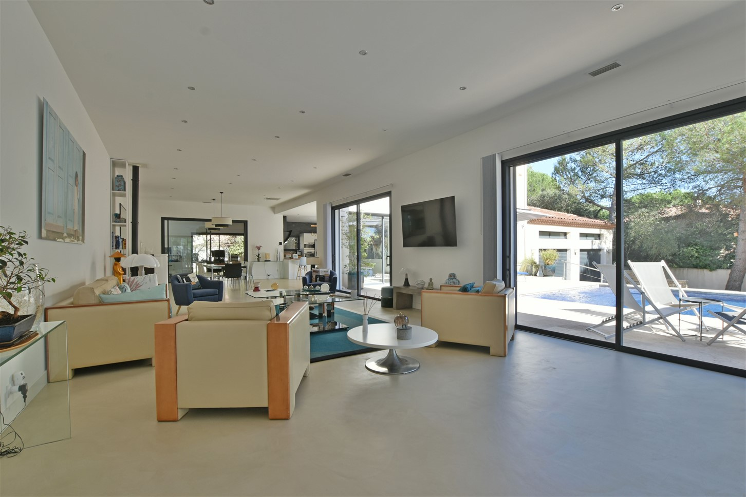 It offers very beautiful volumes and exceptional brightness thanks to its large bay windows. Living room of 108 m2 with high ceilings and polished concrete floors, opening onto the terrace and the swimming pool. Adjoining summer kitchen of 60 m2, opening onto the terrace by a large folding bay window with fully opening leaves, travertine floor and beams attached with under roof in fire-resistant, equipped kitchen. For the night area, a master suite of 32.64 m2 on the ground floor, completed by a very bright office of 14.6 m2.