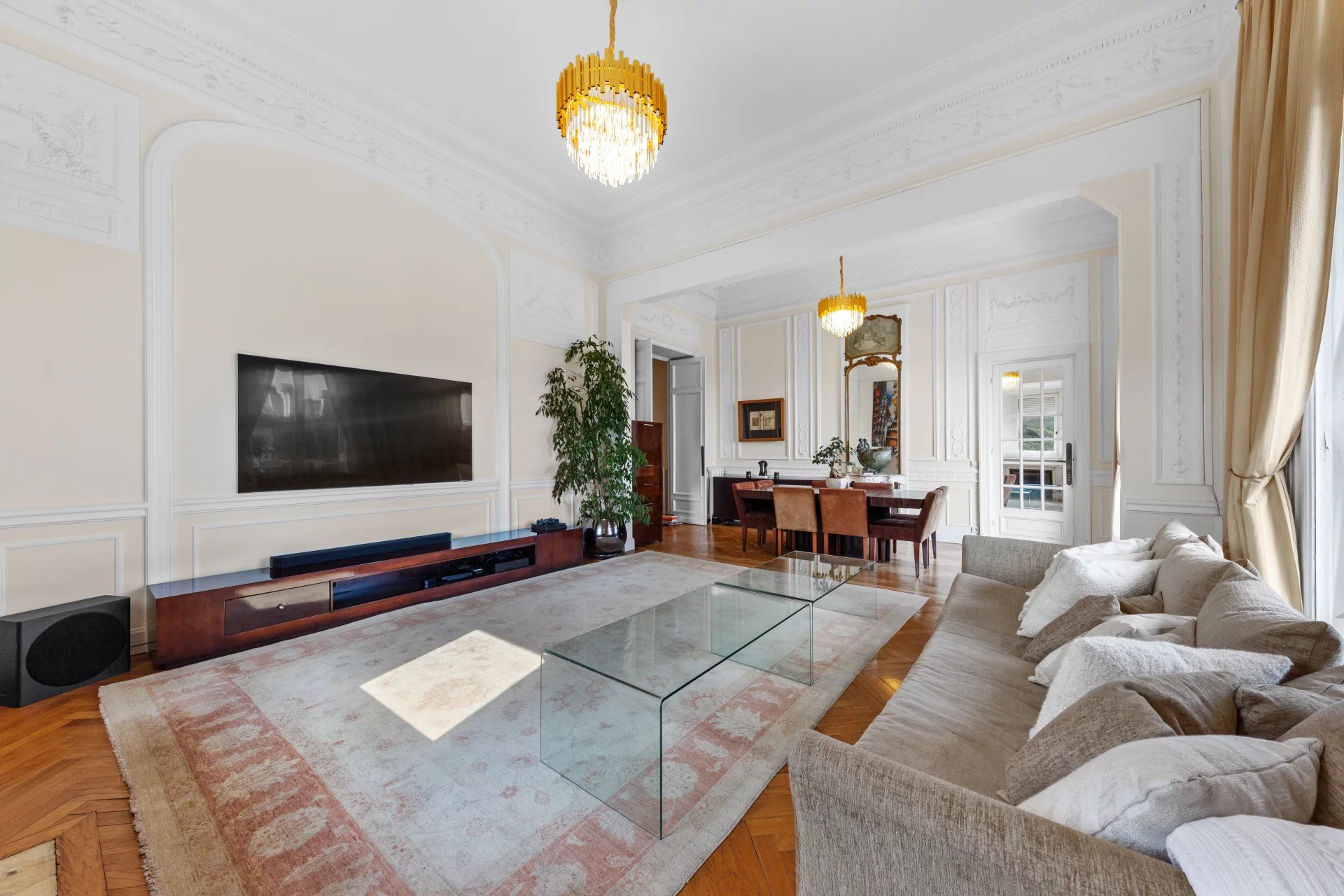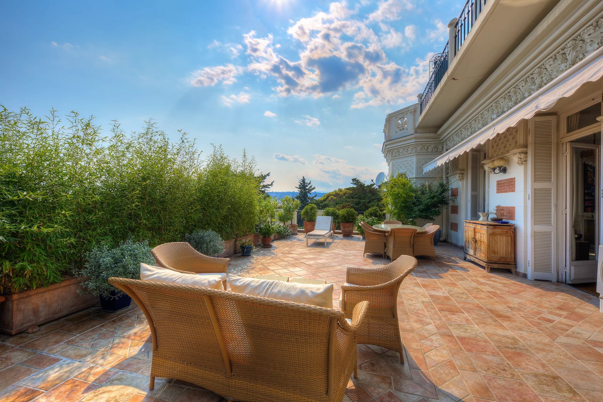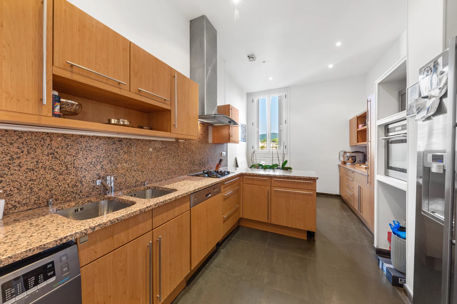 Apartment, 147 m2 of living space features a vast entrance hall, a double living room with dining room opening onto a vast 95 m2 terrace with sea and town views, a master suite with bathroom nestled in a turret, 2 other bedrooms, one with shower room, study, guest toilet, solid parquet flooring, high ceilings.