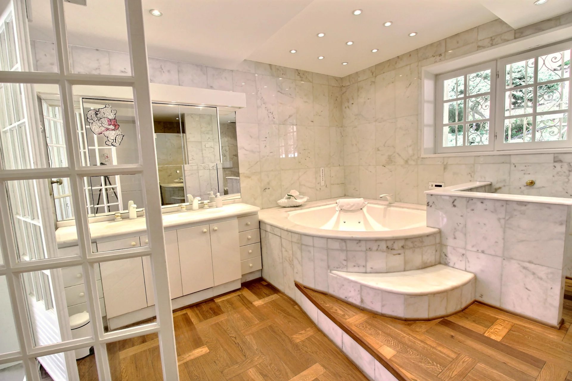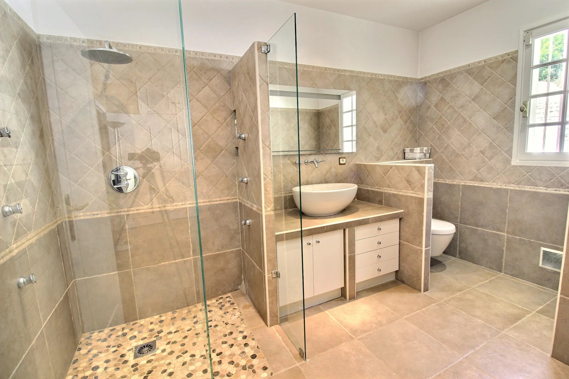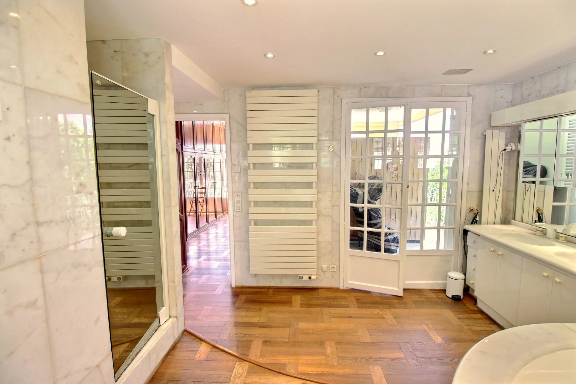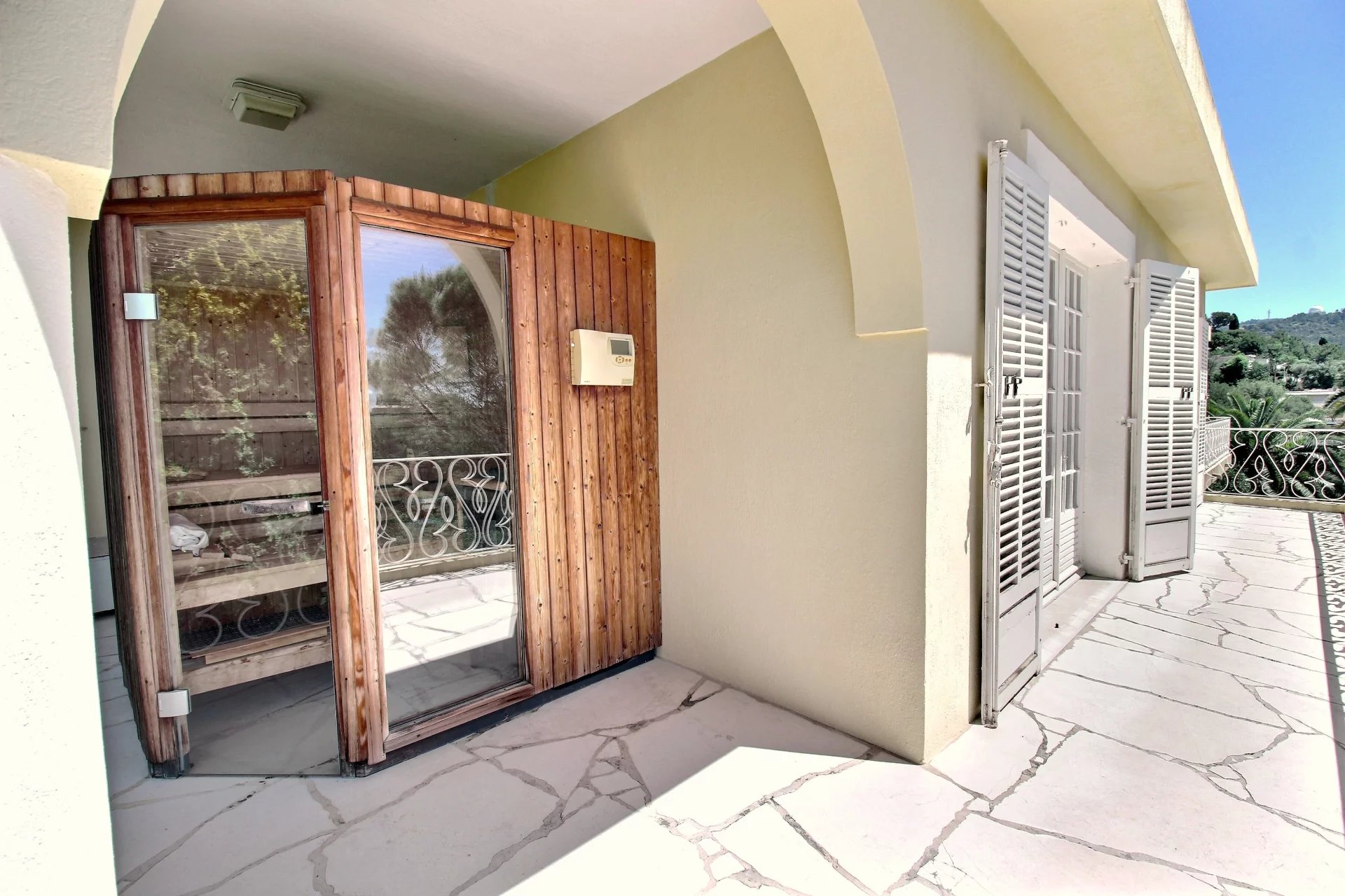 This majestic building with perfect proportions welcomes you with a large entrance. The raised part includes a separate kitchen with access to a covered terrace, offering a cocooning atmosphere, a very large living room facing south, two bedrooms with private shower rooms, and an office. Beautiful stairs lead you to the upper floor where you will find a large master suite with its dressing room and white marble bathroom. Two other bedrooms with private shower rooms complete this floor. On the terrace, you will discover a real Scandinavian sauna entirely made of wood, with a clear view.