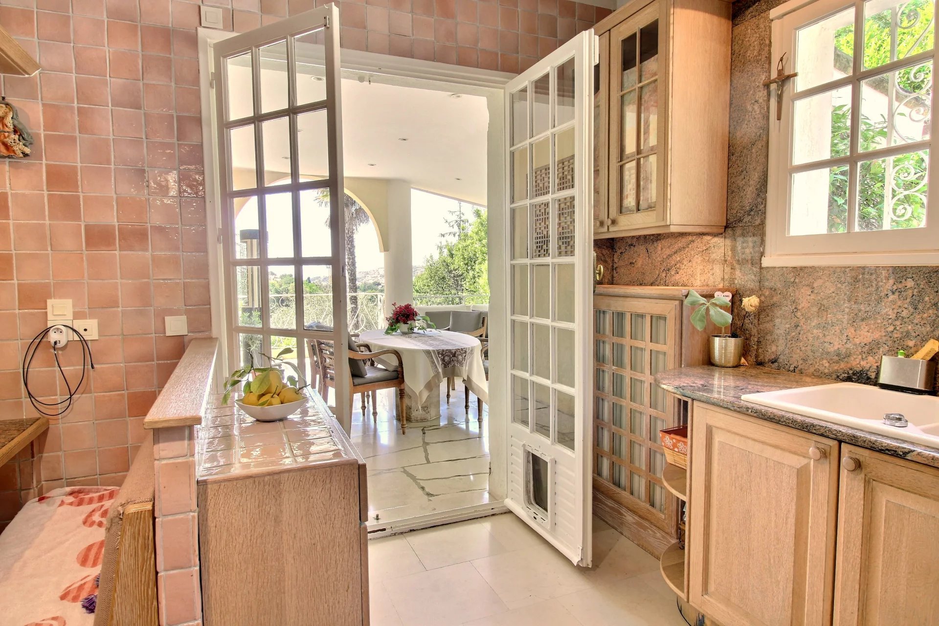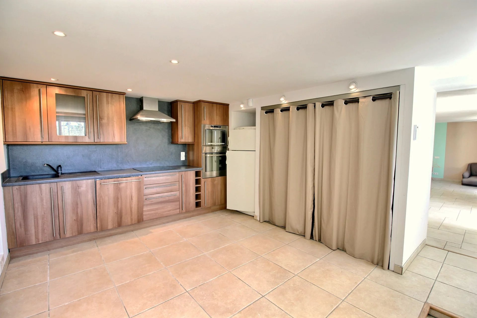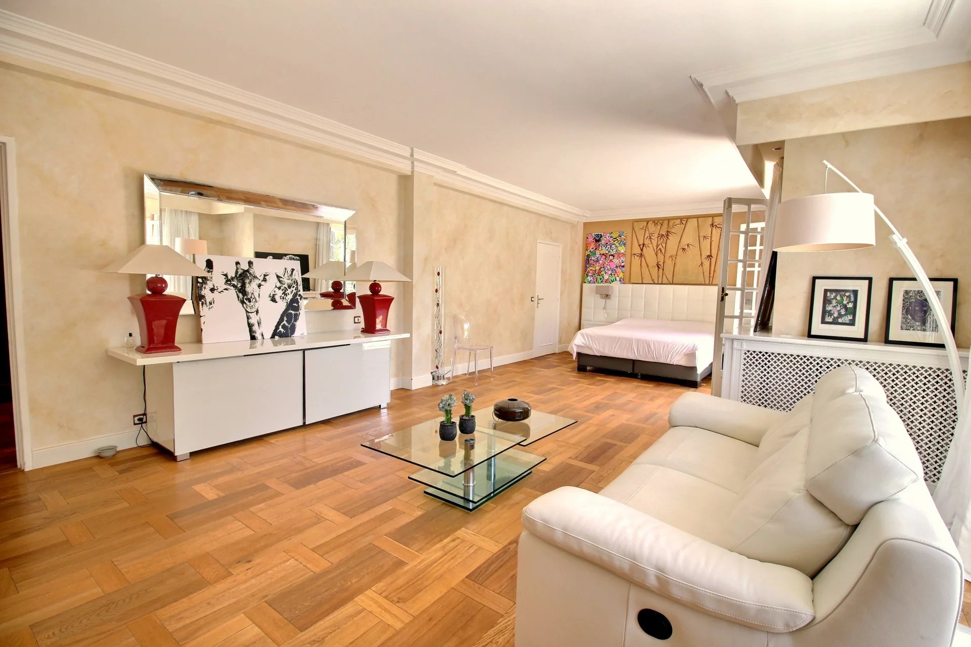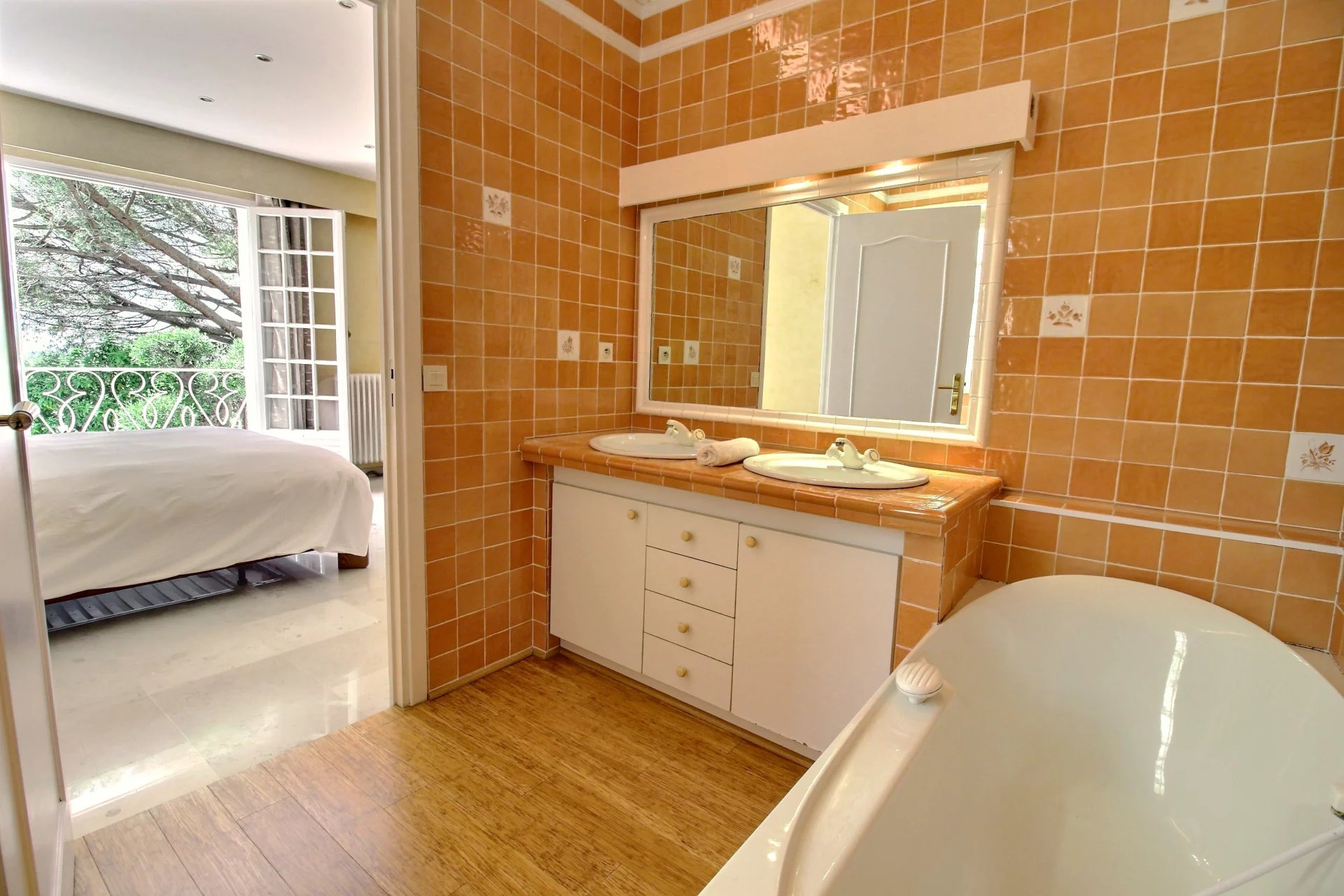 This majestic building with perfect proportions welcomes you with a large entrance. The raised part includes a separate kitchen with access to a covered terrace, offering a cocooning atmosphere, a very large living room facing south, two bedrooms with private shower rooms, and an office. Beautiful stairs lead you to the upper floor where you will find a large master suite with its dressing room and white marble bathroom. Two other bedrooms with private shower rooms complete this floor. On the terrace, you will discover a real Scandinavian sauna entirely made of wood, with a clear view.