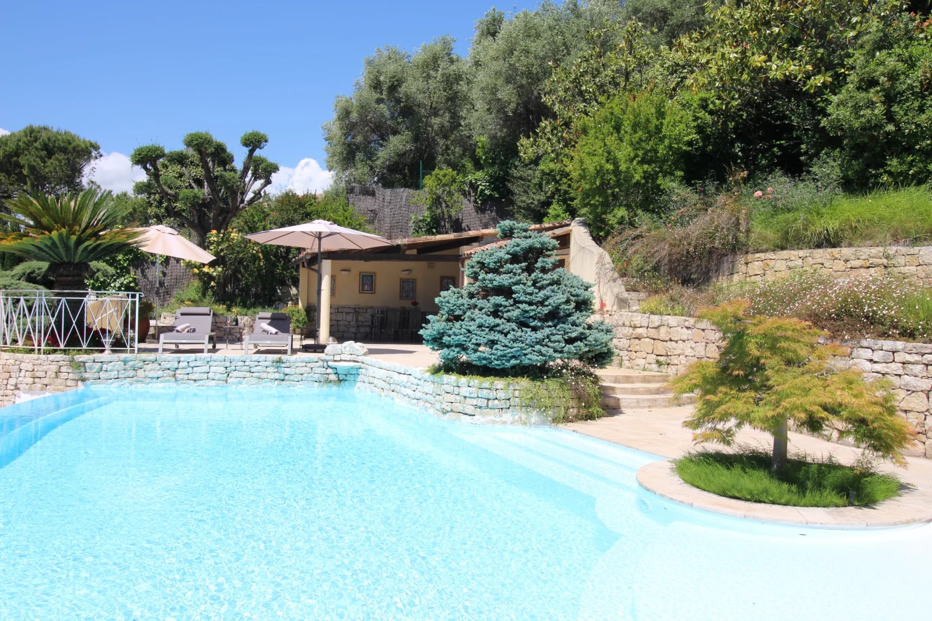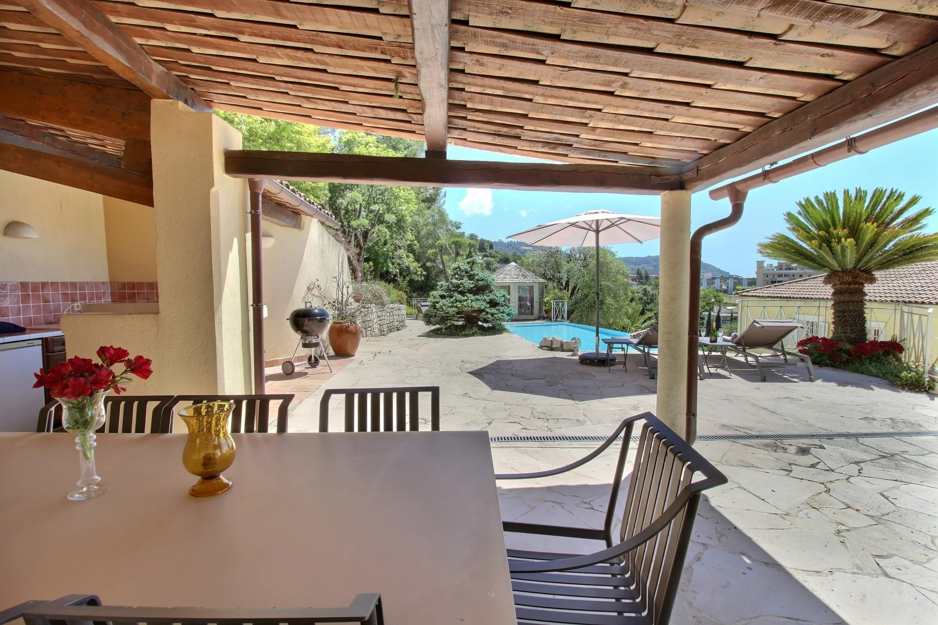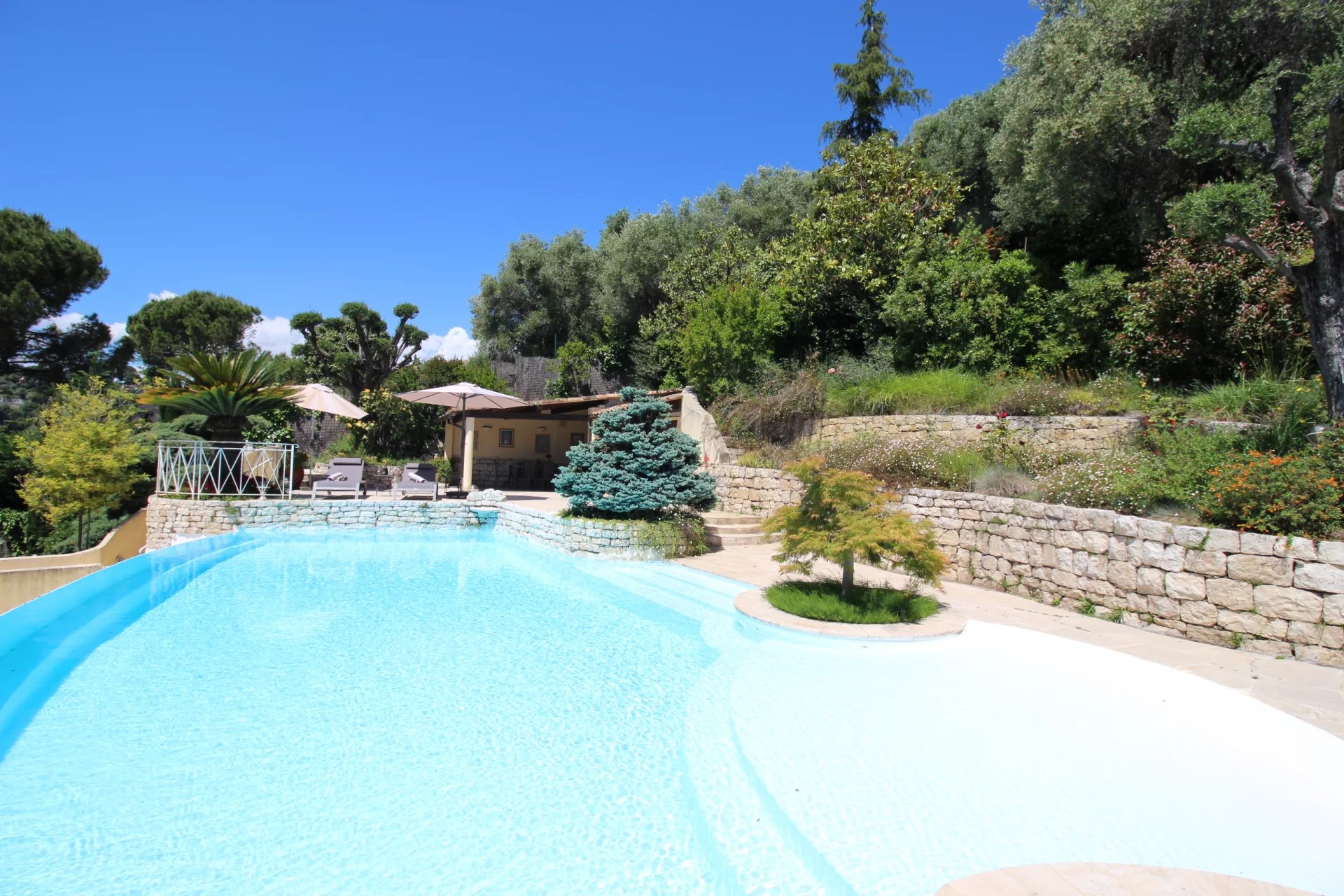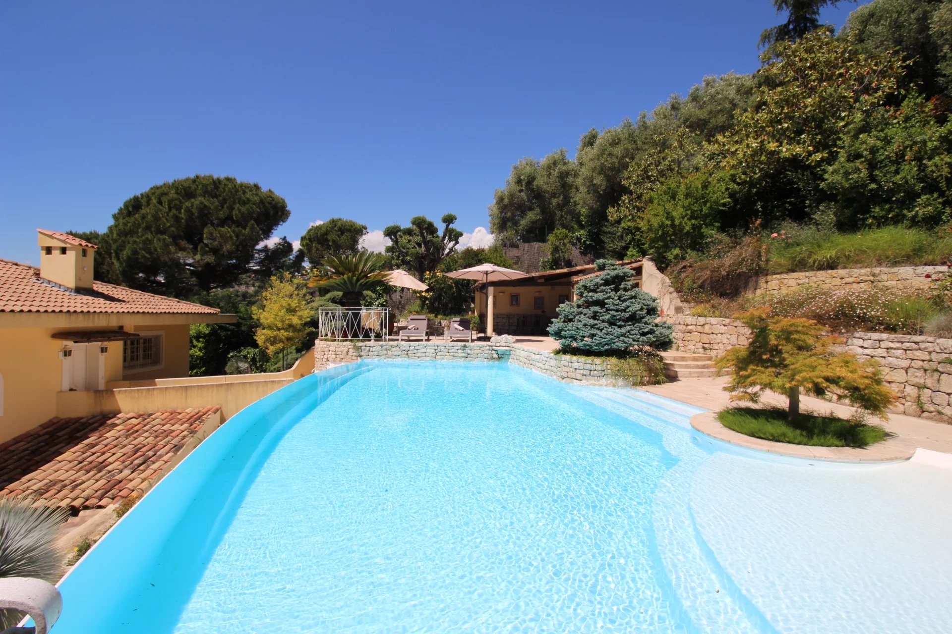 From this floor you can access the back of the house and its infinity pool. The swimming pool, a true haven of peace and relaxation, is accompanied by a summer kitchen and a shaded dining room.