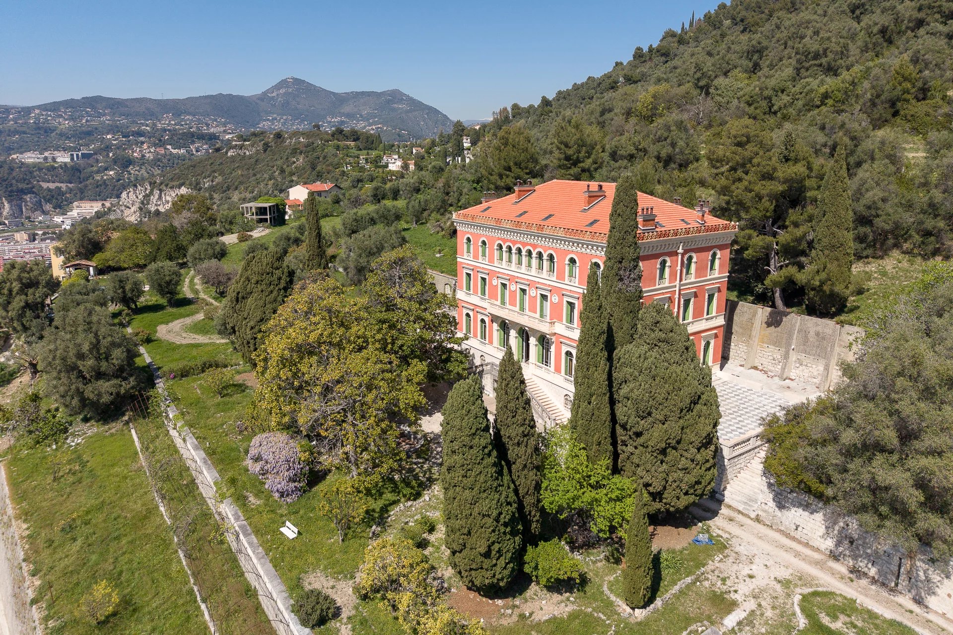 Built between 1884 and 1887 by the architect Vincent Levrot, the villa stands on the heights of Mont-Gros, at the heart of a park of around 6 hectares, formerly terraced, now enhanced by numerous olive trees.