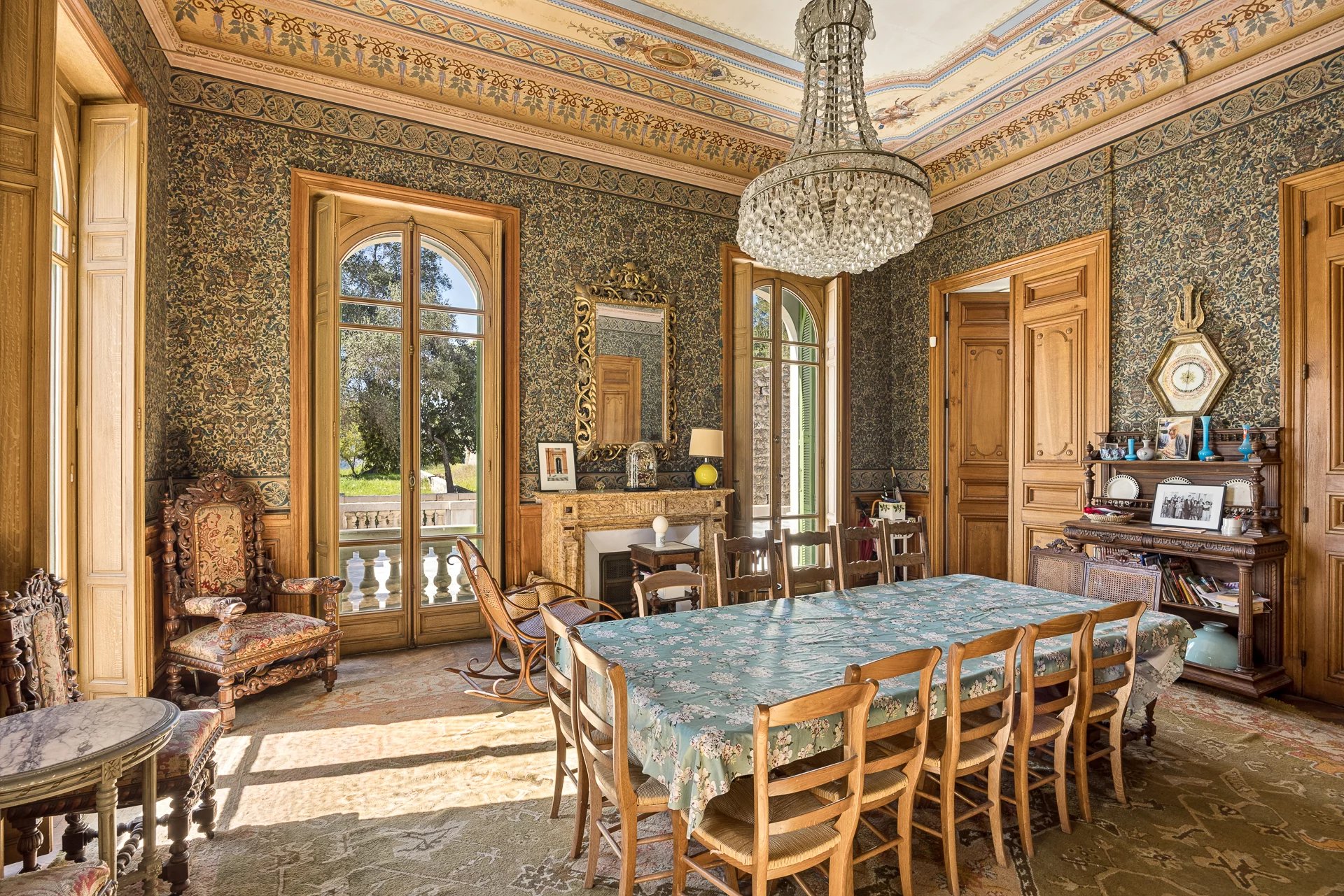 The ground floor features superb reception rooms; living room, dining room, smoking room with décor inspired by grand Italian villas. A central staircase leads to the upper floors, comprising numerous bedrooms, dressing rooms and bathrooms.