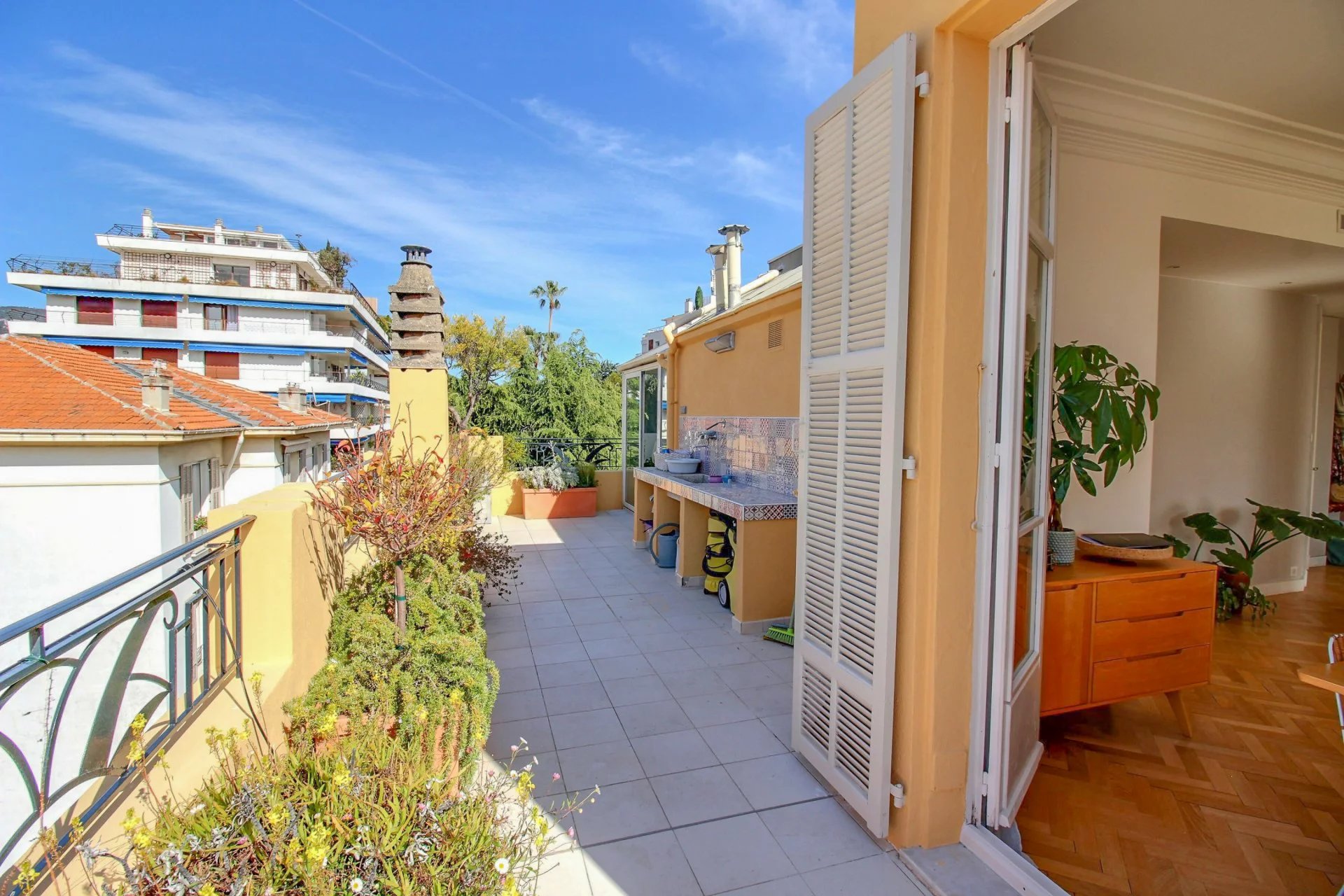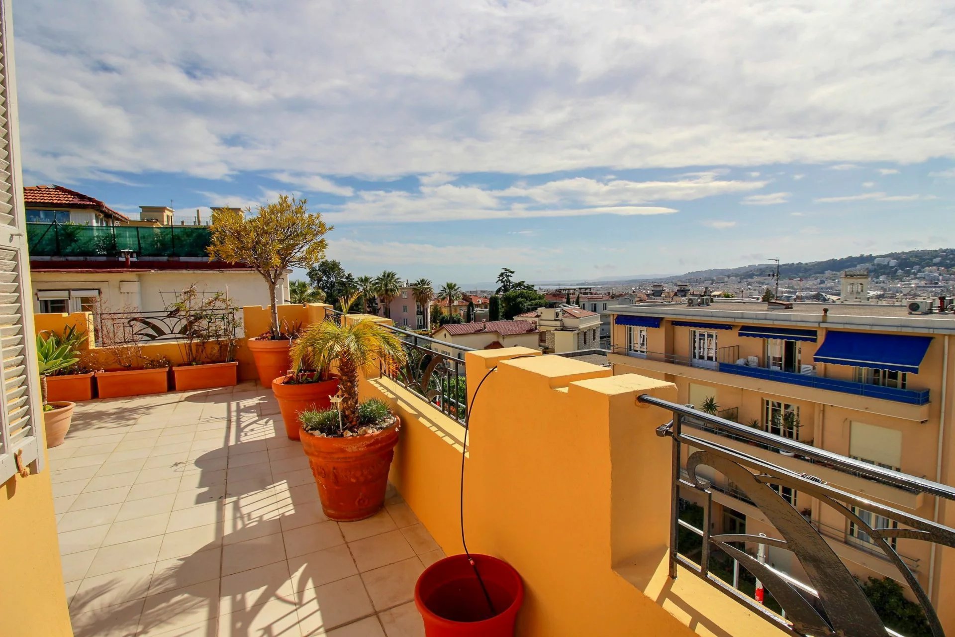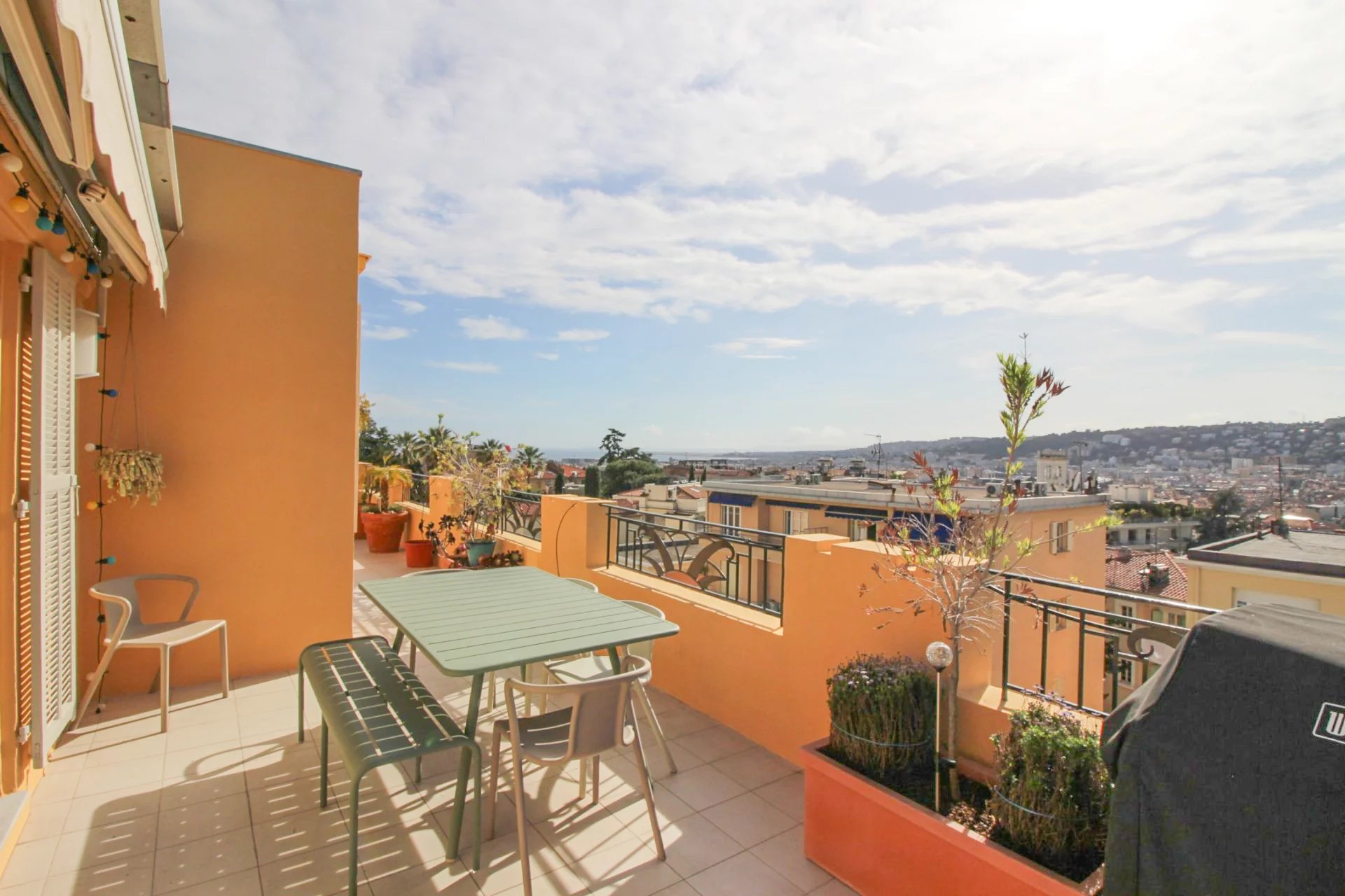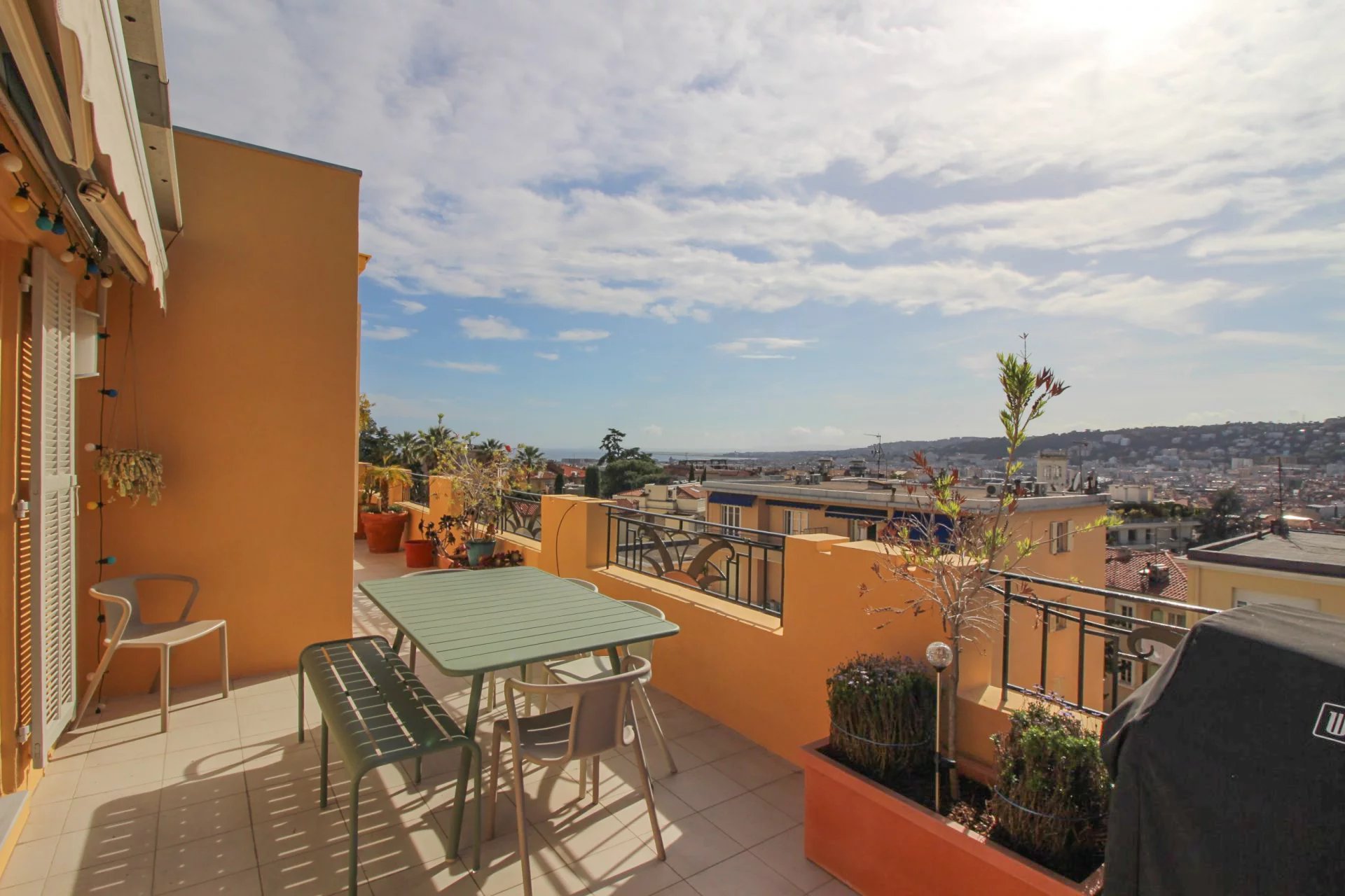On the 4th and last floor of a beautiful Art Deco building, this 84 m2 roof terrace has a 121 m2 terrace with a sea view and a view over the entire city of Nice.