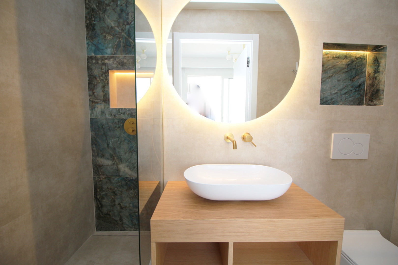 The night area offers three generously sized bedrooms (approximately 18, 14, and 12.5 m2), each designed as refined suites. The apartment includes two modern shower rooms, one with WC, a bathroom with window, and a separate guest WC.