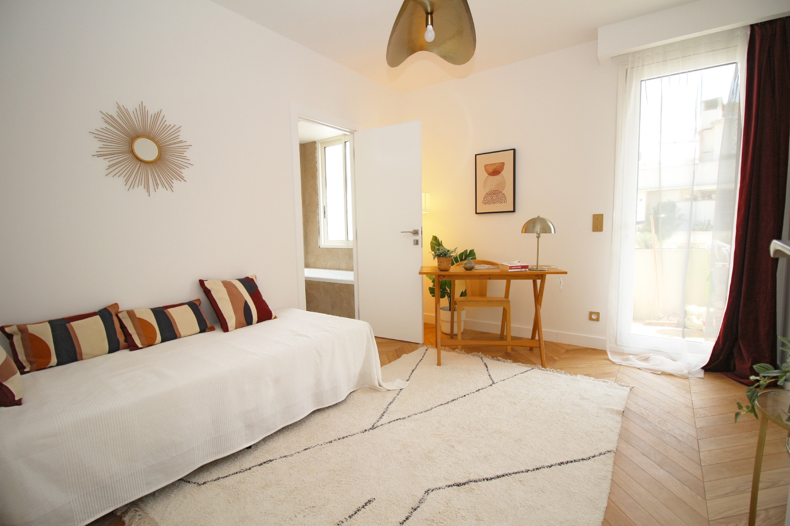 The location is exceptional: just steps from the beach, the Promenade des Anglais, and the vibrant shops and restaurants of central Nice. Despite its ultra-central setting, the apartment enjoys remarkable calm thanks to its position on a one-way street sheltered from traffic noise.