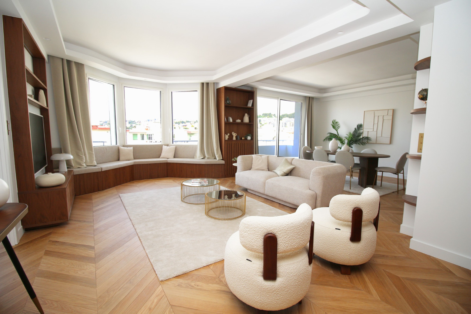 Located in a prestigious residence at the strategic corner of a sought-after street and the iconic Promenade des Anglais, this superb 117 m2 dual-aspect apartment occupies the top floor and has been entirely redesigned through a high-end renovation, combining contemporary elegance with advanced comfort features.