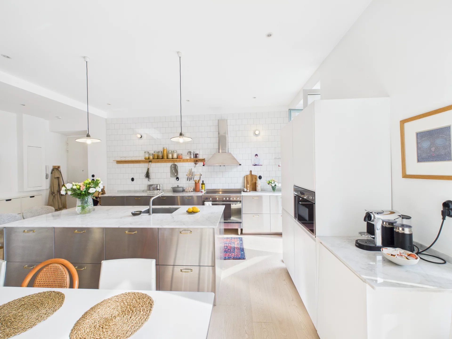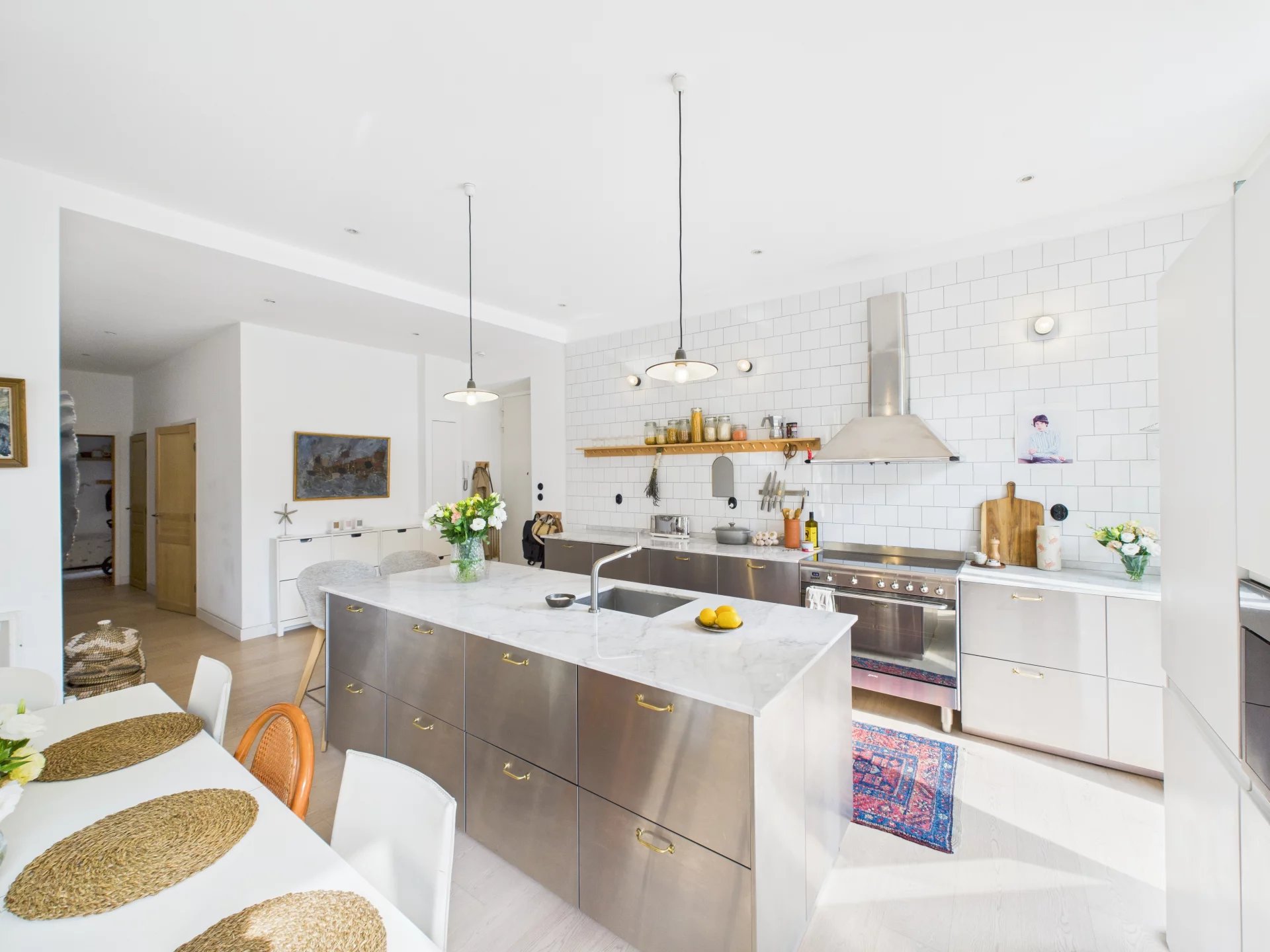 As you step inside, you’re welcomed into a spacious living room seamlessly connected to a fully equipped open-plan kitchen with a kitchen island, offering ample space for cooking and entertaining. The space opens onto a balcony.