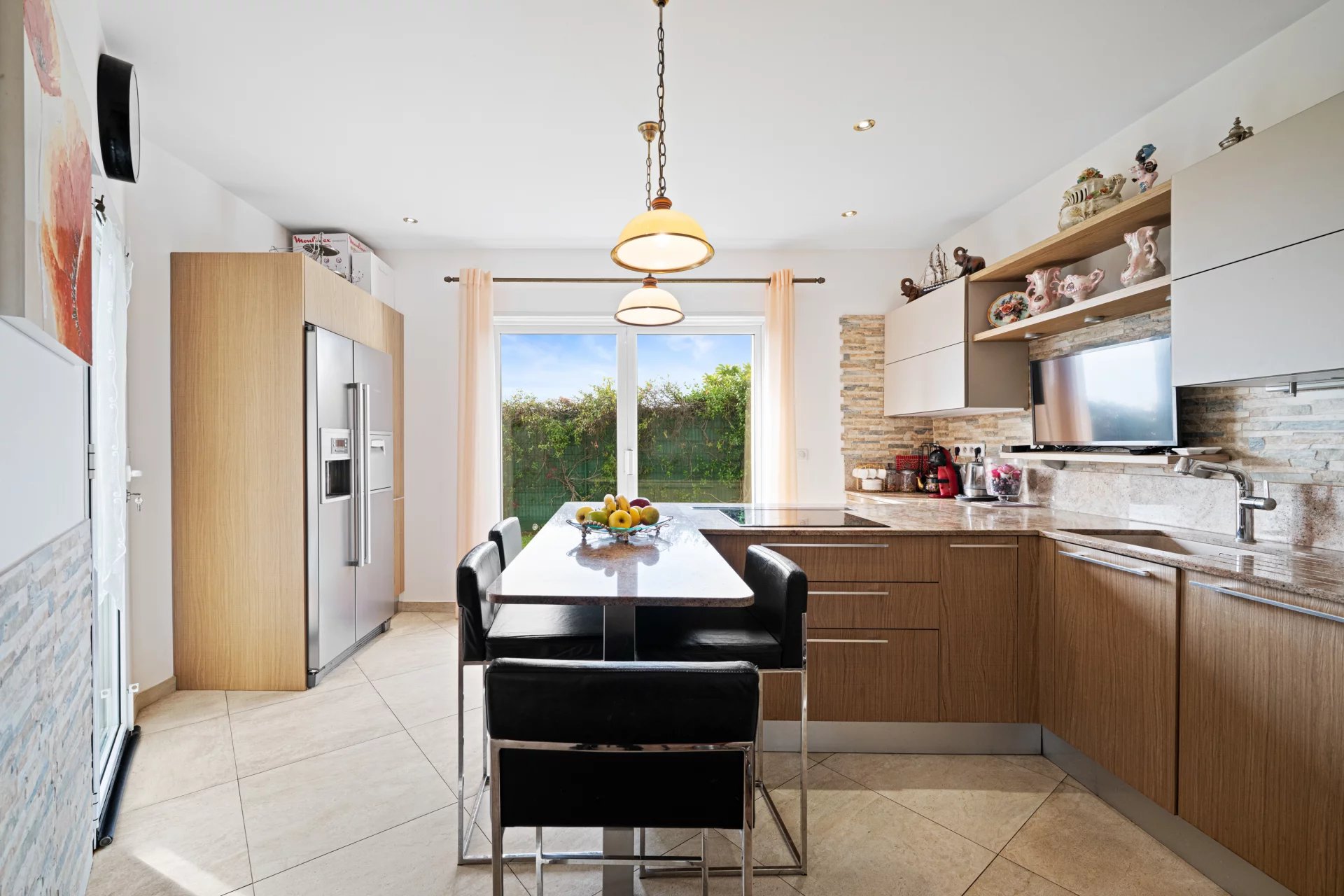Built in 2013 with carefully selected materials, this 303 m2 villa offers harmonious volumes, highlighted by large bay windows that naturally extend the interior spaces outdoors. The living room and kitchen, designed in a modern and refined style, form a welcoming and comfortable living area.