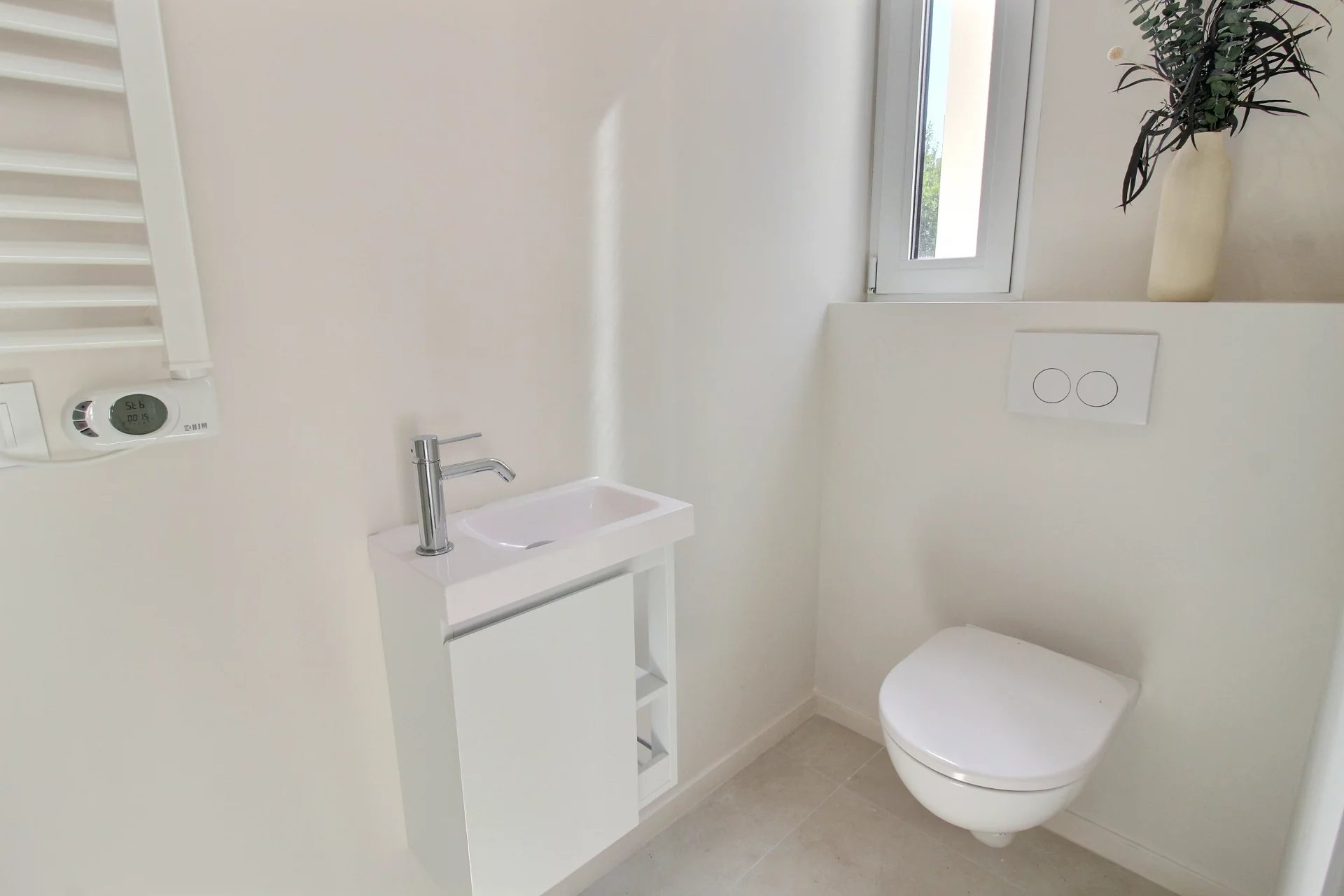 On the ground floor: a beautiful living area with an integrated kitchen and a bright living room opening onto the terrace and garden. This level also includes guest toilets as well as a bathroom with a shower and bathtub.