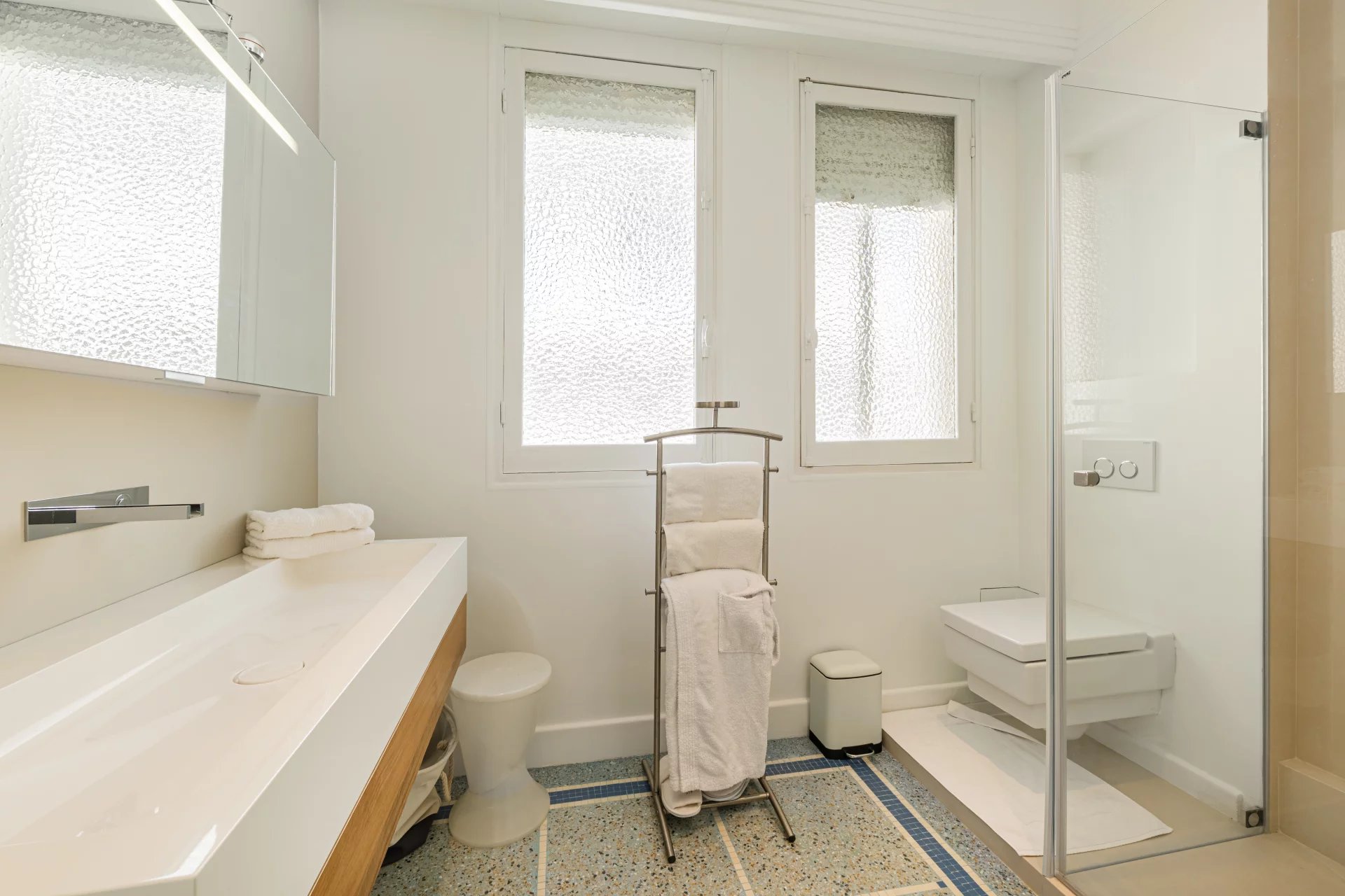 The garden level hosts a second living area with an open-plan kitchen, three bedrooms, and two bathrooms with toilets. With its independent entrance, this space is ideal for guests, or as a self-contained apartment.