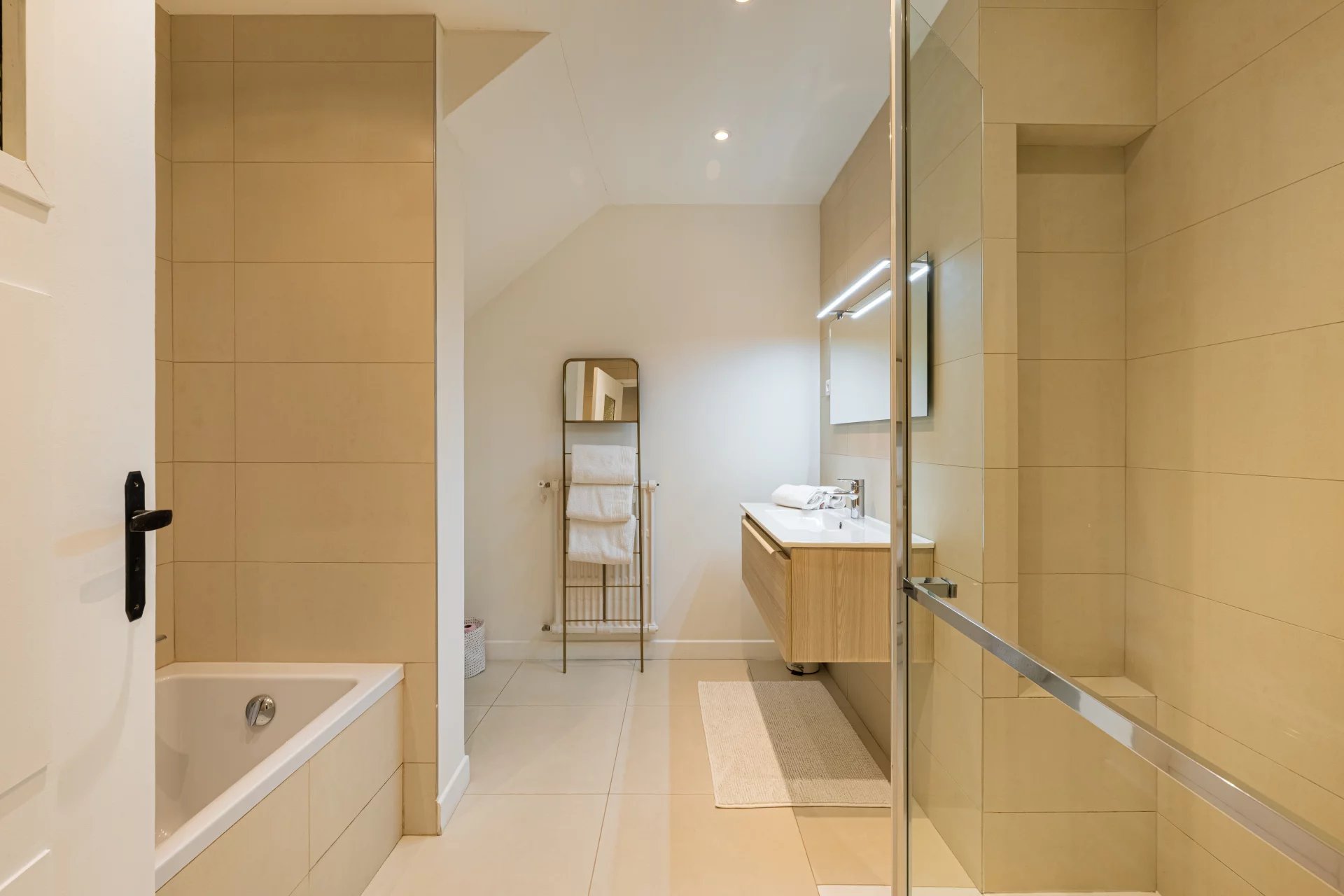 From the elegant entrance hall, a striking staircase leads to the upper level dedicated to the sleeping quarters. This floor consists of four bedrooms, including a superb principal suite with walk-in wardrobe and en-suite bathroom, complemented by two additional shower rooms and a guest toilet. A sunlit terrace completes this level, creating a natural extension to the outdoors.