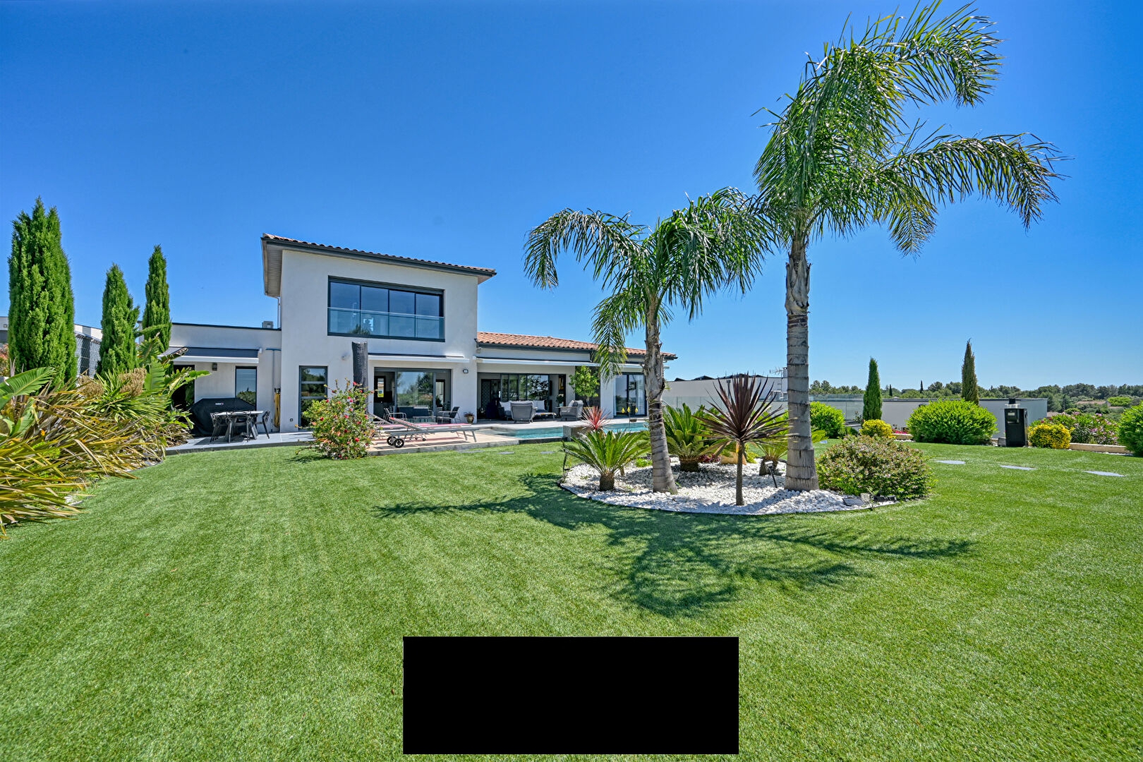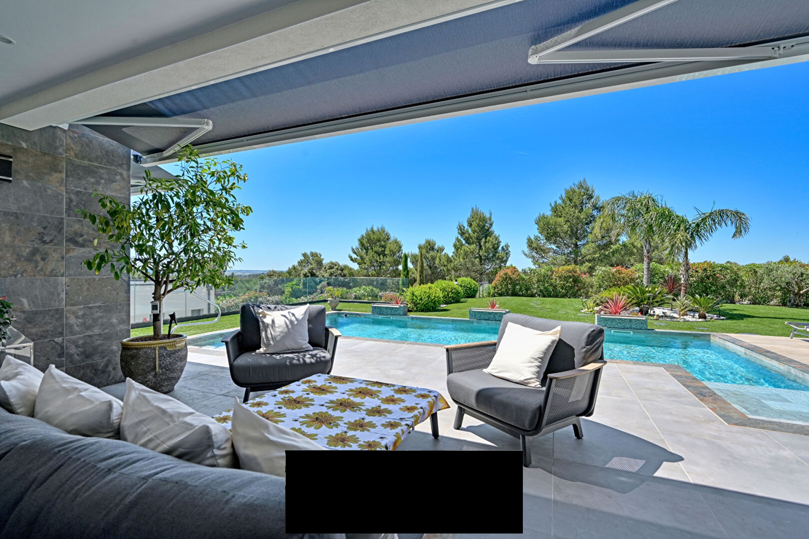 To the south, a large terrace features a 9 x 5.5 m saltwater swimming pool, fully tiled and seamlessly integrated into the beautiful garden. An exceptional place, designed to savor every moment, from convivial gatherings and relaxation to long evenings under the stars.
