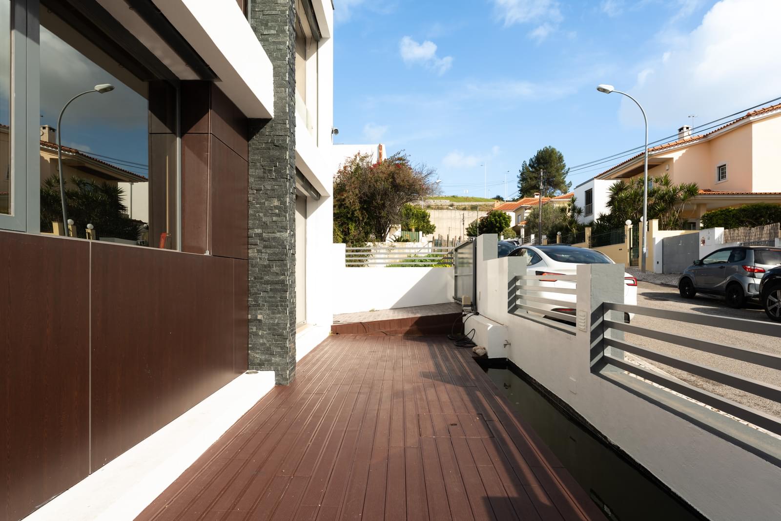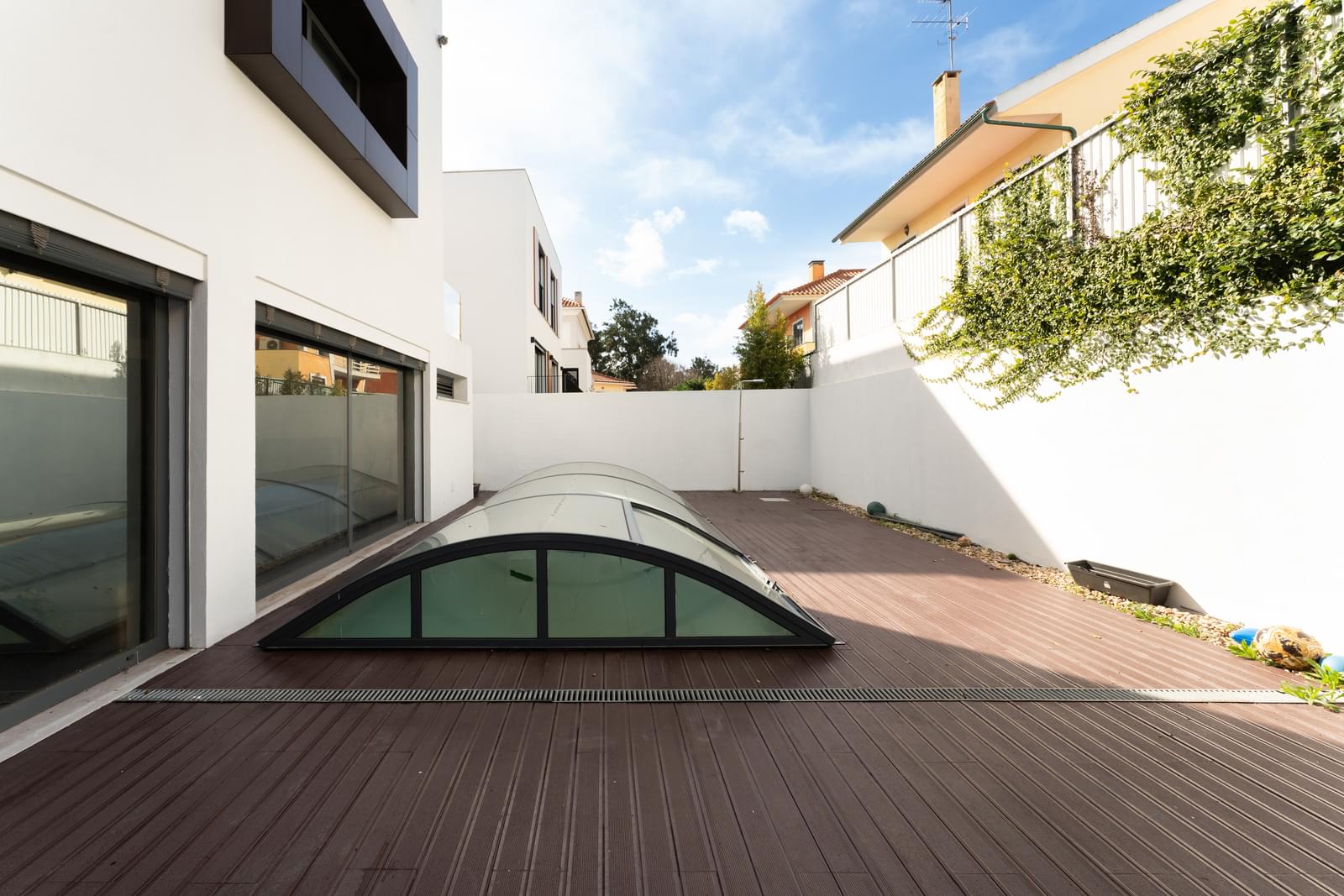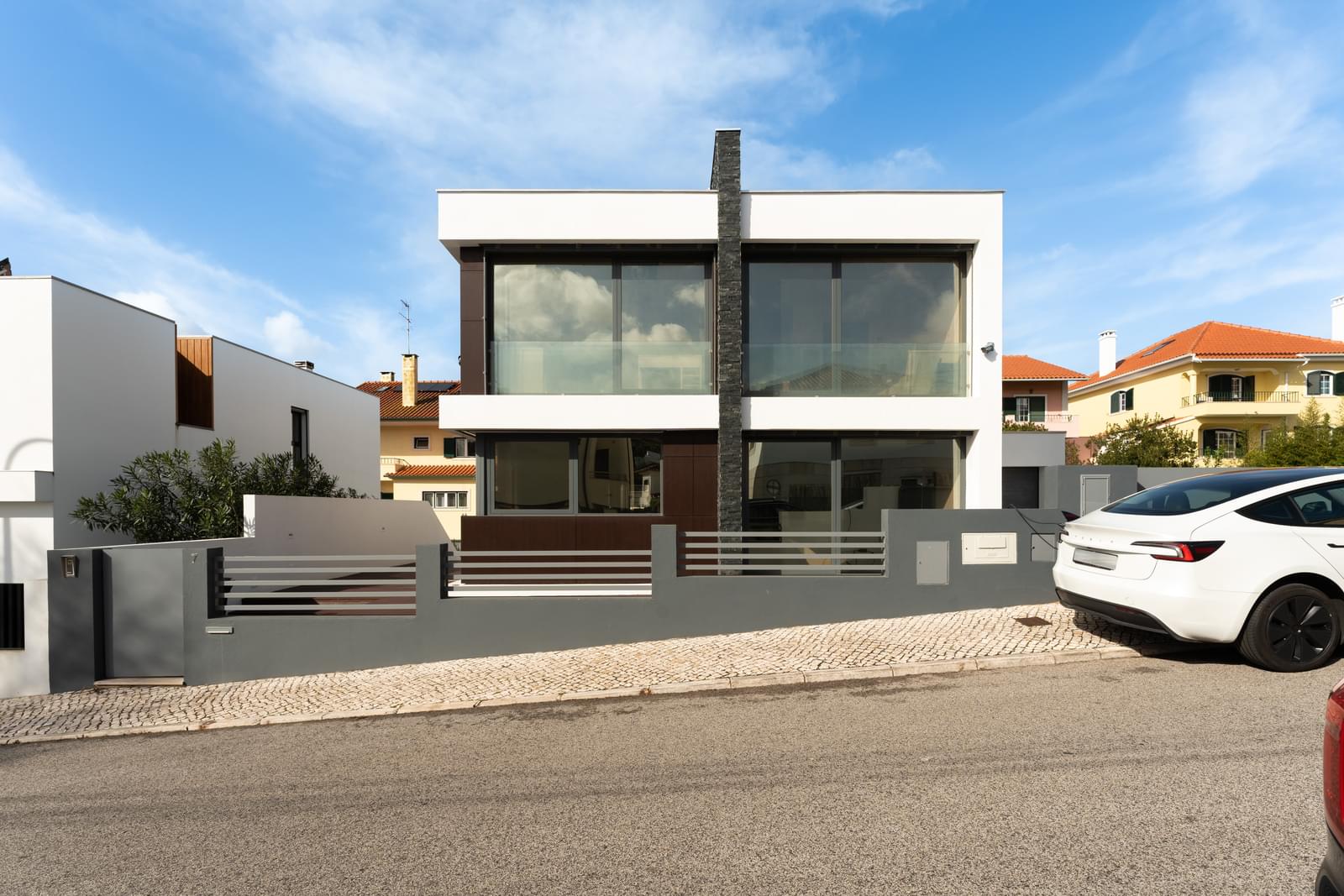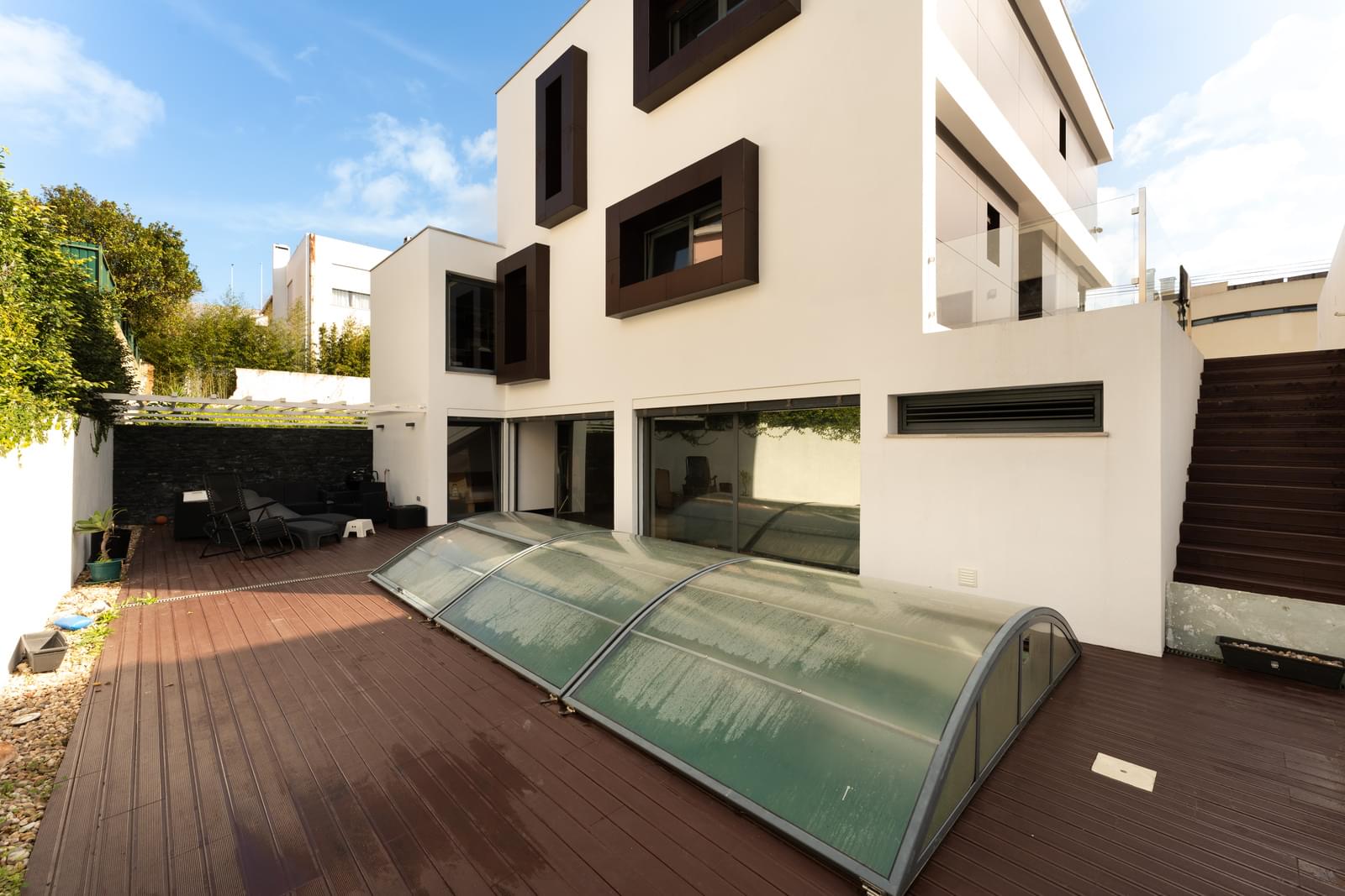 T4 contemporary-style detached villa with a saltwater pool, set on a 299 m² plot with a total construction area of 297 m², located in Murganhal, a residential neighborhood in Caxias, just 15 minutes from Lisbon and with excellent access to the A5 and Avenida Marginal.