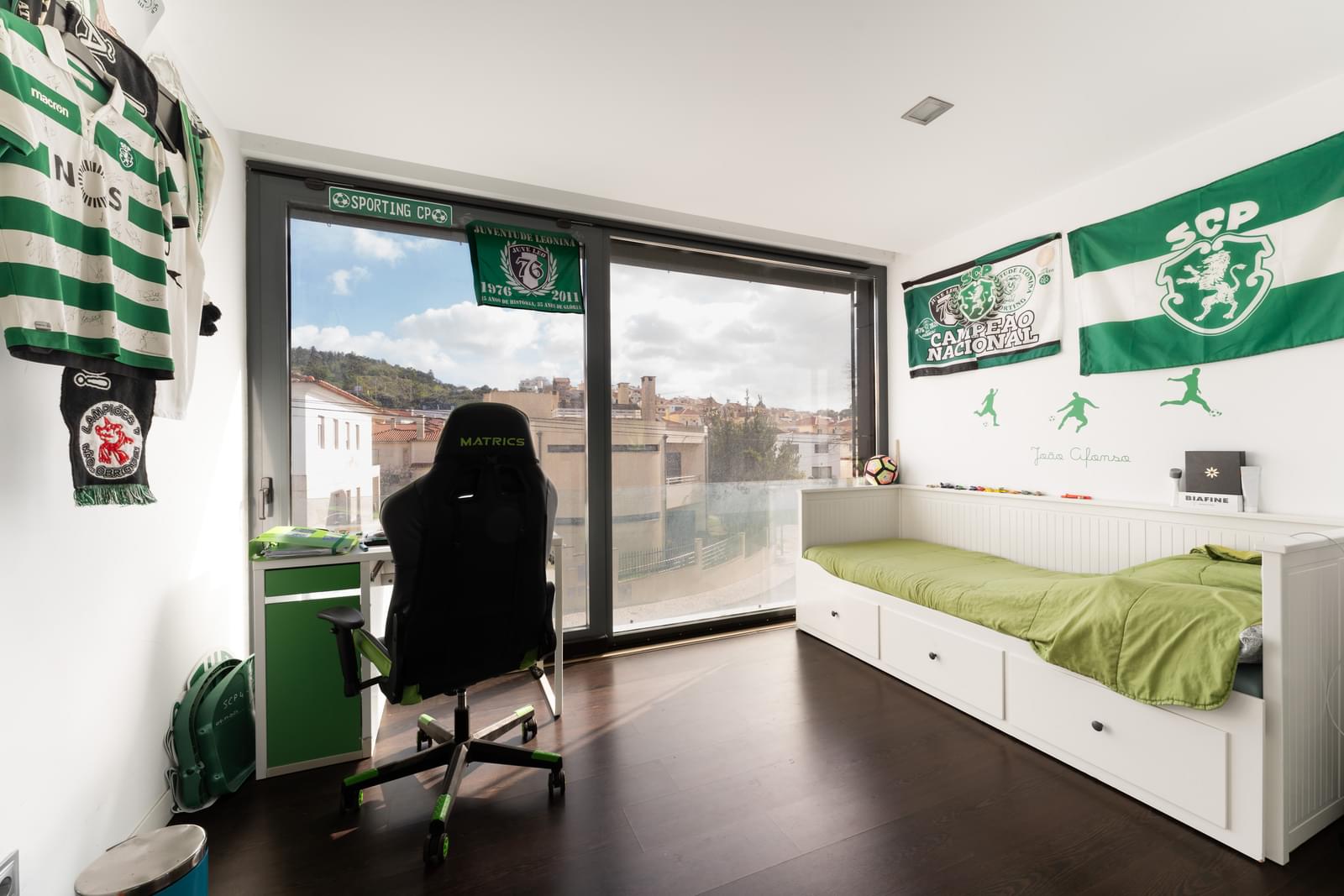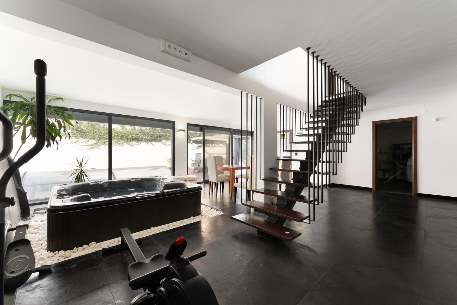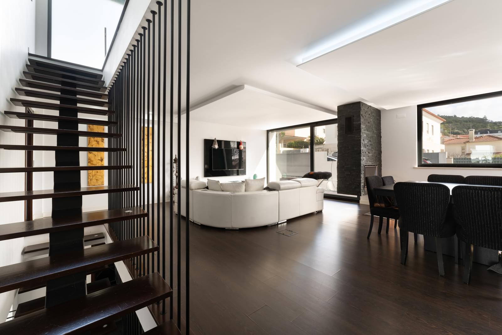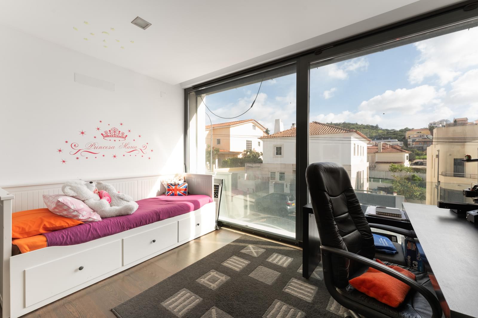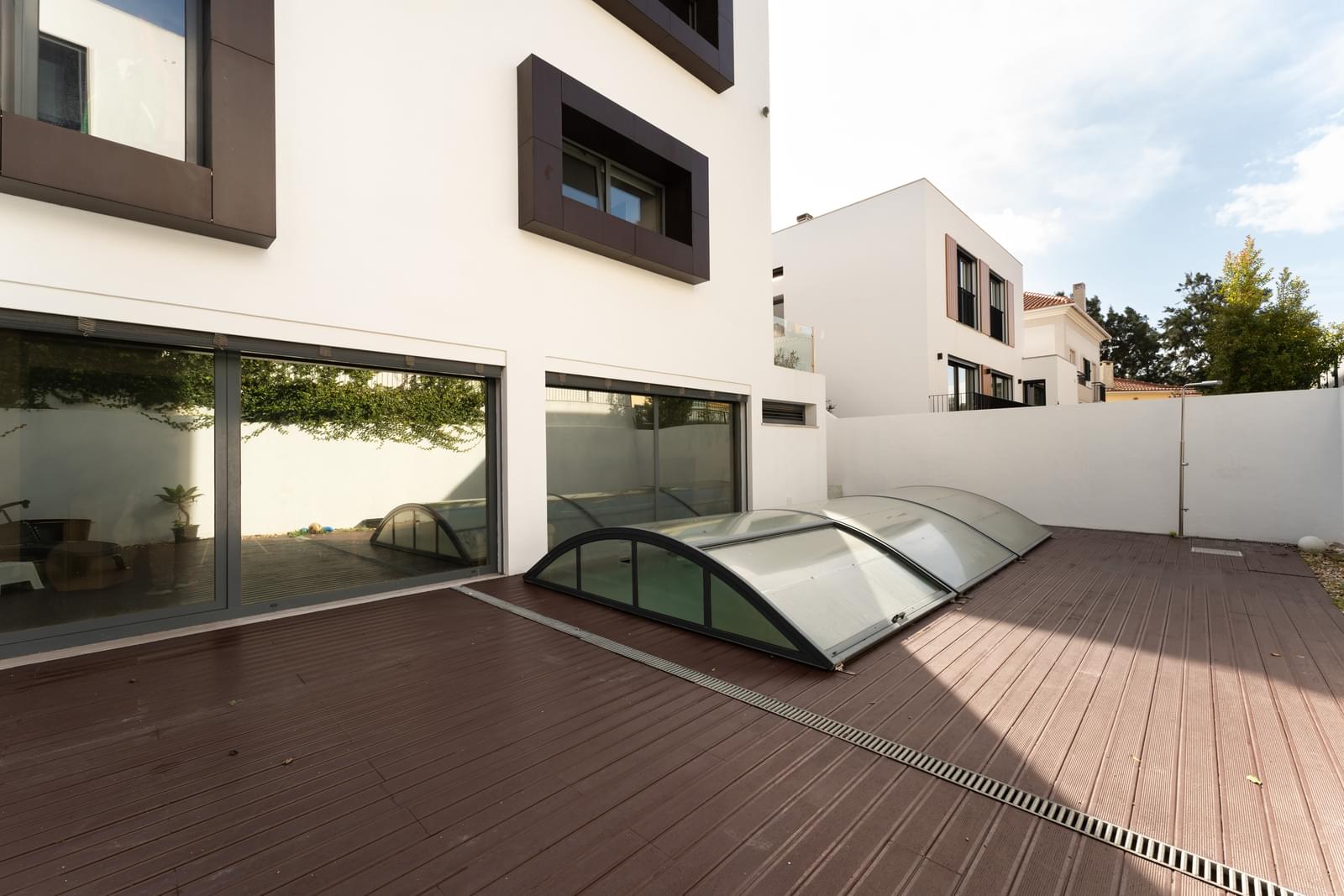 T4 contemporary-style detached villa with a saltwater pool, set on a 299 m² plot with a total construction area of 297 m², located in Murganhal, a residential neighborhood in Caxias, just 15 minutes from Lisbon and with excellent access to the A5 and Avenida Marginal.