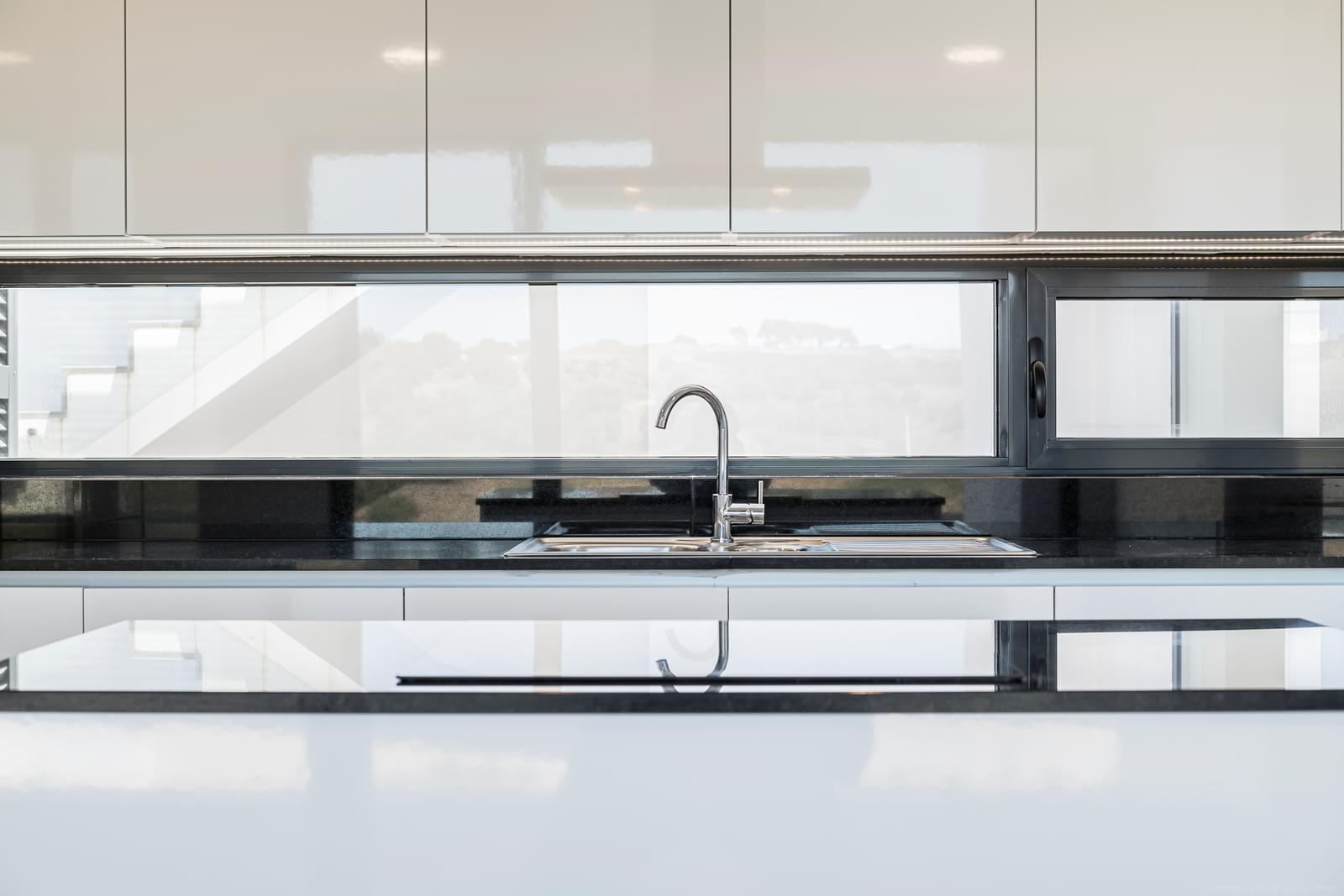 Its large glass openings, double-height ceiling in the living area, and west-facing orientation provide exceptional natural light and unobstructed countryside views.