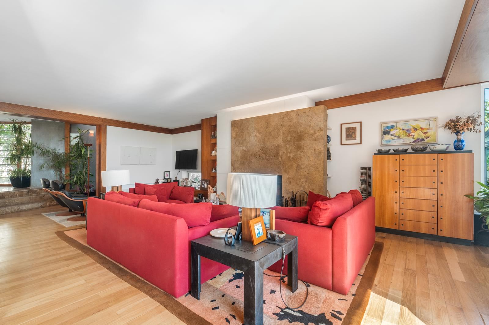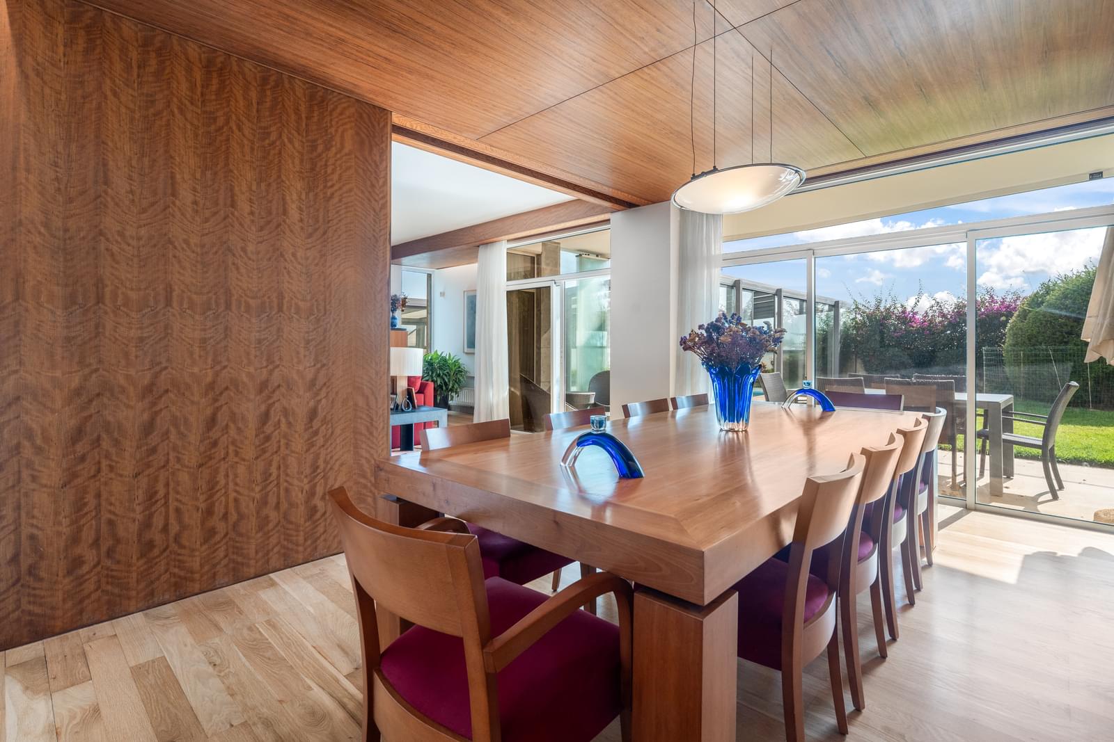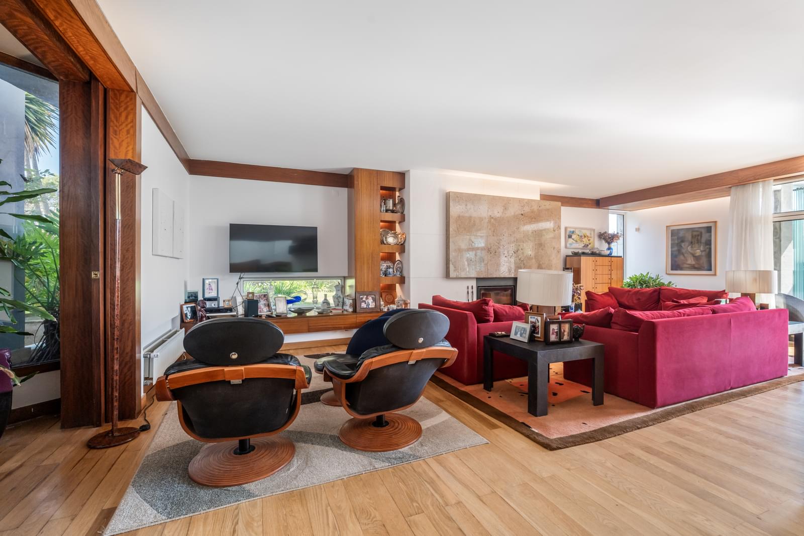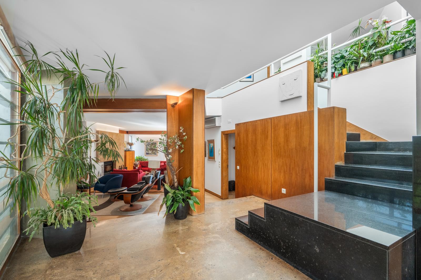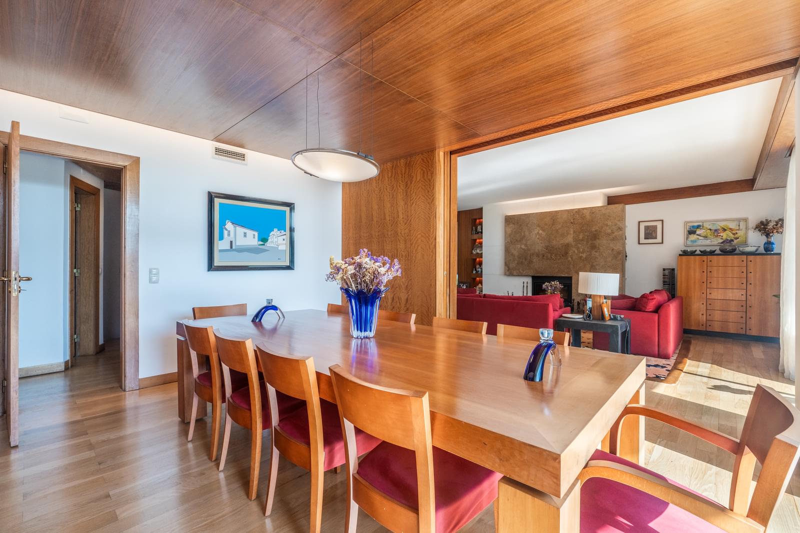 • Living and dining room with 60 m², travertine fireplace, and sliding wooden door separating the spaces;