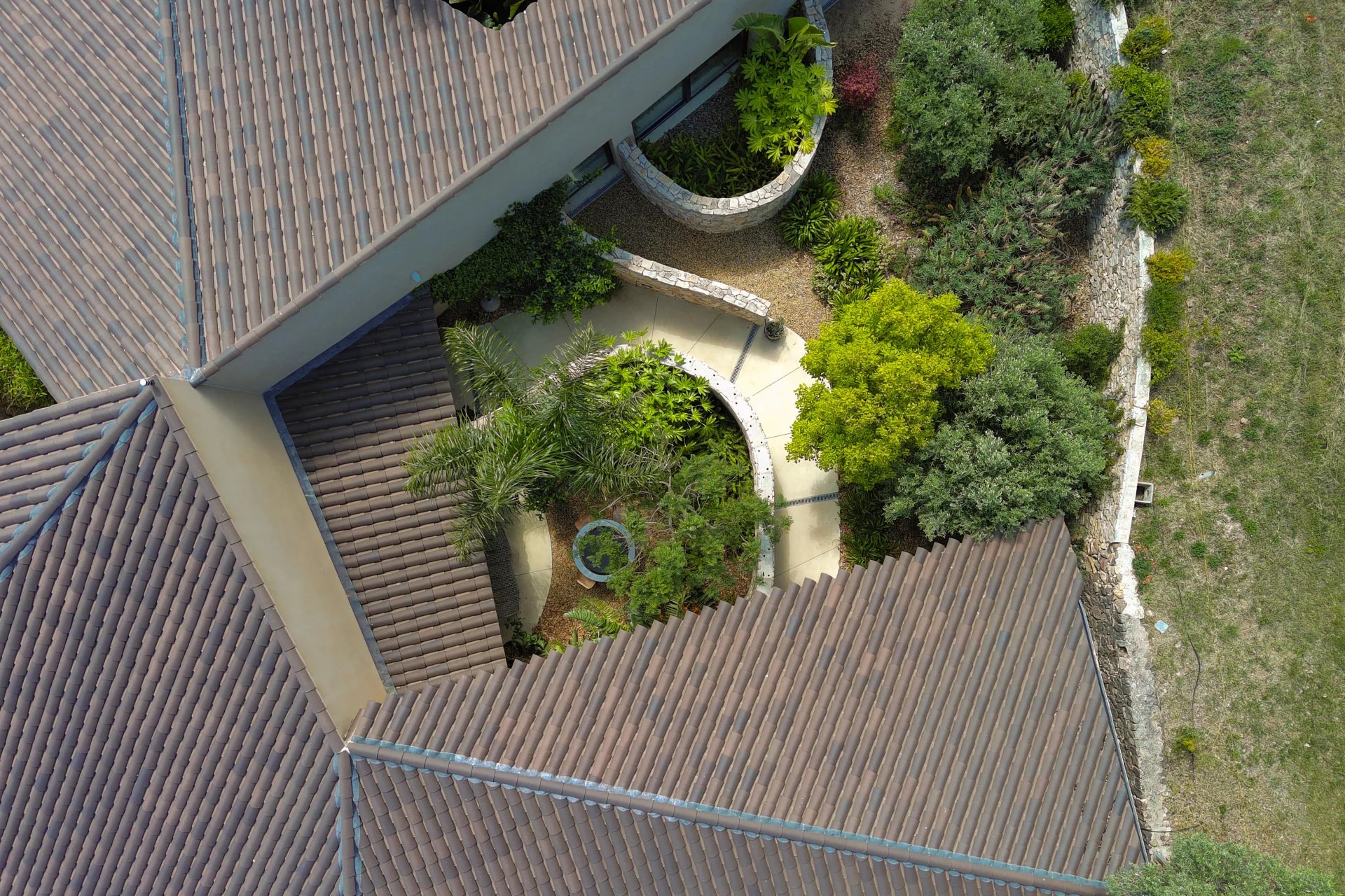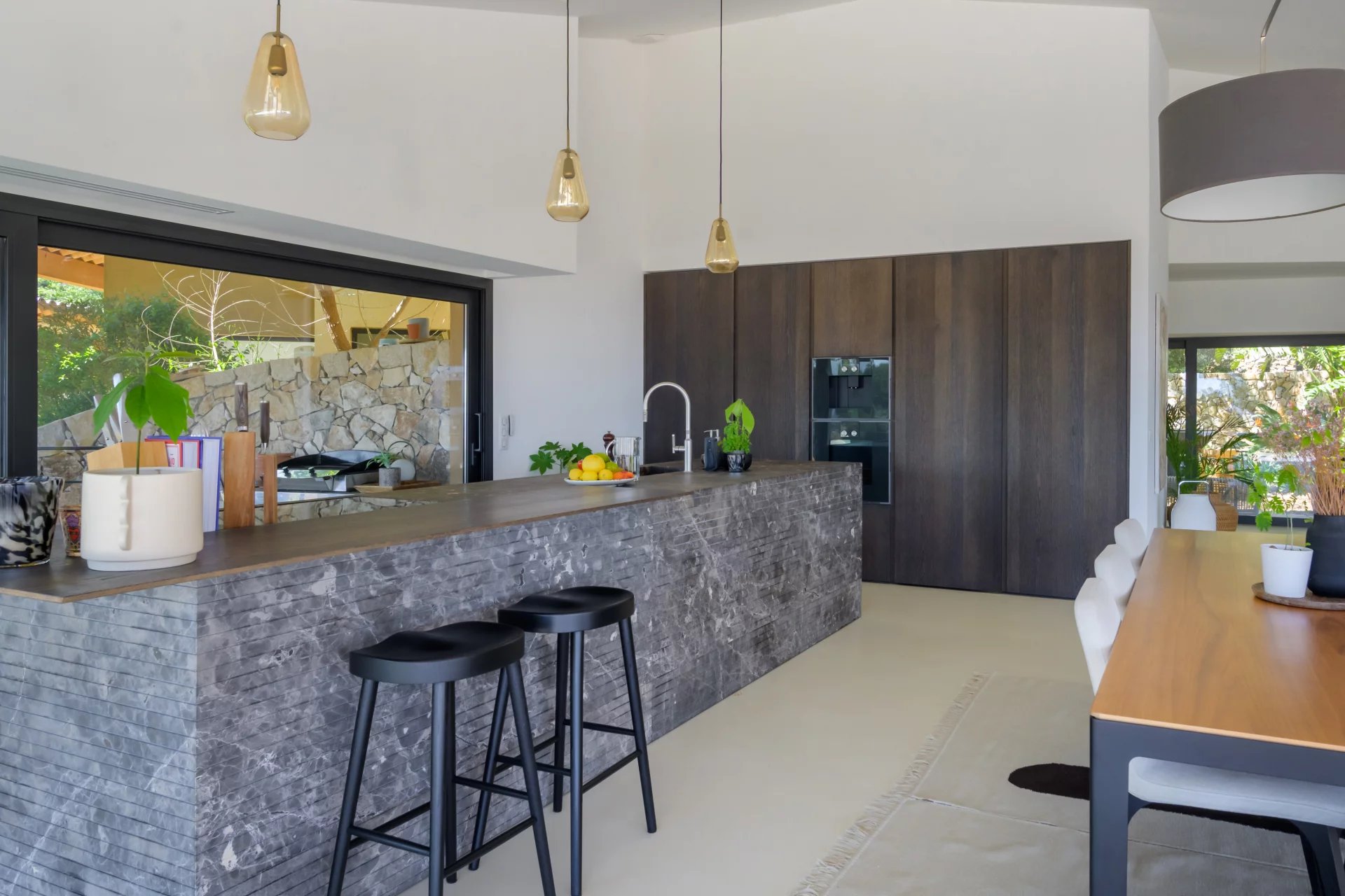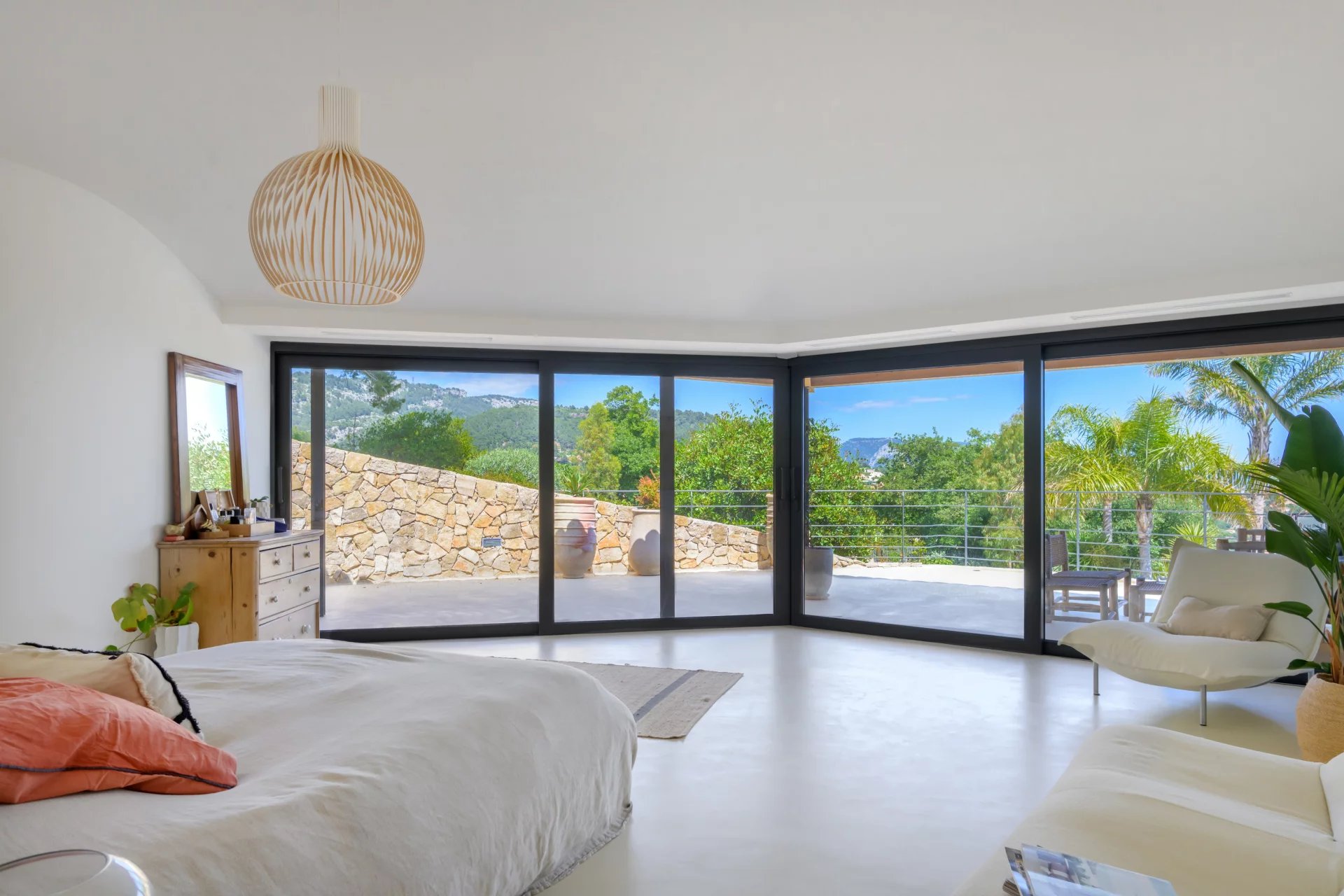 Every detail of this unique home is infused with the architectural philosophy of harmony with nature. At the heart of the house, a central patio brings in natural light and creates fluid transitions between the interior and the six expansive terraces that extend the living areas.