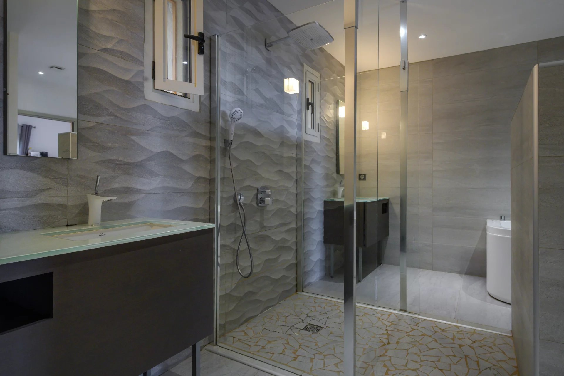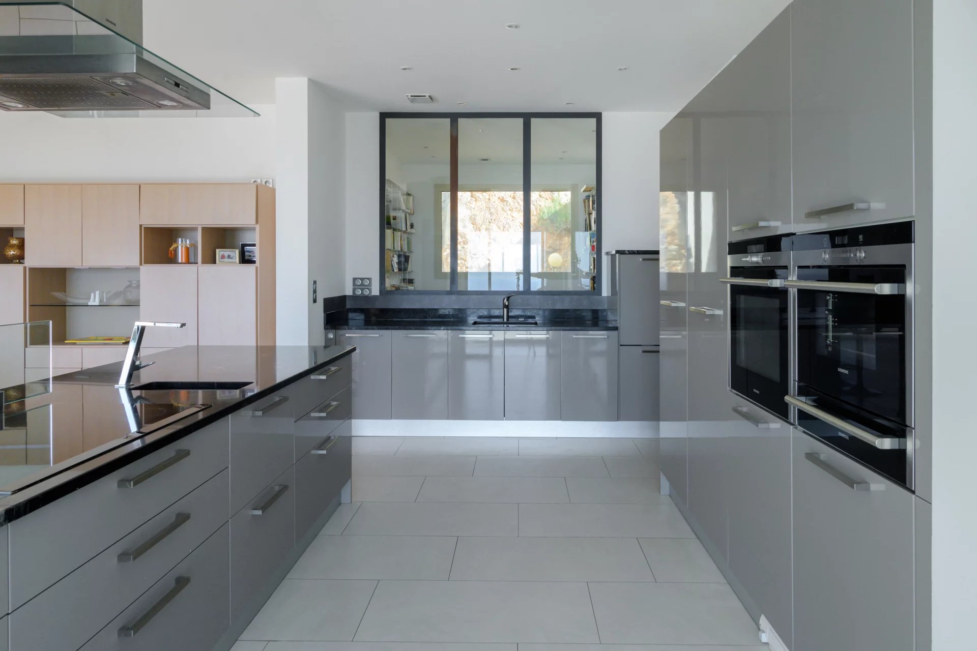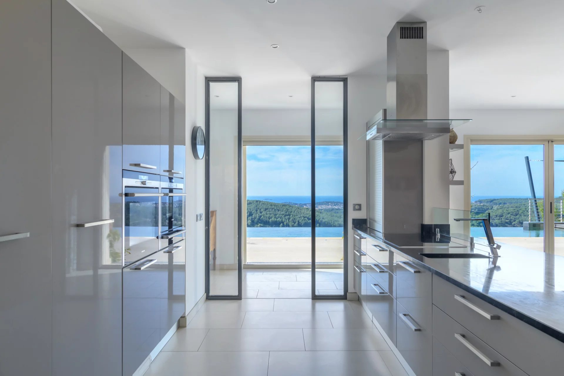 The sleek, fully equipped open-plan kitchen is designed for both functionality and style, making it ideal for culinary enthusiasts and entertaining guests. Throughout the home, contemporary finishes, minimalist design, and high-end materials reflect the elegance and sophistication of modern Provencal living.
