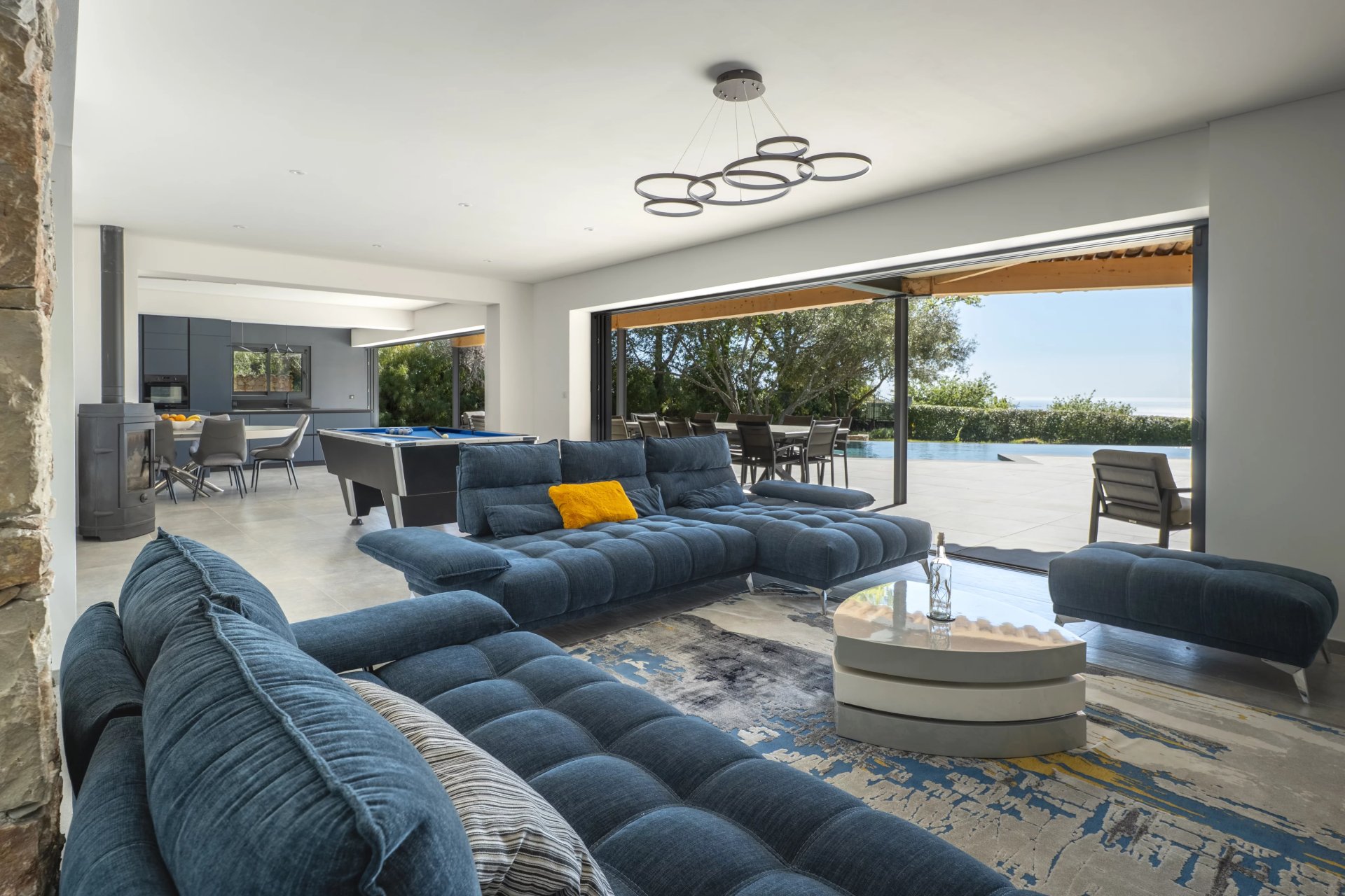 The main living room flows effortlessly into the infinity pool, creating a unique indoor-outdoor lifestyle perfectly oriented towards the Mediterranean.