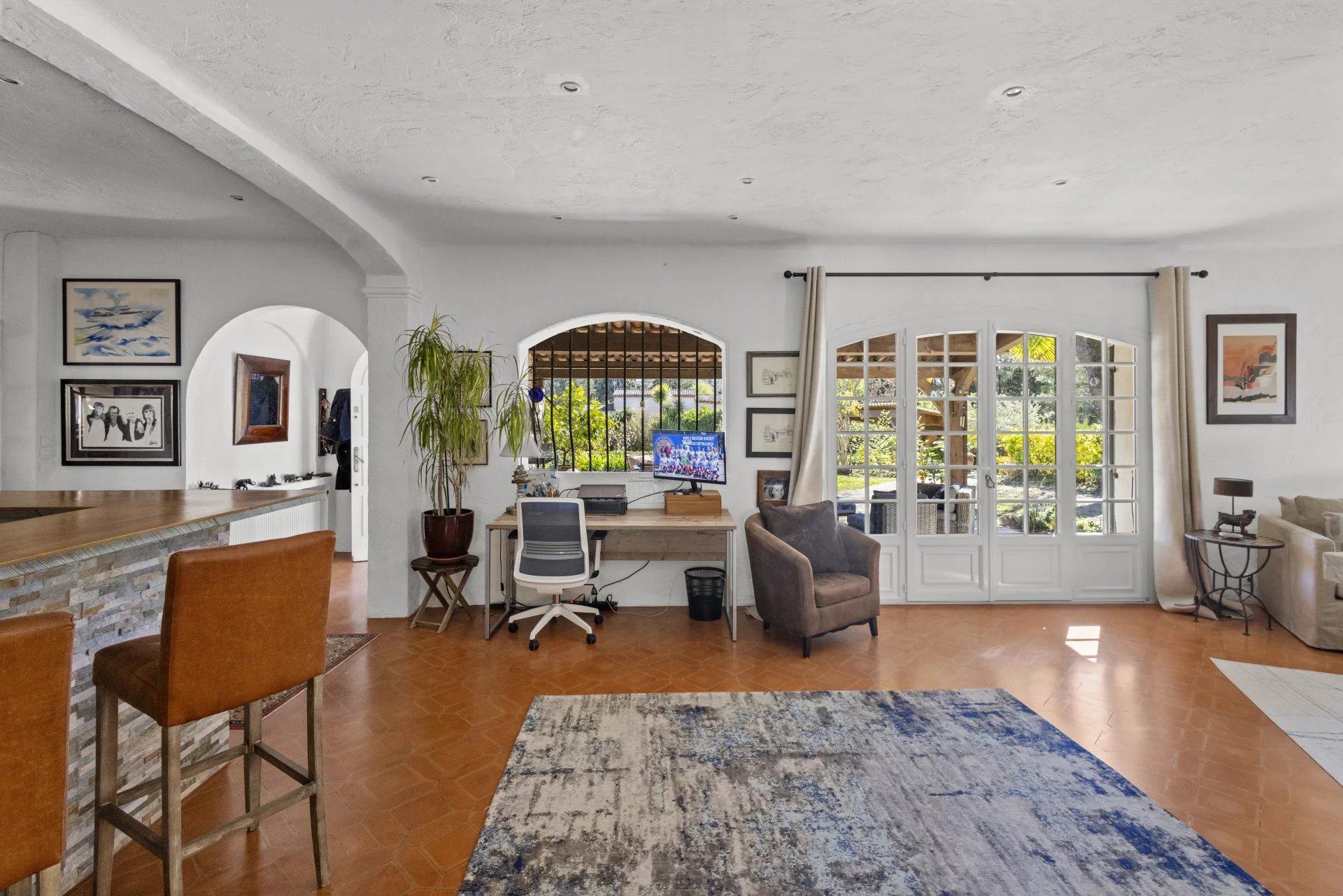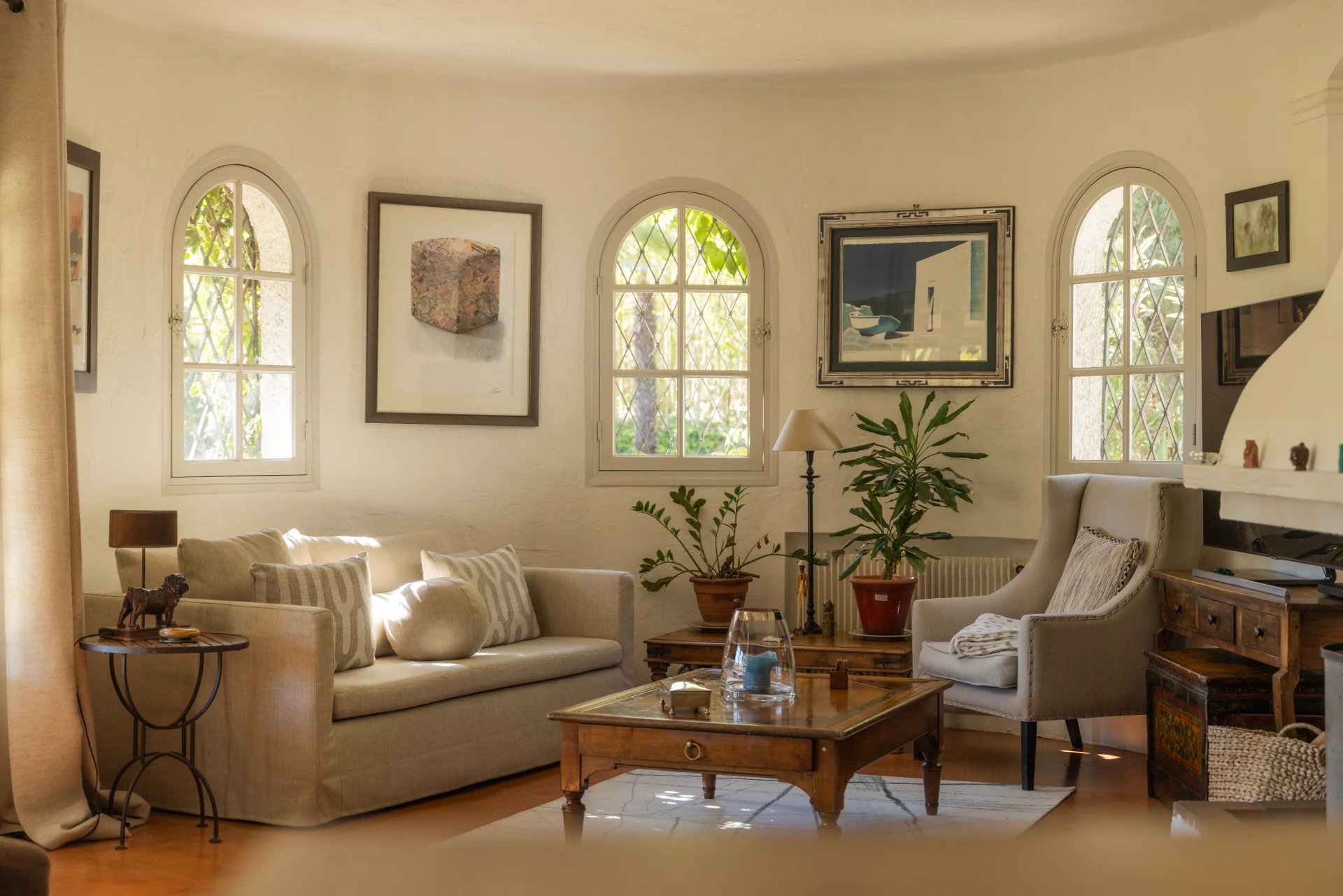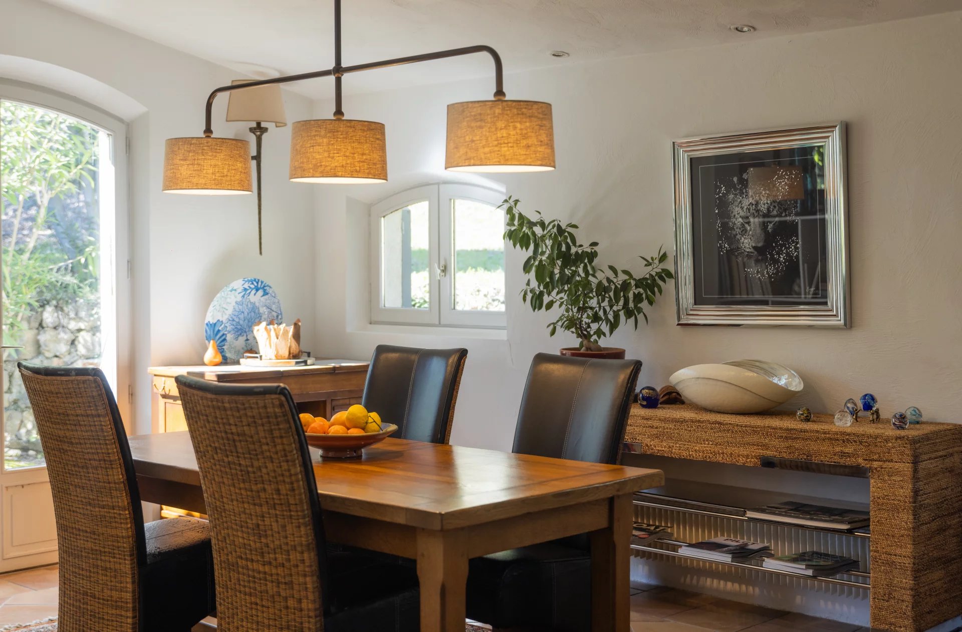 Nestled amidst lush greenery, this single-story villa, bathed in sunlight, offers a spacious and bright living space.