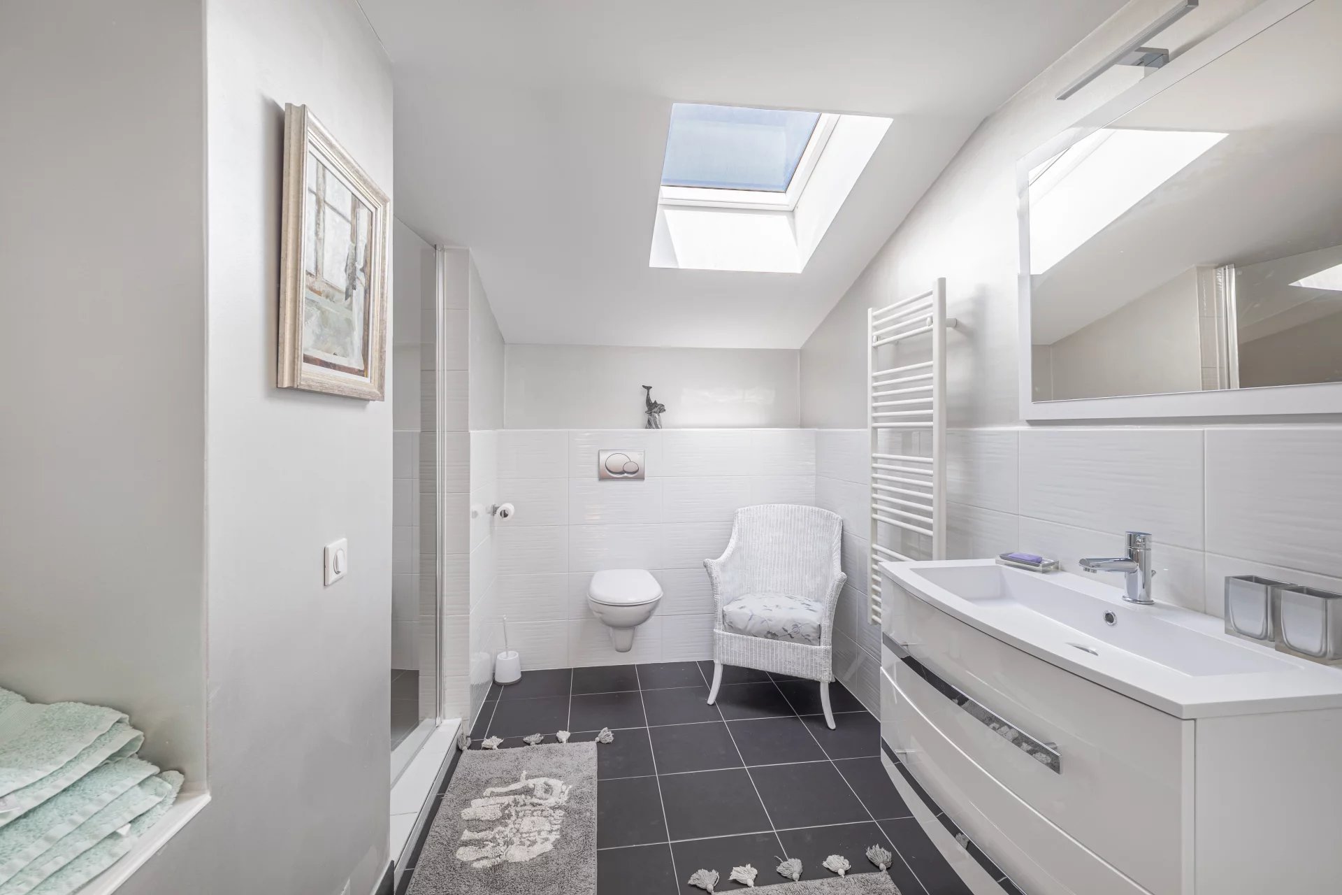 Upstairs, two additional en-suite bedrooms provide privacy, including one with access to a spacious rooftop terrace that captures west-facing views and the evening sun. A large loft storage space adds extra practicality.