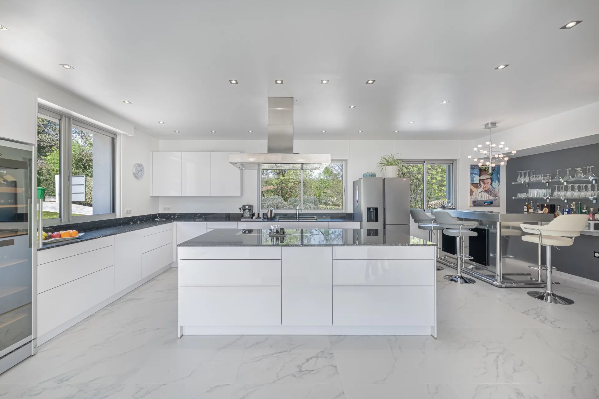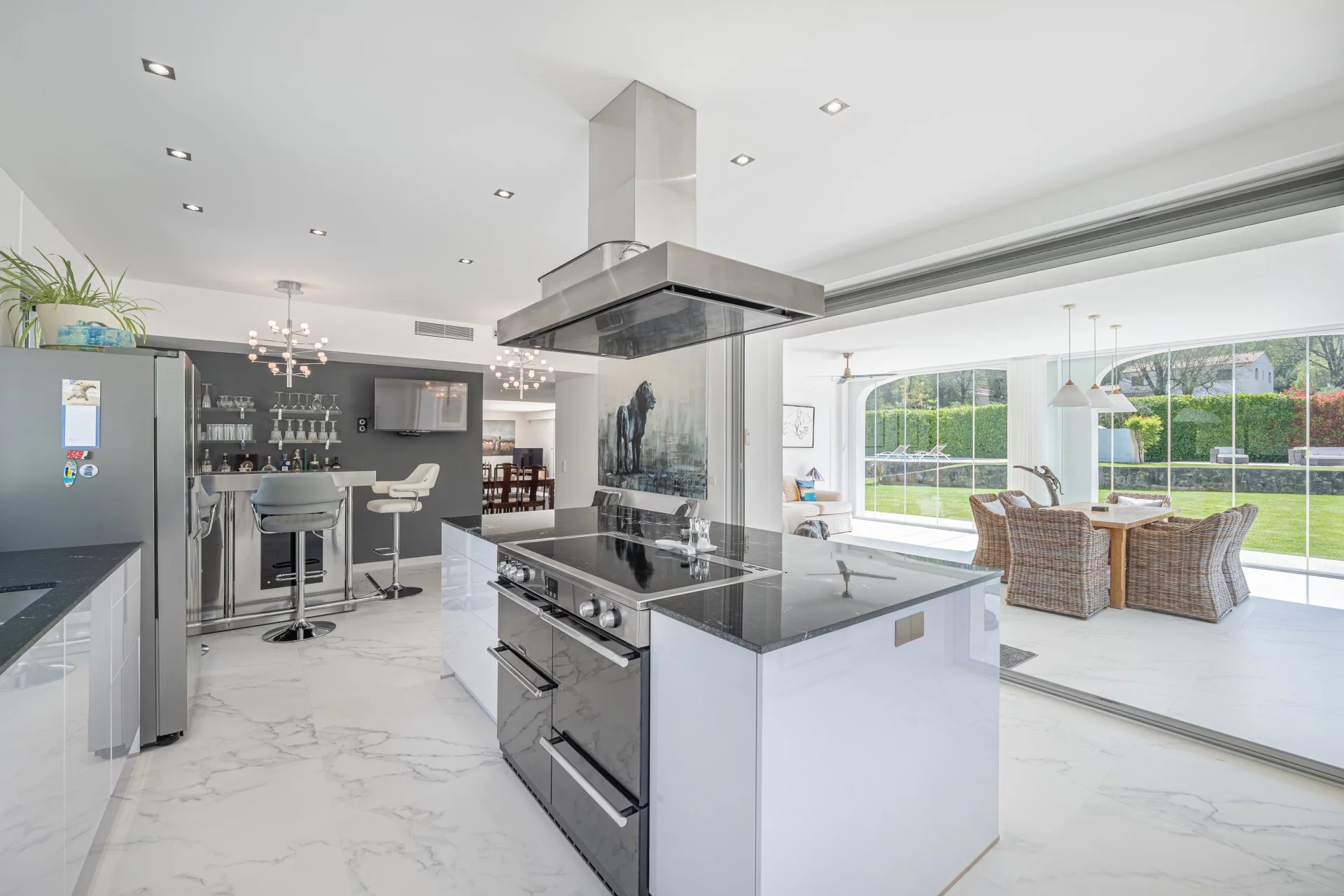 A bright and inviting enclosed terrace welcomes you, creating a seamless flow between indoor and outdoor living. This space connects effortlessly to a modern, fully-equipped kitchen featuring ample storage, a generous island, and a stylish bar perfect for cooking enthusiasts and entertainers alike. The open-plan design leads into the dining area and a spacious living room with a fireplace, wide windows, and stunning views over the pool and level garden, enhancing the villa’s light and airy ambiance.