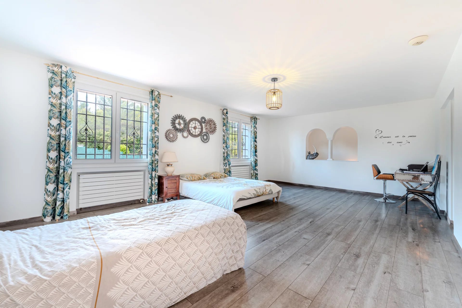 In a peaceful, sought-after setting, charming, spacious villa set in 2,951 m2 fenced beautifully landscaped grounds, featuring several terraces, a swimming pool, a double garage with mezzanine and a pergola.