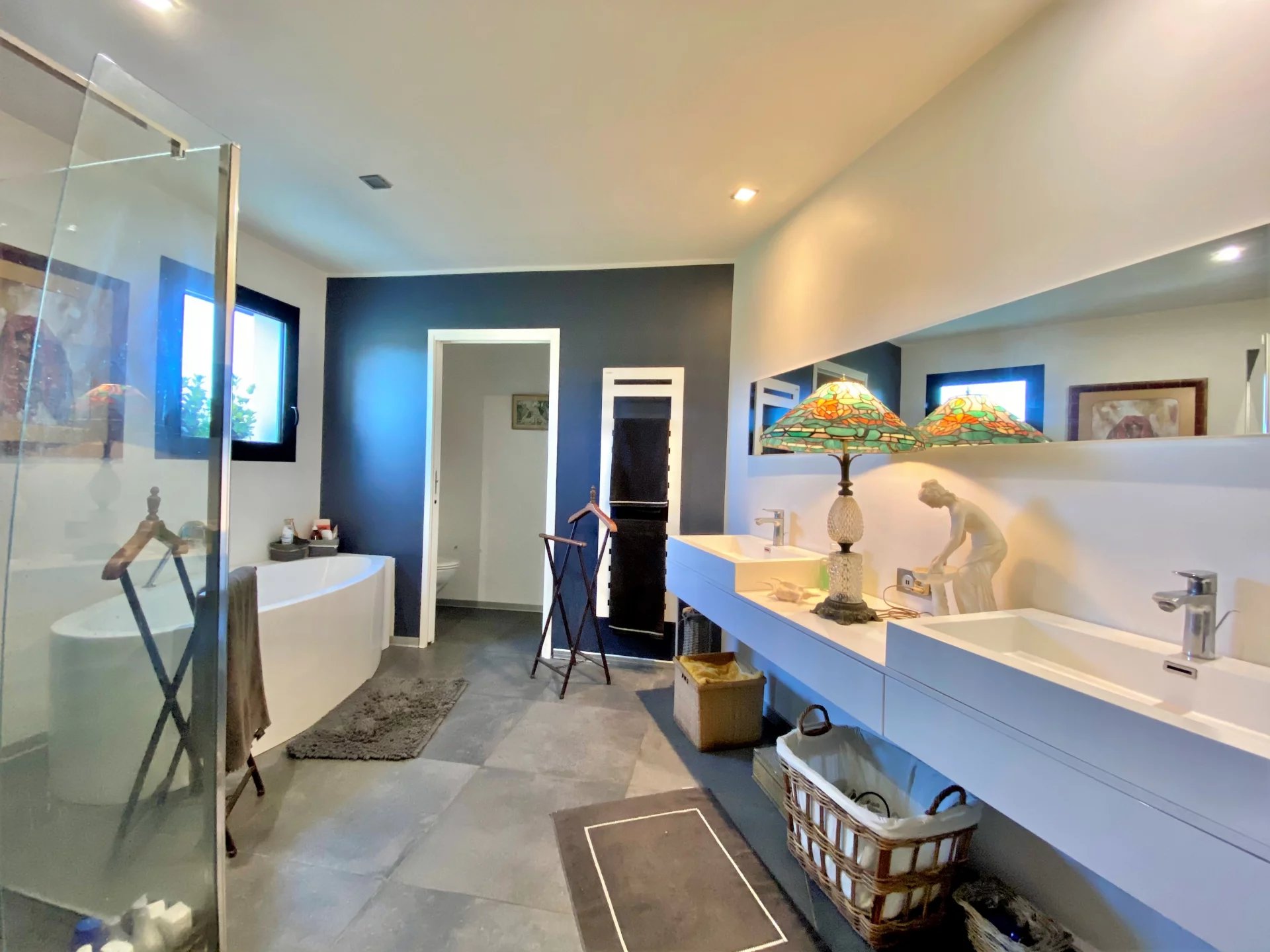 Accommodation: Entrance on a driveway with parking, garage. Hall with guest toilet, living room opening on a terrace extended by the garden. Fully equipped kitchen with central island and dining area. Three en-suite bedrooms with bathroom or showers. Mezzanine office. The property has underfloor cooling/heating.