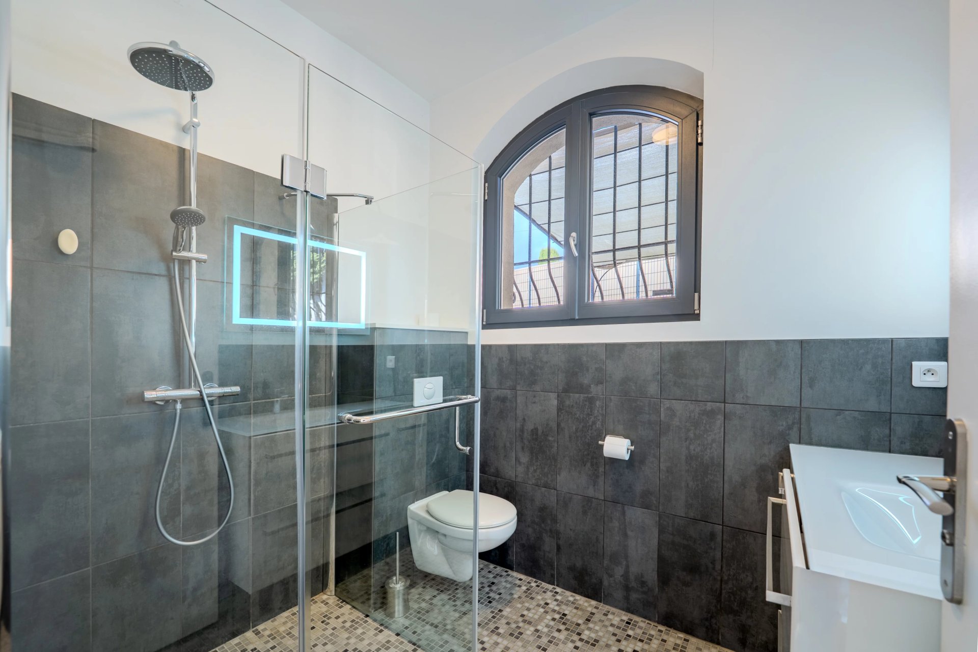 On the main level, the villa offers an entrance hall, a 48m2 living room, a 23m2 independent kitchen, two en suite bedrooms and a third bedroom with an independent shower room.