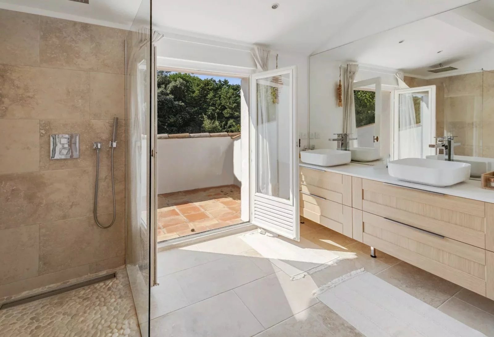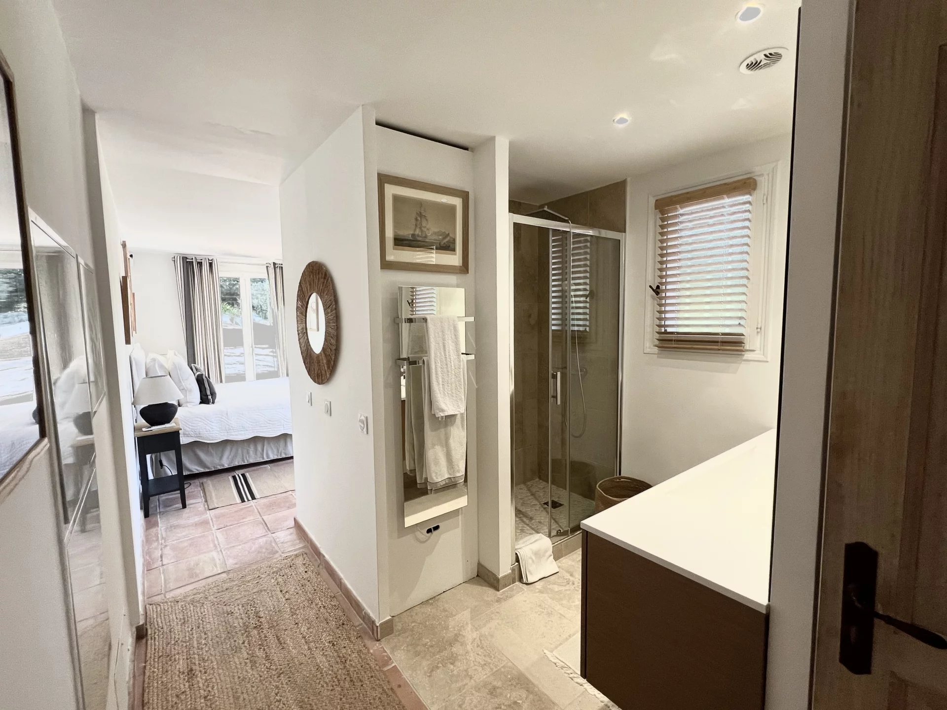 Surrounded by Umbrella Pines, this Provencal styled villa with modern comforts and stylish decor offer accommodation which includes on its ground level, a large living room opening onto a terrace and large covered terrace, an equipped kitchen, a bedroom and its bathroom.