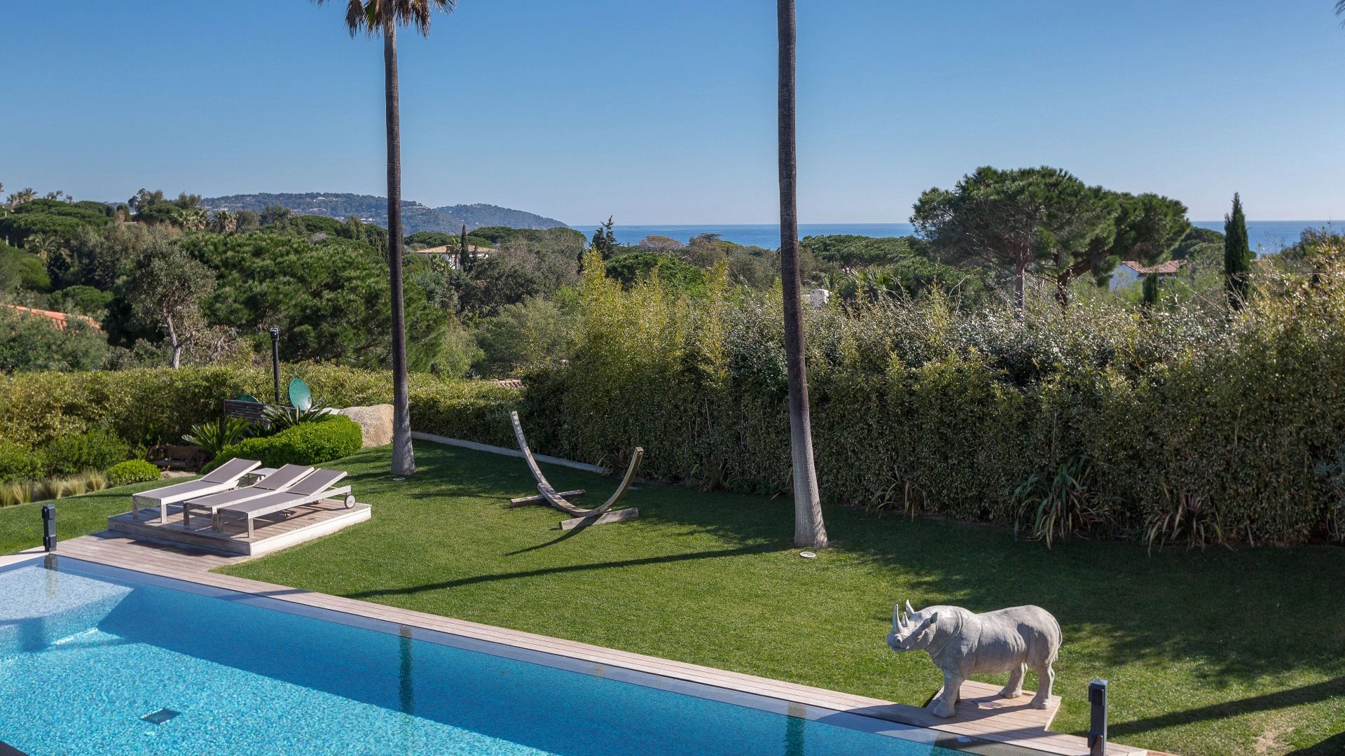 In one of the most sought-after locations on the Saint-Tropez peninsula, close to the iconic beaches of Pampelonne, this exceptional contemporary property is set in the heart of a landscaped garden of approximately 1,700 m2, enhanced by an elegant sea view.