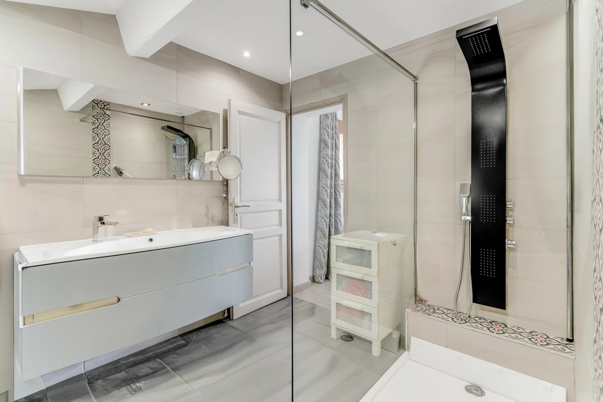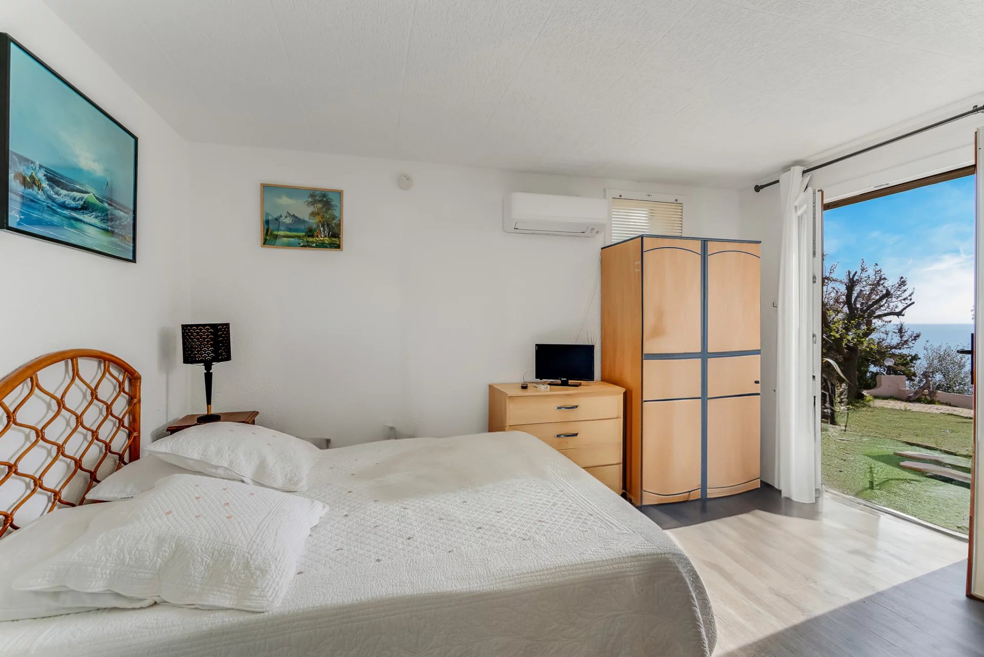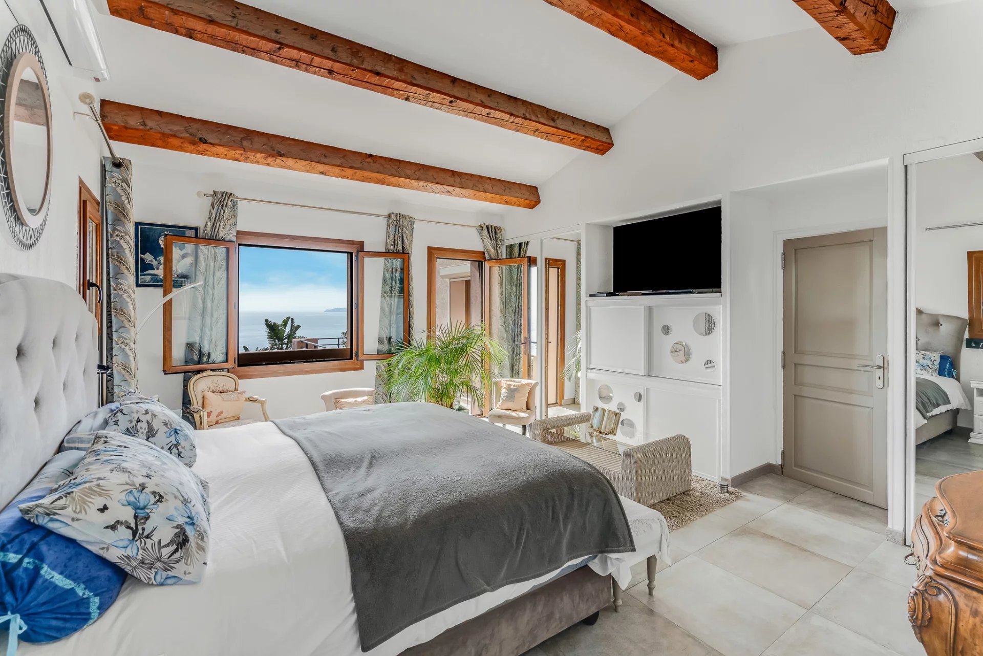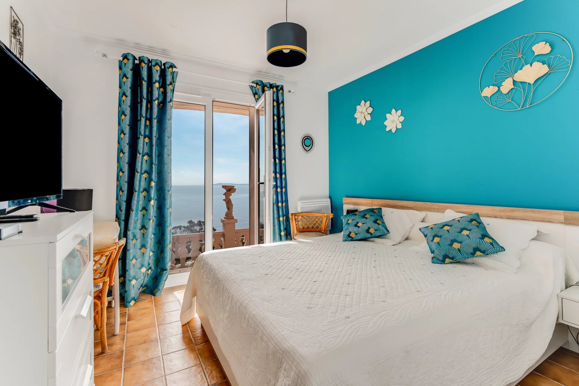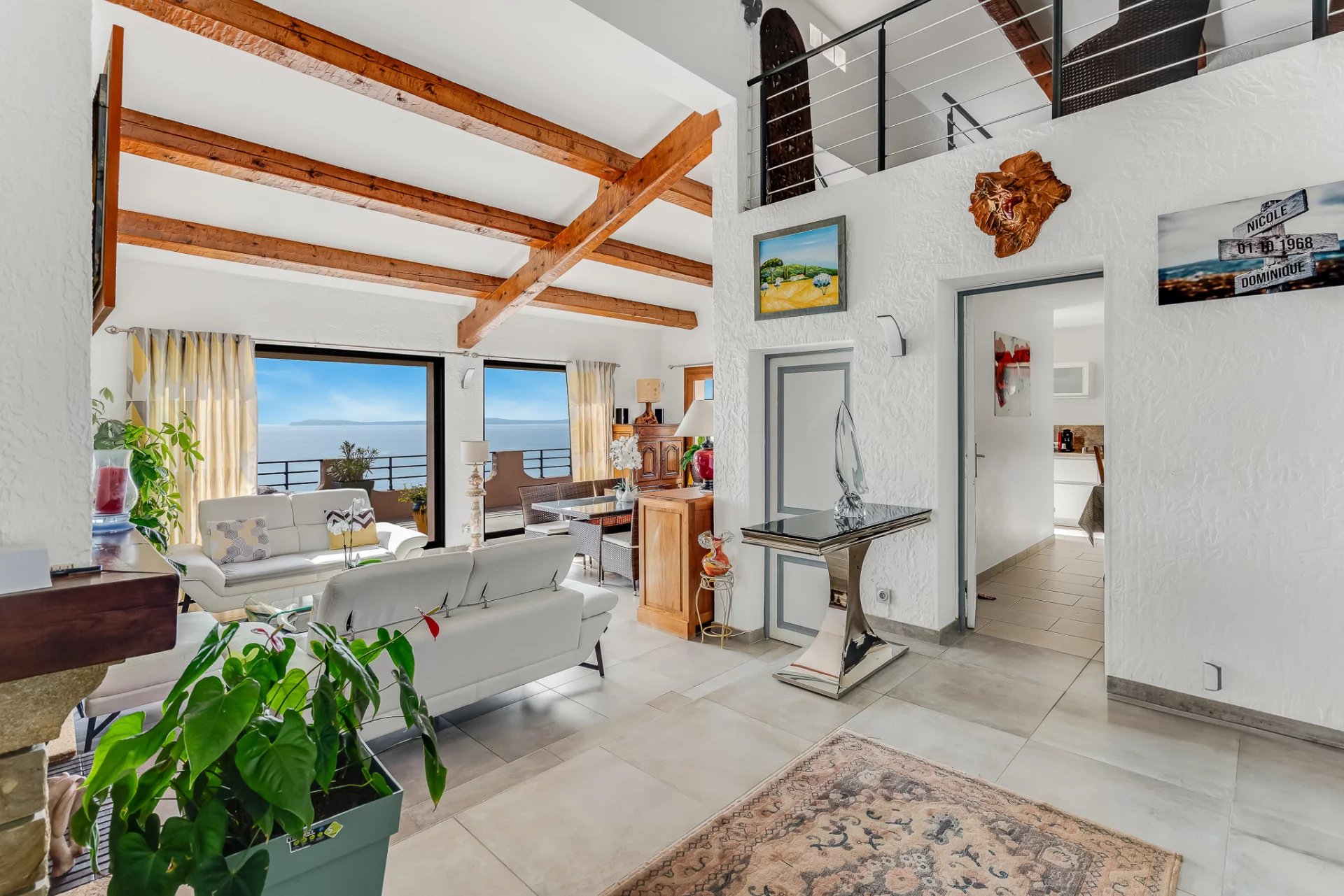 The property features four sea-view bedrooms and three bathrooms. The living room with fireplace and the fully equipped kitchen open onto a spacious terrace overlooking the sea and offering beautiful views of the Golden Islands.
