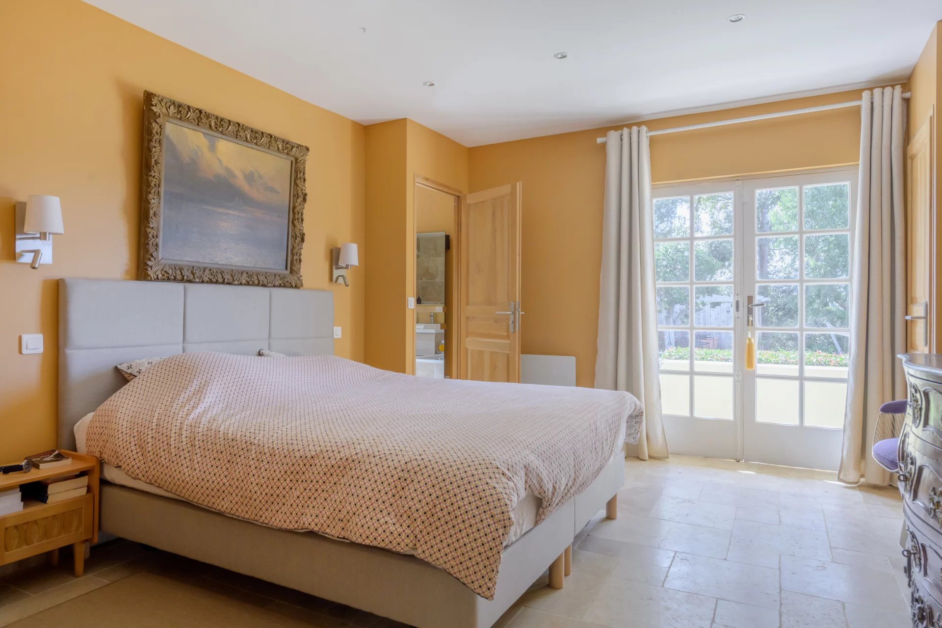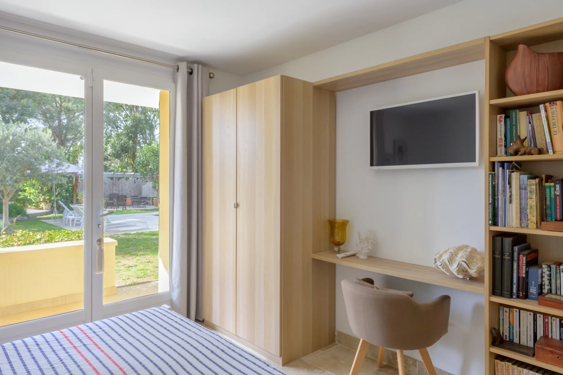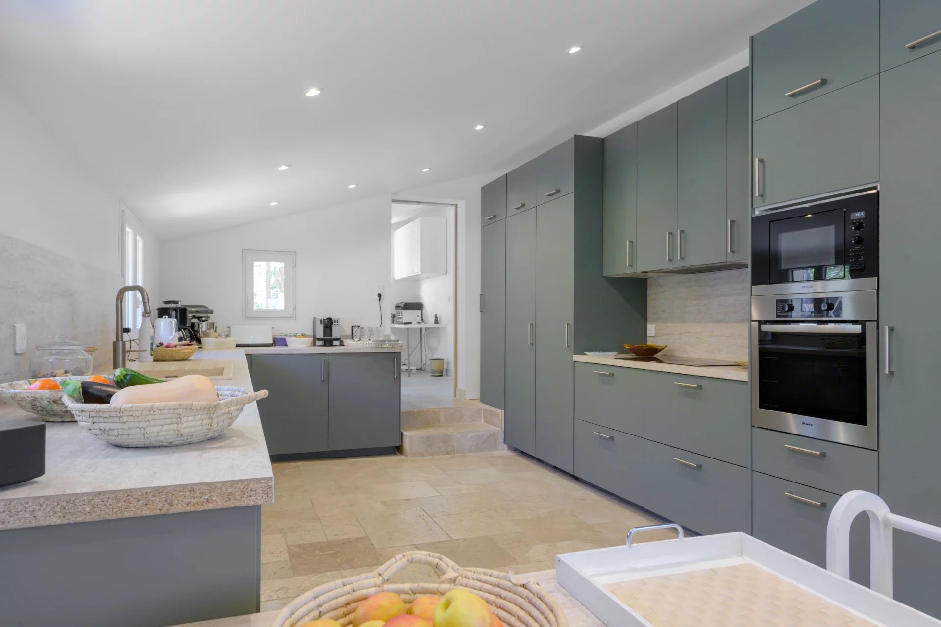 On one side, a main entrance with office area, a toilet, a fully-equipped kitchen and a large living room opening onto the terrace and garden, as well as an owner’s suite with dressing room, bathroom and toilet;