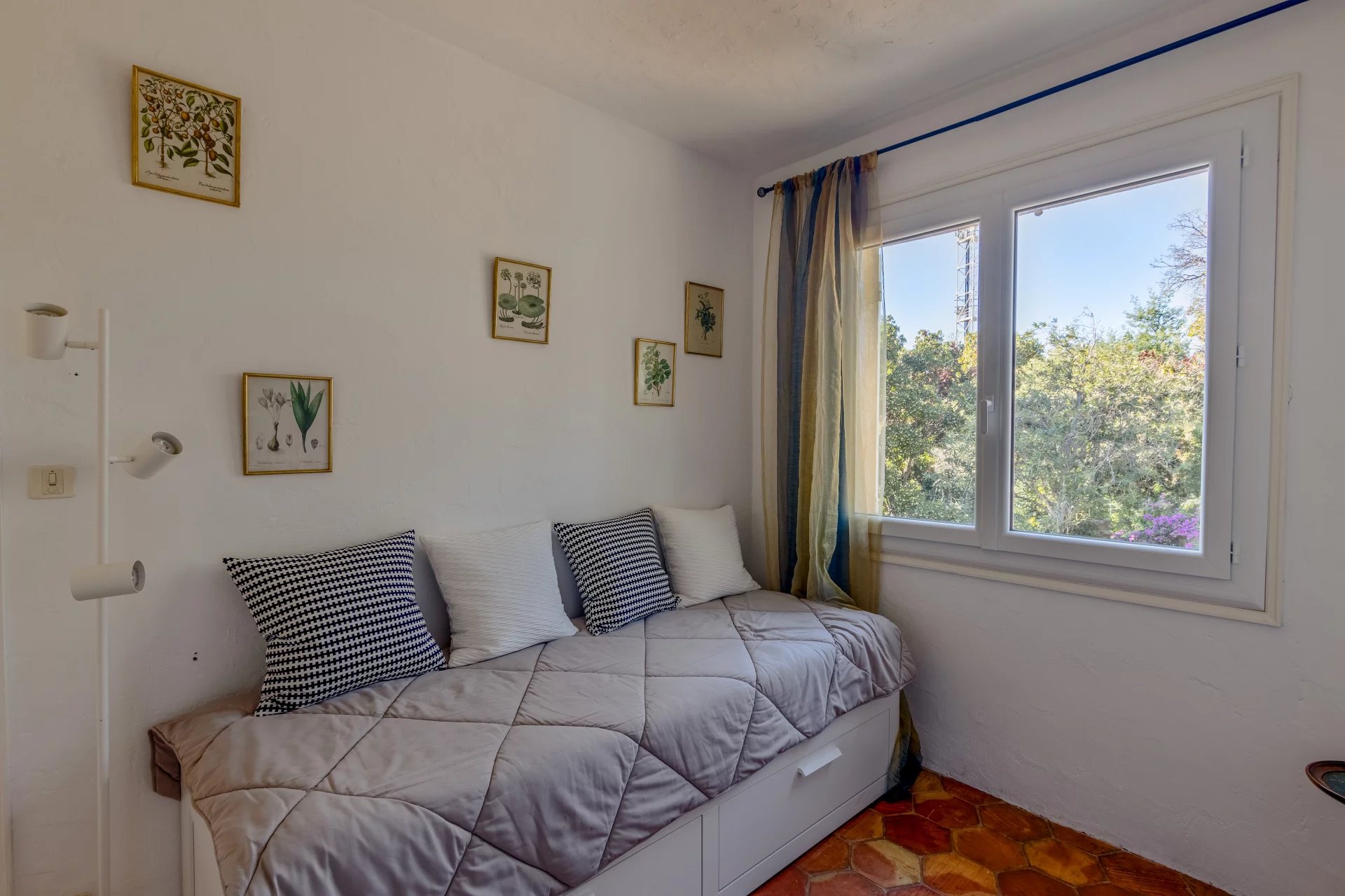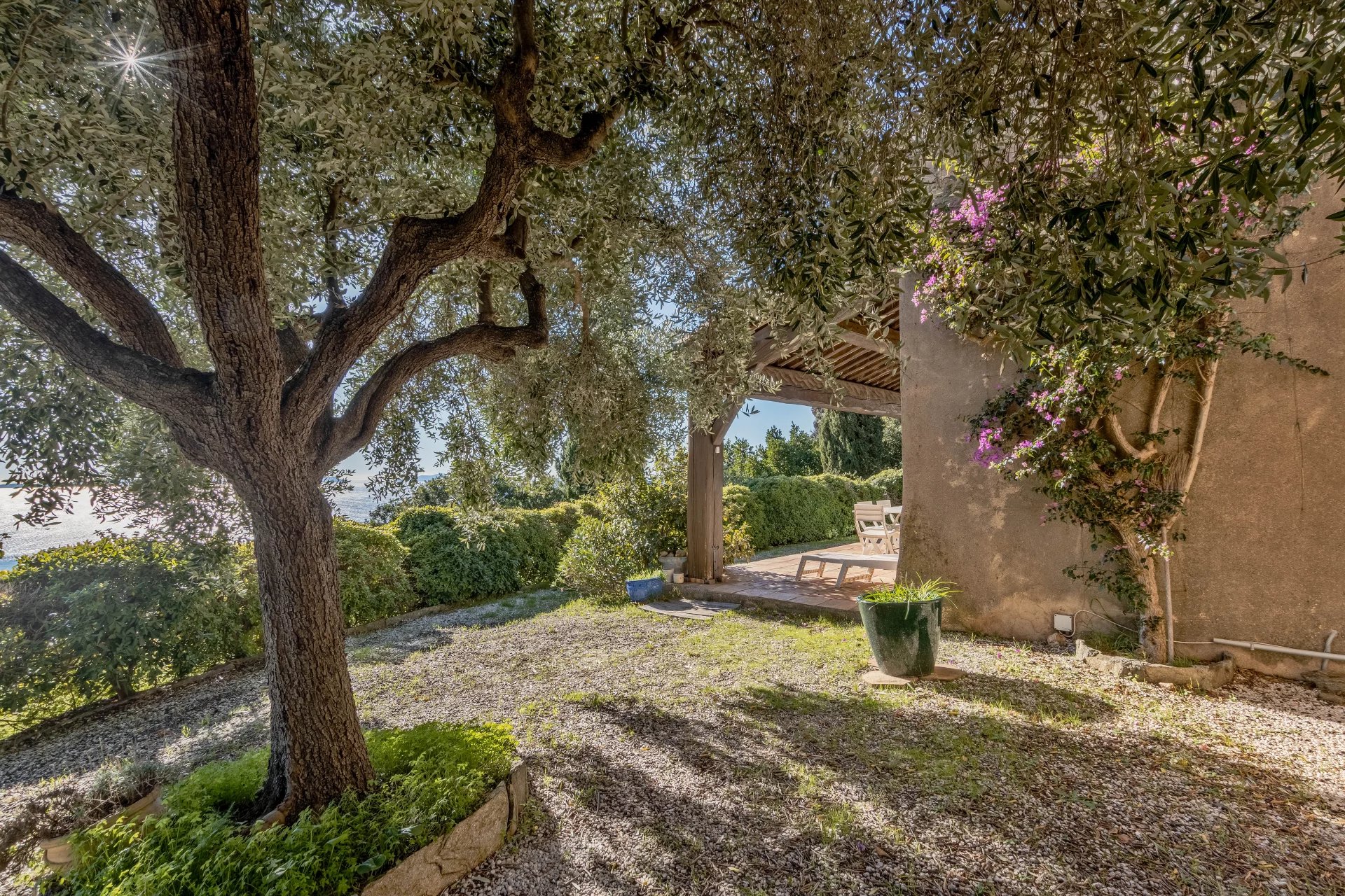 Outside, the tree-lined garden offers a peaceful and unspoilt setting, ideal for relaxation and contemplation facing the sea.