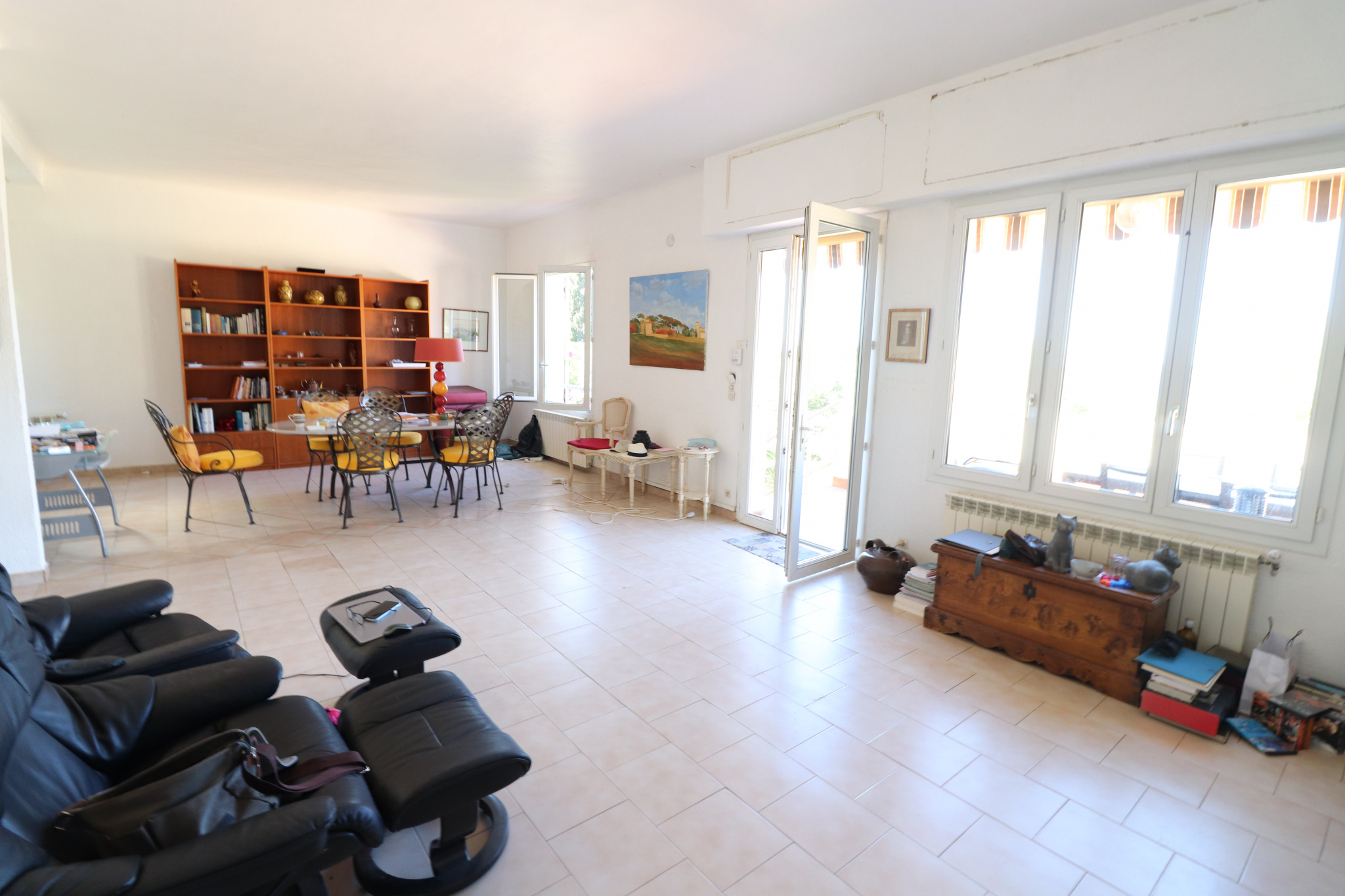 On the garden level, the villa boasts two independent apartments—one with one bedroom and the other with two bedrooms—ideal for guests or generating rental income. Ample parking space and a secure garage provide convenience and privacy.