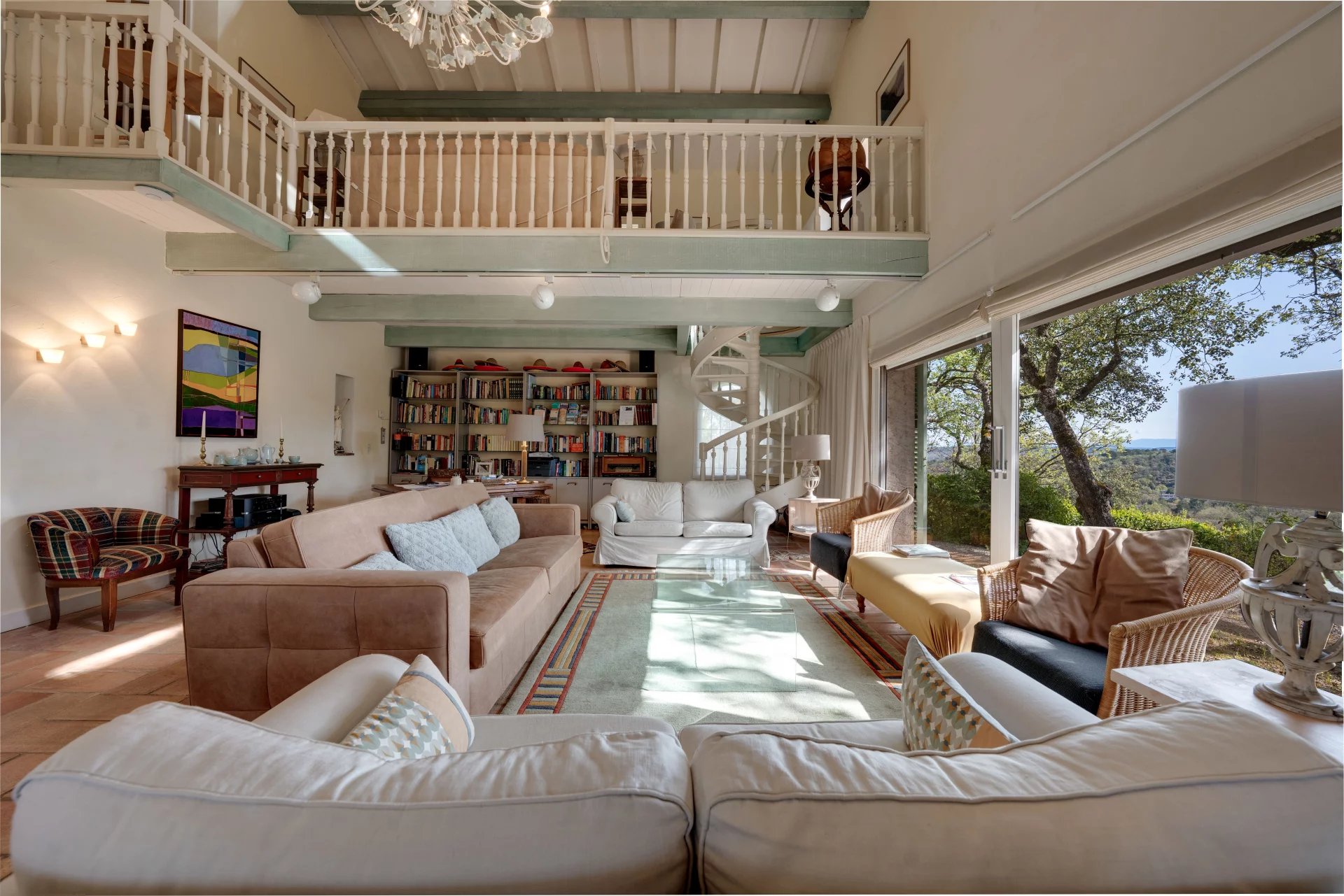The main villa features a majestic living space with a fireplace, a bar, a separate kitchen, a cathedral-ceilinged living room with a mezzanine, and a reading room. This first residence offers six bedrooms and six bathrooms.