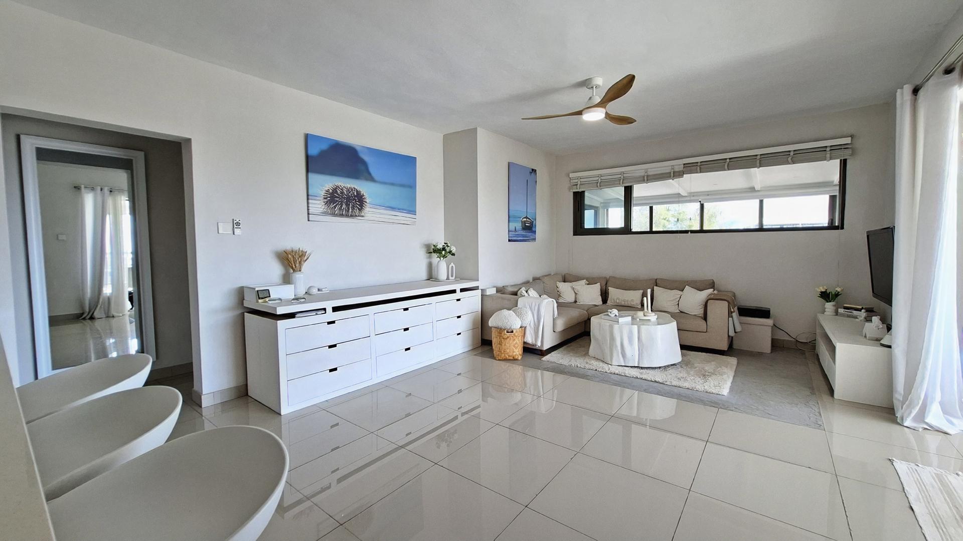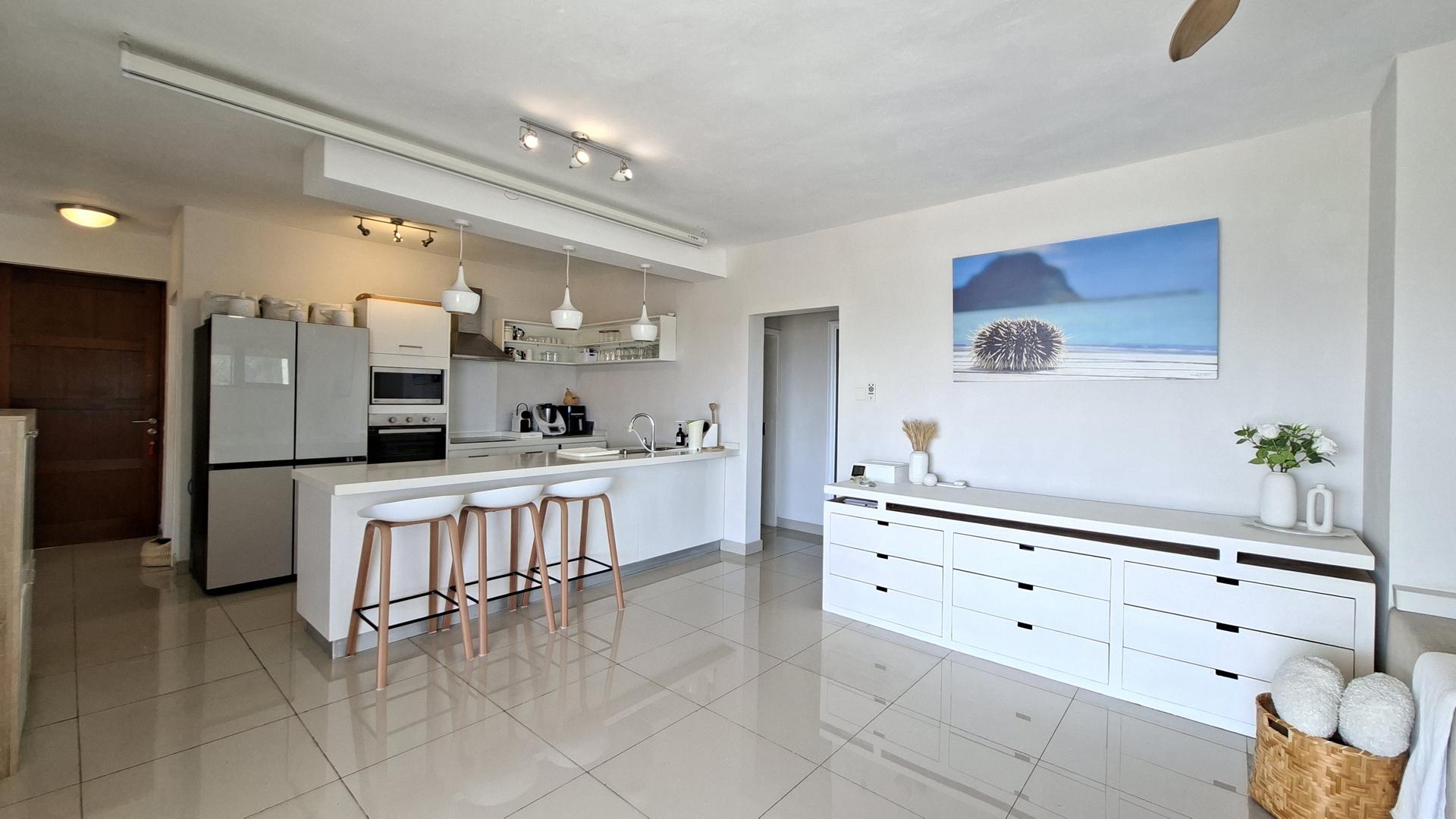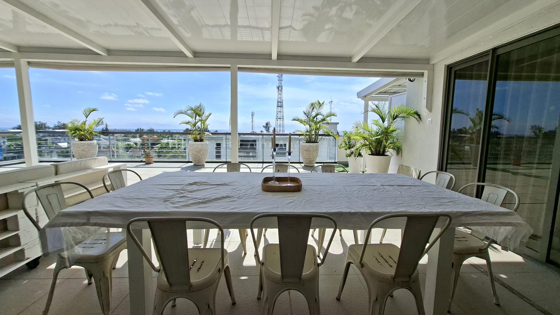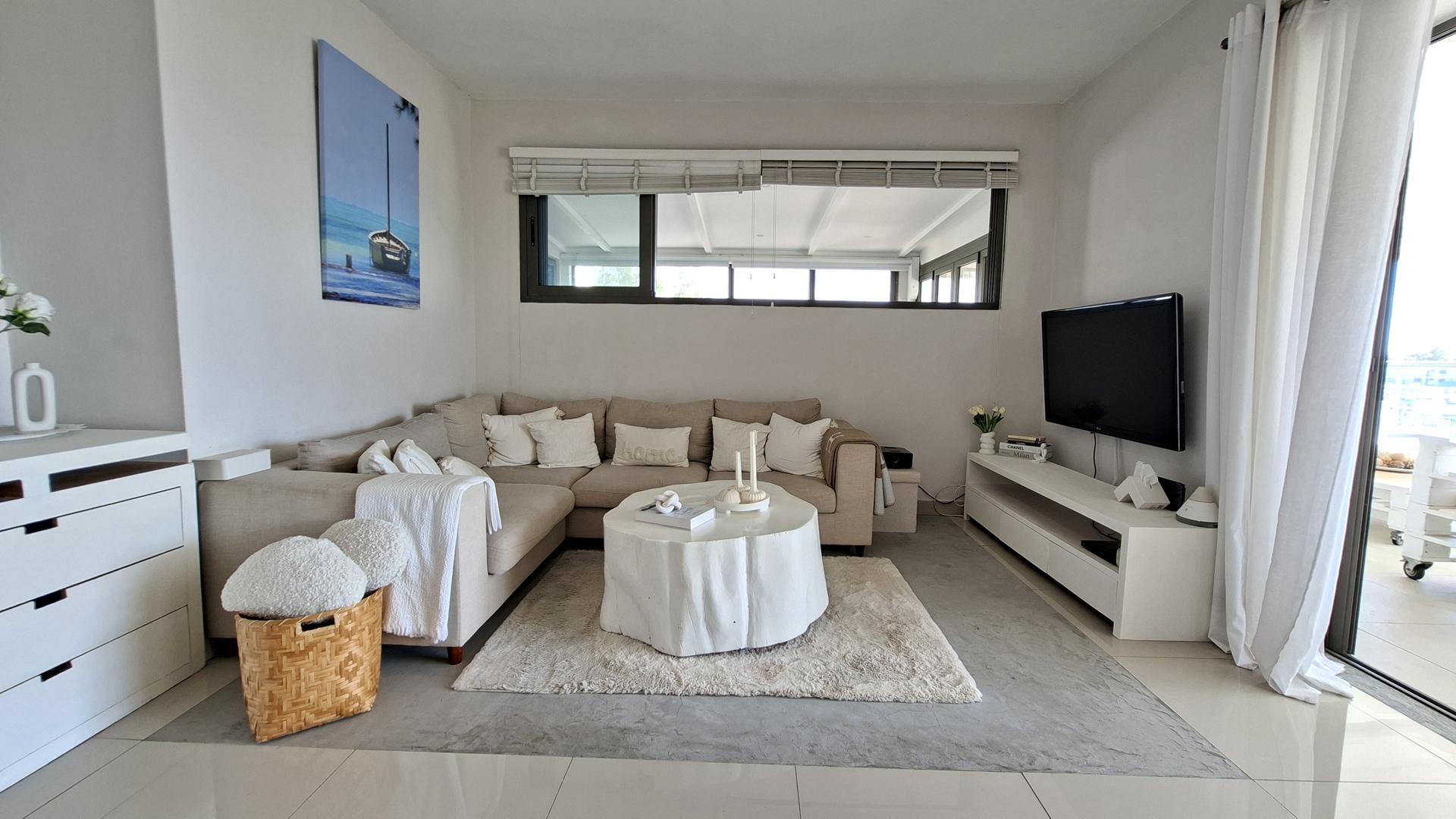 Experience refined coastal living in this beautifully appointed, 3-bedroom penthouse, ideally located within walking distance of shops and everyday conveniences. Bathed in natural light, the interior offers a bright, elegant atmosphere, enhanced by soft, neutral tones and a harmonious open-plan layout.The living space is designed for comfort and ease, featuring an American-style kitchen with quality appliances and a generous lounge area that creates a warm, inviting heart of the home. A dedicated dining area complements the ensemble, opening naturally onto the vast veranda. This outdoor space, perfectly arranged for relaxation and entertaining, enjoys sweeping views of the sea and the mountain.Find also the master suite with an en-suite bathroom, creating a calm and private retreat. A separate laundry room adds convenience, while an additional study space completes the practical layout.The penthouse is equipped with solar photovoltaic panels, air conditioning in all bedrooms, and electric water heaters, ensuring year-round comfort.Set within a secure gated residence, the property benefits from an electric entrance gate, a lift, a backup generator, 2 private parking spaces and a common swimming pool.Contact us for a visit.