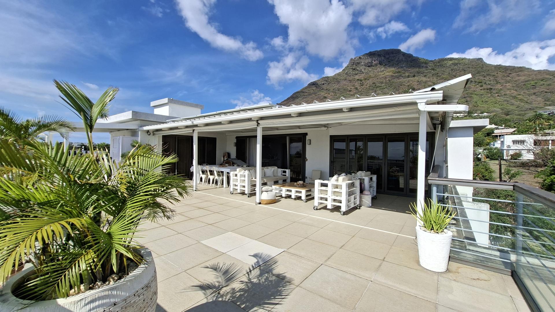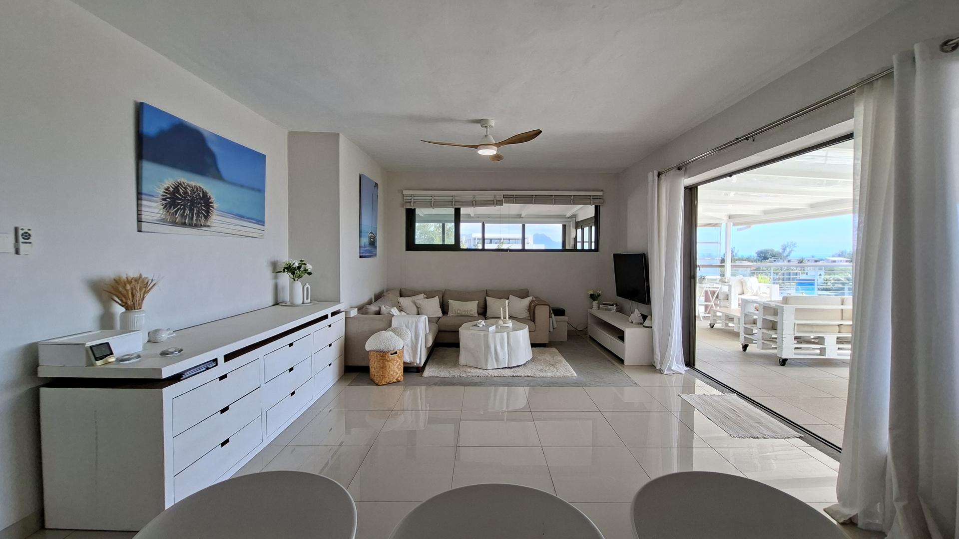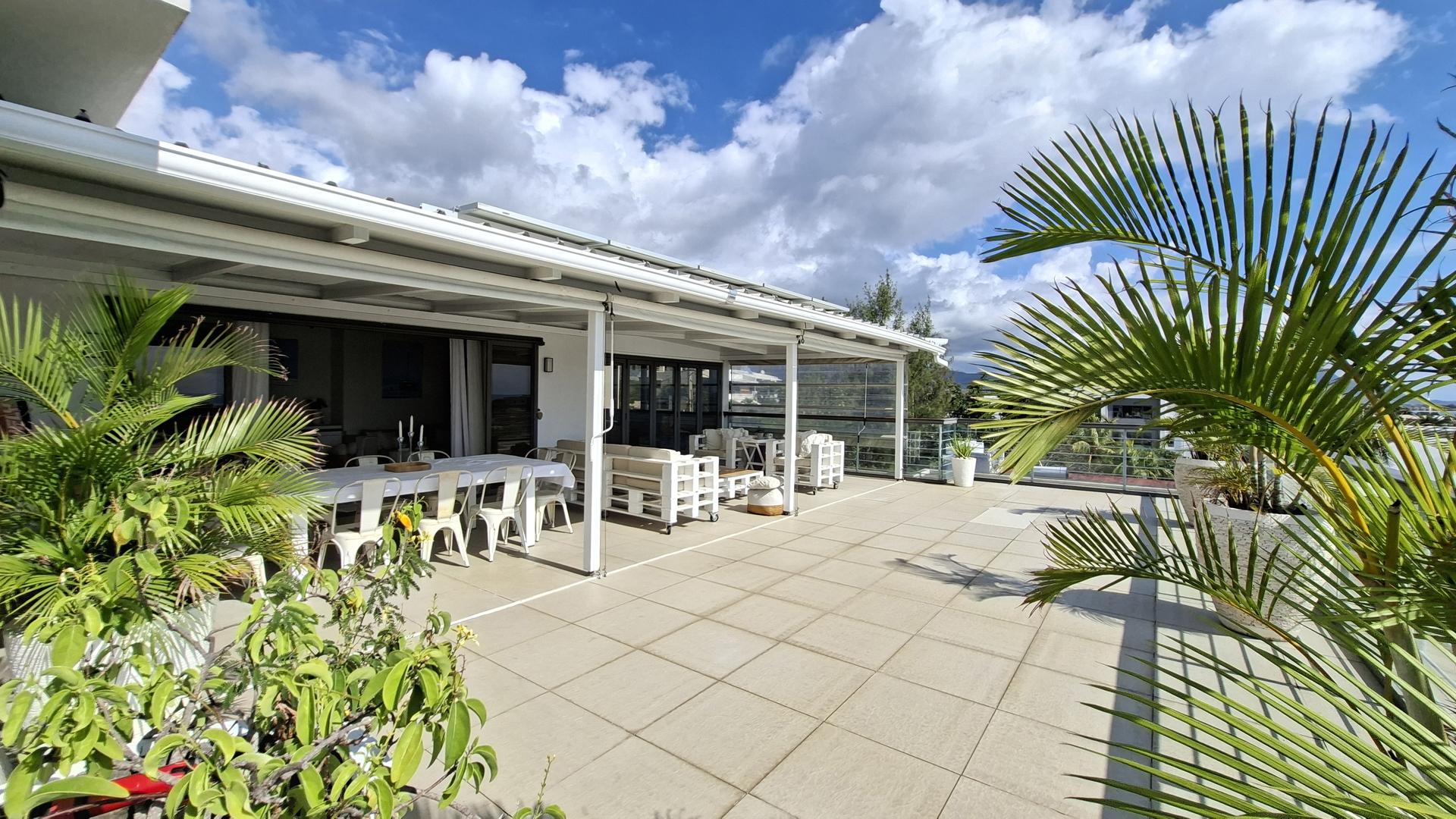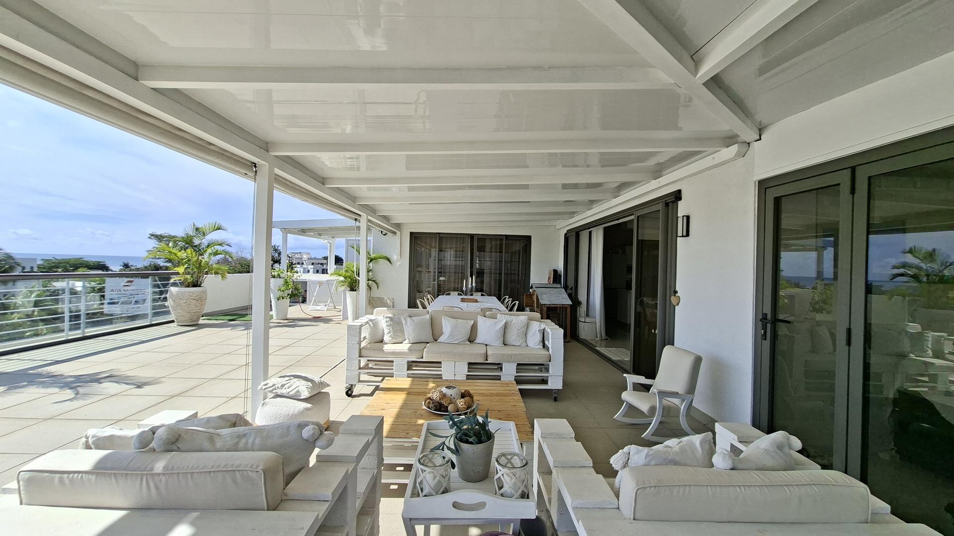 Experience refined coastal living in this beautifully appointed, 3-bedroom penthouse, ideally located within walking distance of shops and everyday conveniences. Bathed in natural light, the interior offers a bright, elegant atmosphere, enhanced by soft, neutral tones and a harmonious open-plan layout.The living space is designed for comfort and ease, featuring an American-style kitchen with quality appliances and a generous lounge area that creates a warm, inviting heart of the home. A dedicated dining area complements the ensemble, opening naturally onto the vast veranda. This outdoor space, perfectly arranged for relaxation and entertaining, enjoys sweeping views of the sea and the mountain.Find also the master suite with an en-suite bathroom, creating a calm and private retreat. A separate laundry room adds convenience, while an additional study space completes the practical layout.The penthouse is equipped with solar photovoltaic panels, air conditioning in all bedrooms, and electric water heaters, ensuring year-round comfort.Set within a secure gated residence, the property benefits from an electric entrance gate, a lift, a backup generator, 2 private parking spaces and a common swimming pool.Contact us for a visit.