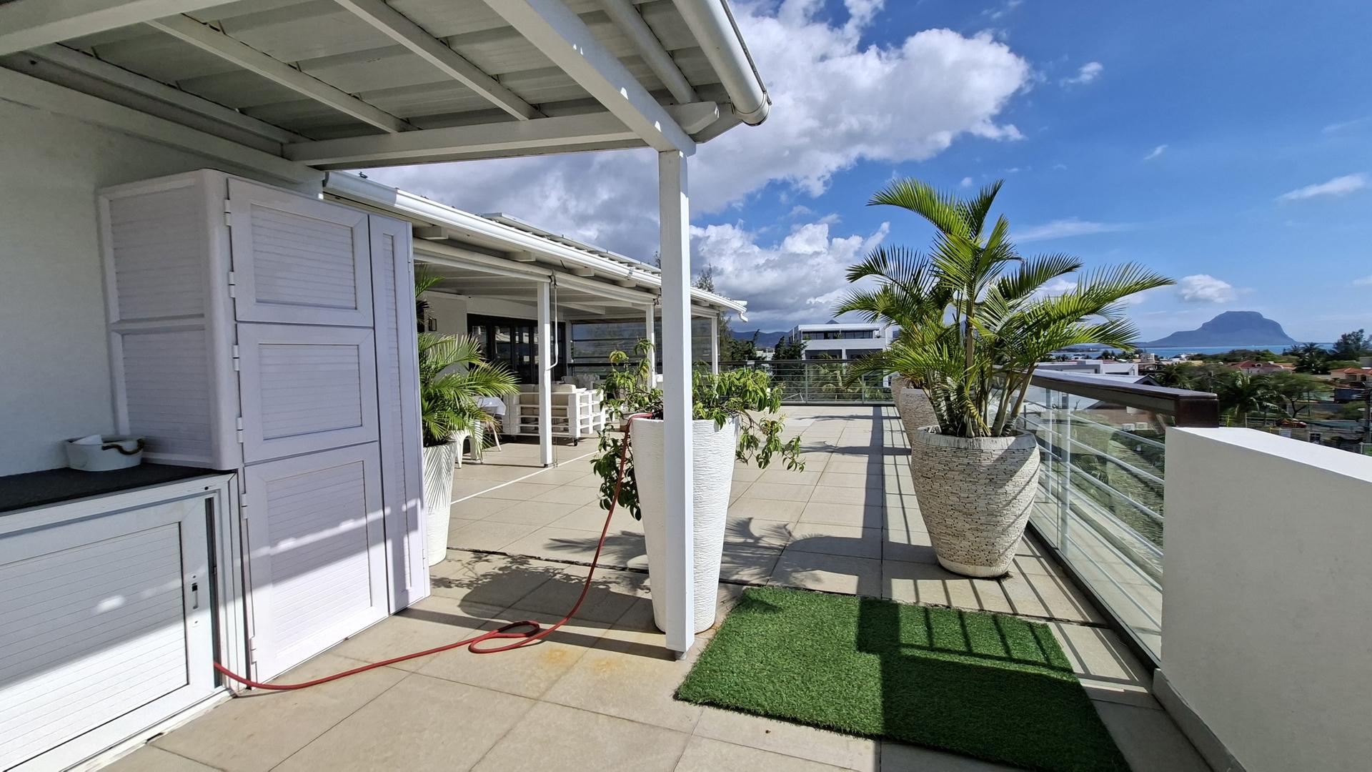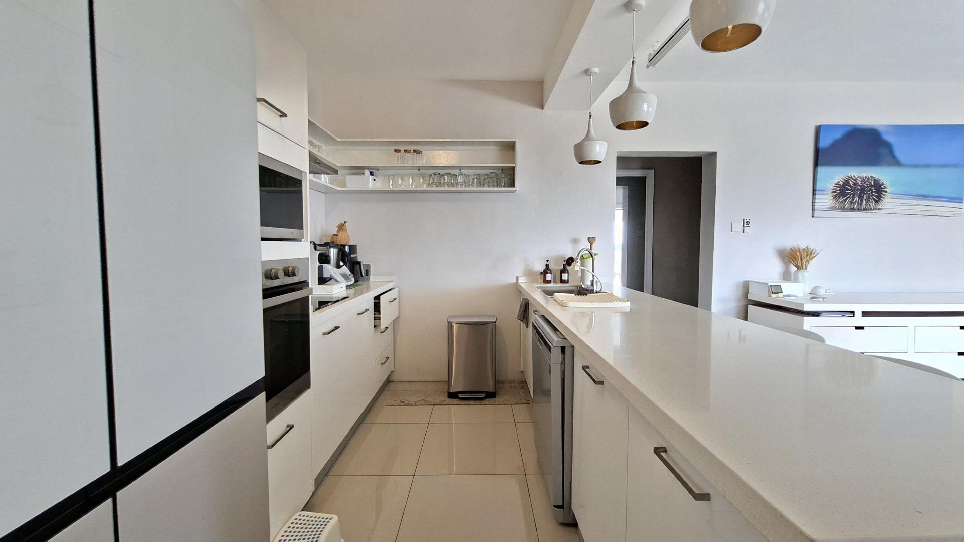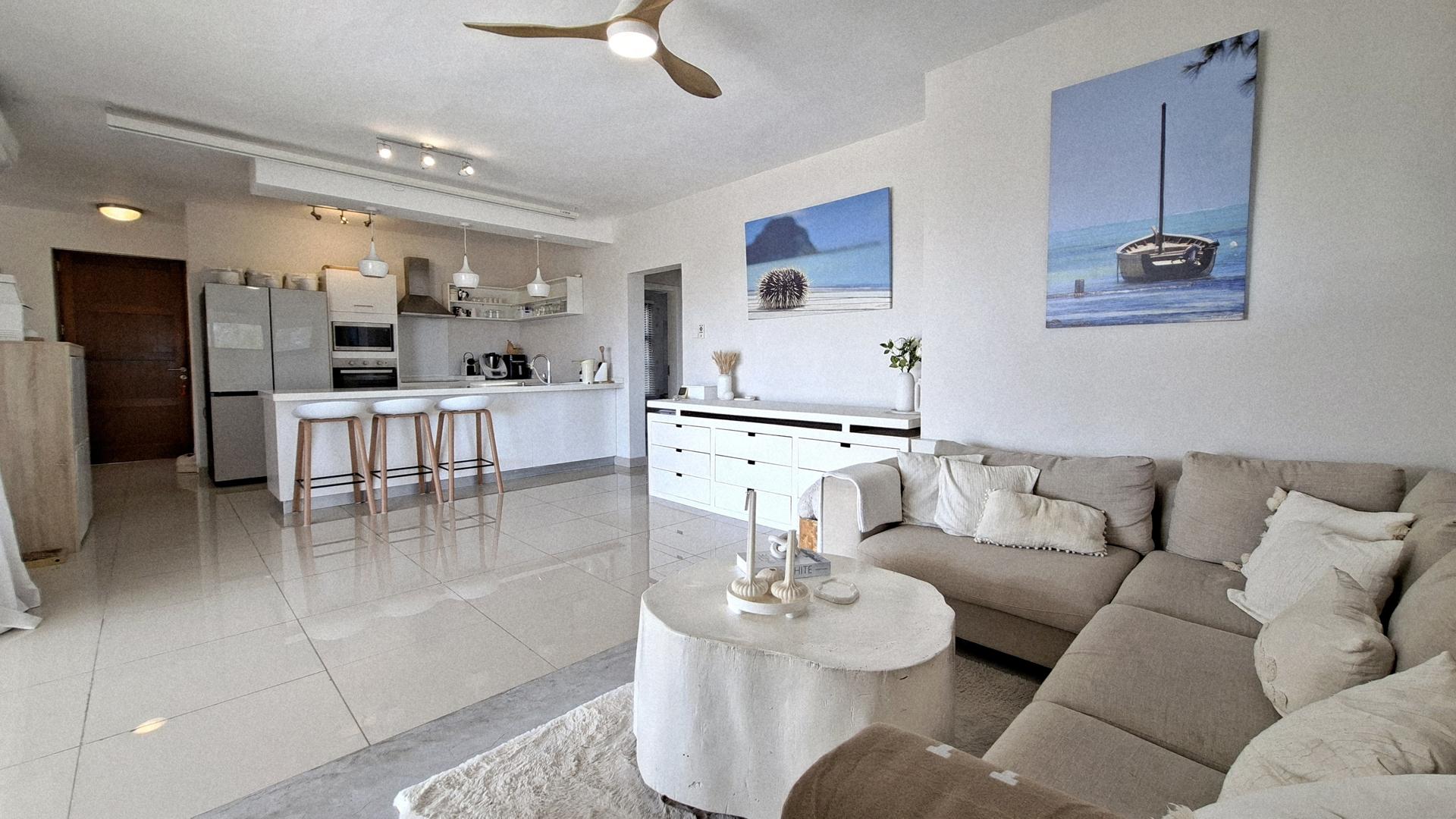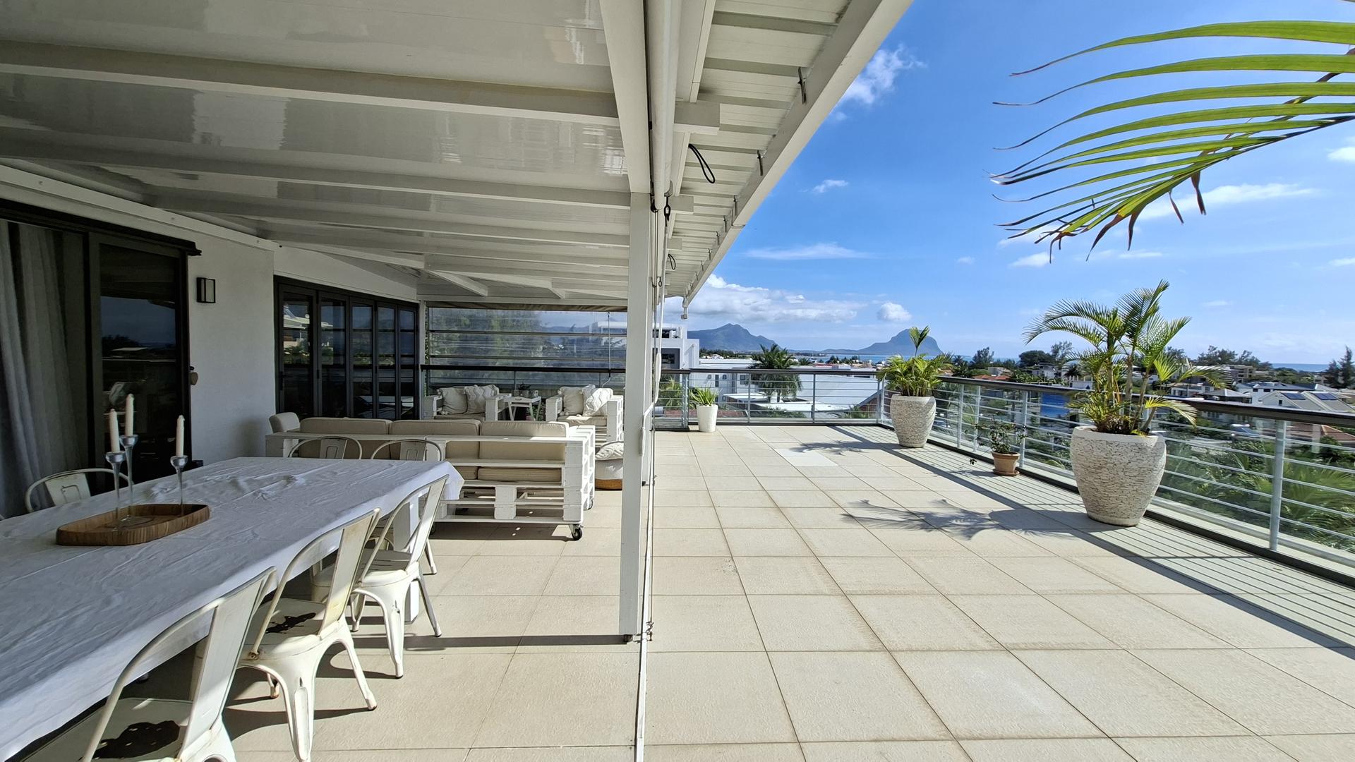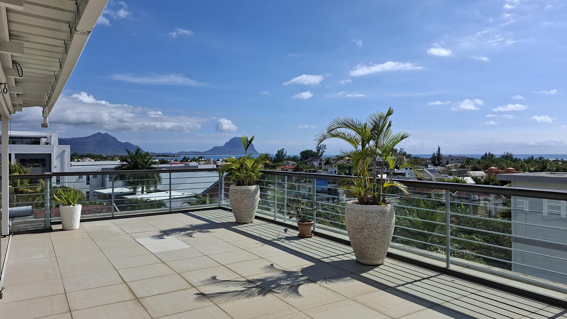 Experience refined coastal living in this beautifully appointed, 3-bedroom penthouse, ideally located within walking distance of shops and everyday conveniences. Bathed in natural light, the interior offers a bright, elegant atmosphere, enhanced by soft, neutral tones and a harmonious open-plan layout.The living space is designed for comfort and ease, featuring an American-style kitchen with quality appliances and a generous lounge area that creates a warm, inviting heart of the home. A dedicated dining area complements the ensemble, opening naturally onto the vast veranda. This outdoor space, perfectly arranged for relaxation and entertaining, enjoys sweeping views of the sea and the mountain.Find also the master suite with an en-suite bathroom, creating a calm and private retreat. A separate laundry room adds convenience, while an additional study space completes the practical layout.The penthouse is equipped with solar photovoltaic panels, air conditioning in all bedrooms, and electric water heaters, ensuring year-round comfort.Set within a secure gated residence, the property benefits from an electric entrance gate, a lift, a backup generator, 2 private parking spaces and a common swimming pool.Contact us for a visit.