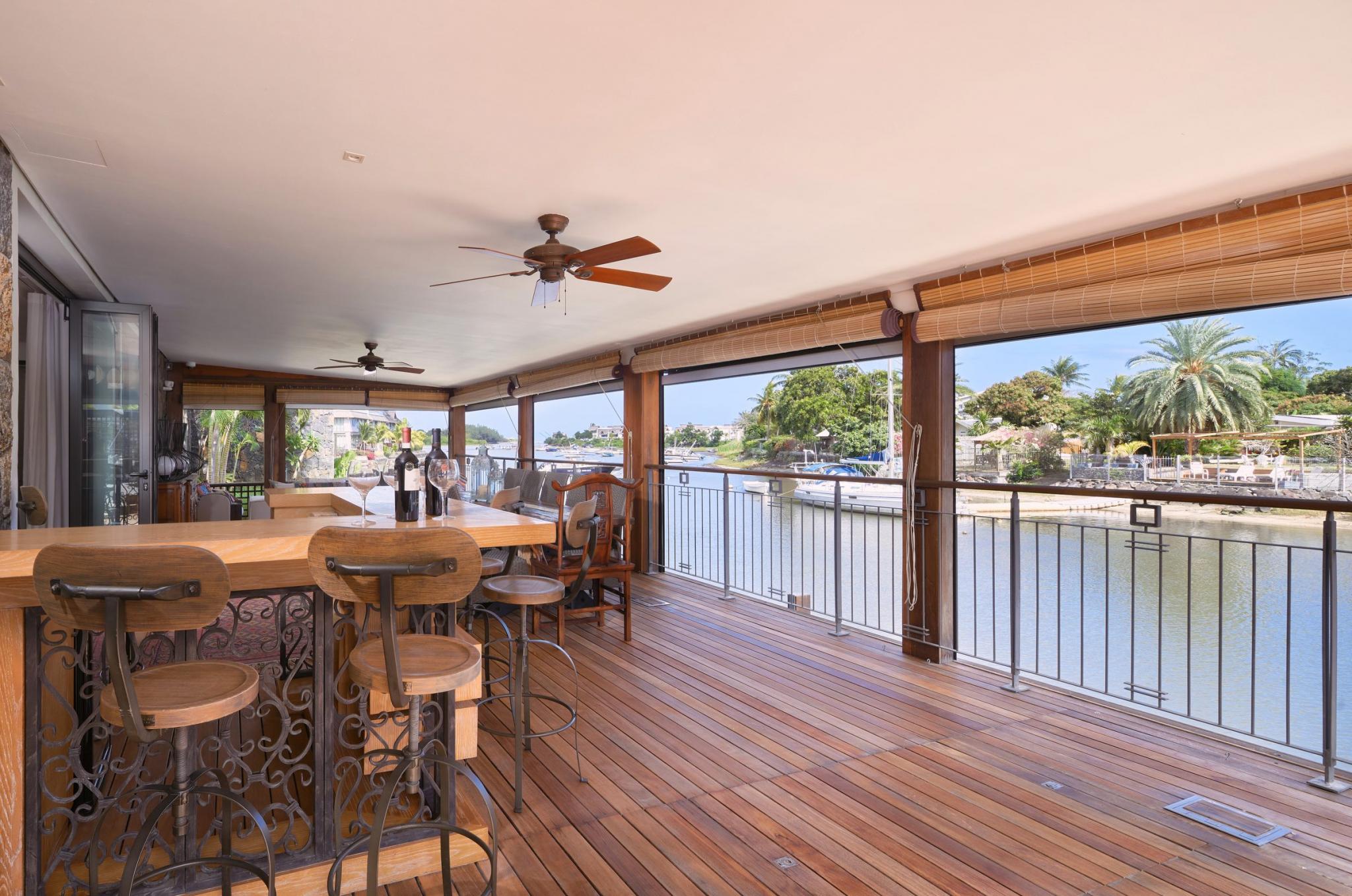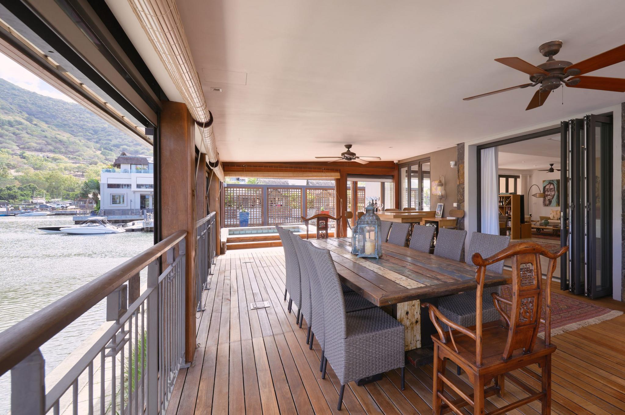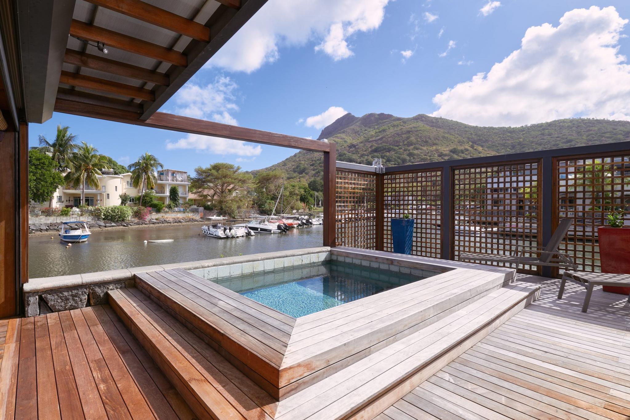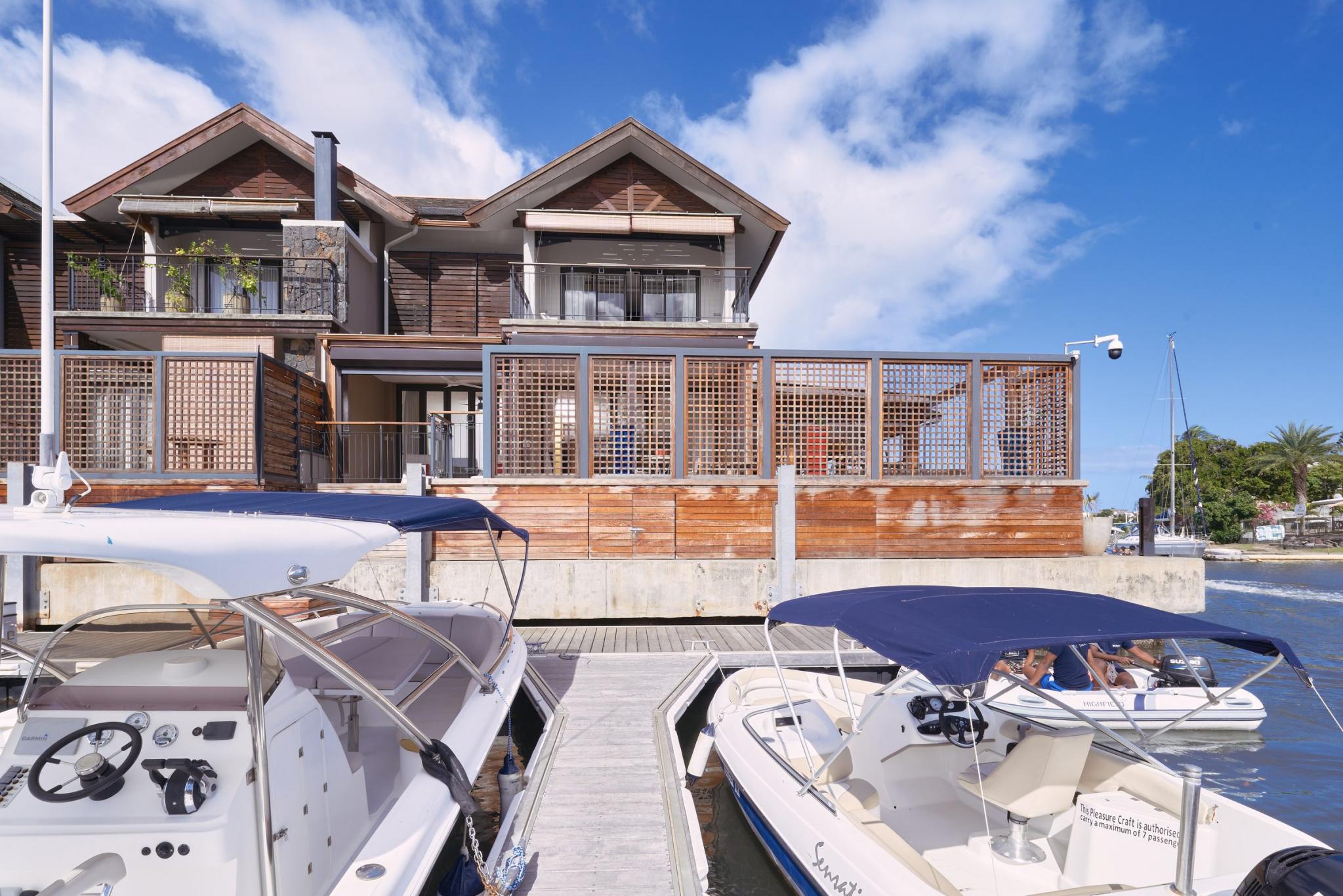 “It is life, I think, to watch the water. A man can learn so many things.” ― Nicholas Sparks In exclusivity with Mauritius Sotheby’s International Realty, welcome to the most desirable location on the Marina! A true oasis on the water’s edge, the ultimate vantage point to observe everyday nautical life in and around La Balise Marina, this 3-bedroom duplex is a pure gem. With outlooks to the West, North, and East, the owners of this dreamy duplex have optimized the unique position with a bespoke, wooden deck, that runs the full length of the property and connects back around to the front.It’s the perfect setup for entertaining family and friends on the water, and the most effortless, boat-in/boat-out experience one is likely to find. There are 3 en-suite bedrooms, all on the first floor, 2 of which have fabulous views. The extended master suite offers extra closet space, a large en-suite, and a private, sun-filled, balcony for some quiet time.Downstairs you will find an open plan living room and fully equipped kitchen, a guest WC and store room neatly fitted under the stairs, a scullery and covered outdoor sink & bins area – perfect for drying laundry out of sight. ‘La piece de résistance’ has to be the generous L-shaped deck complete with a private pool, bar, and plenty of place for a large dining table and outdoor seating area. An entertainer’s paradise, this USP really opens up the home, letting in natural light and creating such wonderful space, while still working remarkably well as a lock up and go. Clear, electric roll-down blinds efficiently shield the deck should undesirable weather roll in, while maintaining the unobstructed views of the bay and La Tourelle Mountain.Built circa 2015 and lovingly maintained by a single owner who has continuously improved on practical aspects and aesthetics which lend such endless charm to this home. Perfect for all lovers of the sea who are looking for a permanent or semi-permanent residence on the warm and calm waters of Black River. Other enviable features include 3 private berths of 12 to 15M in length, a large boat garage/hanger, and a covered parking bay. If not needed, the pontoons and boat hangers are always in high demand and can be rented out, thereby comfortably covering monthly upkeep and syndic levies.La Balise Marina is the only residential marina in Mauritius, services and amenities include 24hr security, a 25M lap pool, tennis court, clubhouse and pool, and boutique owners fitness room. Boat charter operators and management service providers are close by as well as office space and a popular restaurant just across the water.