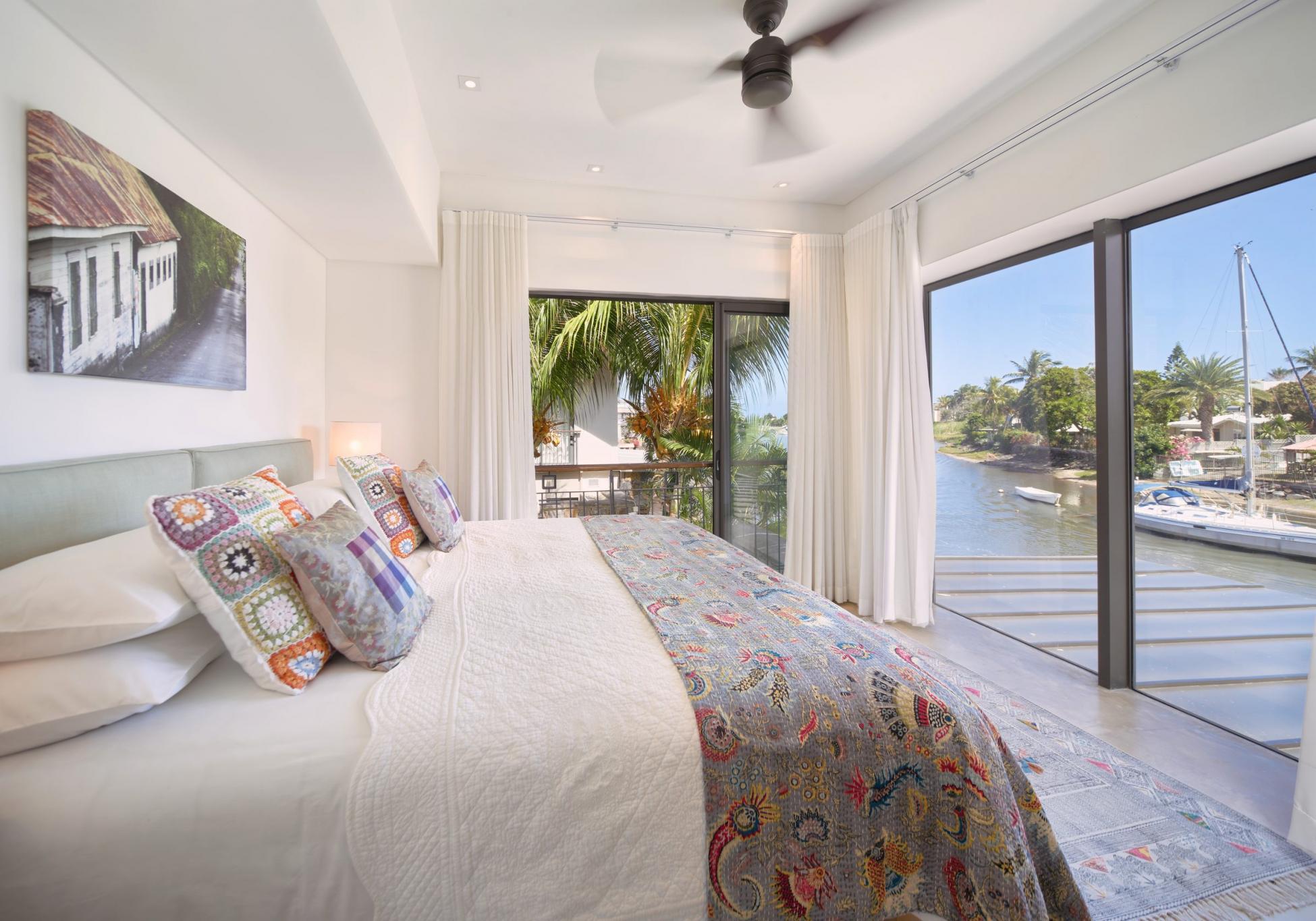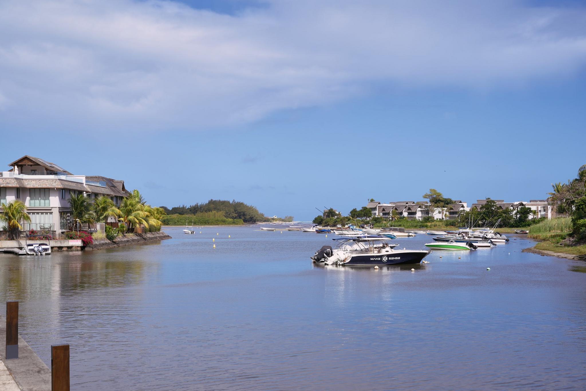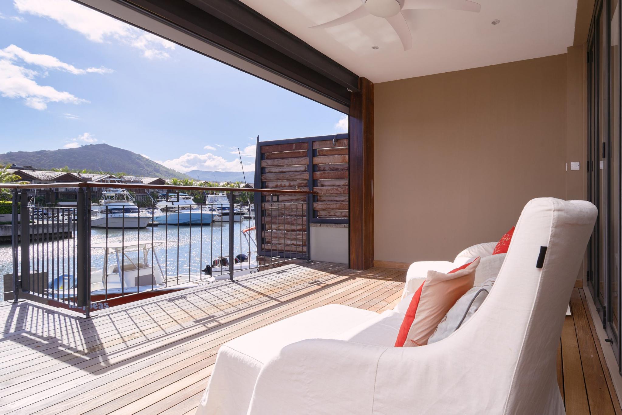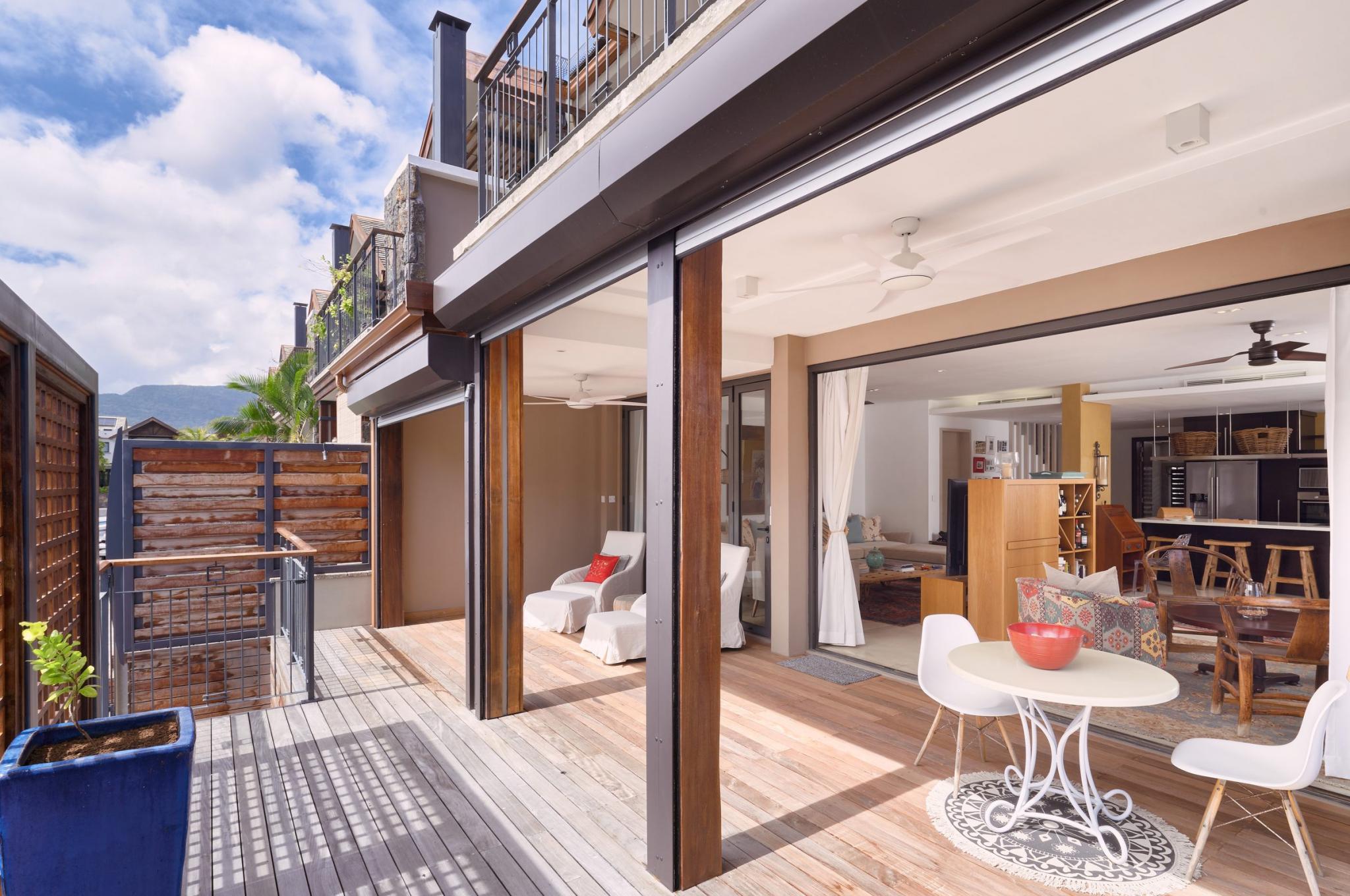 “It is life, I think, to watch the water. A man can learn so many things.” ― Nicholas Sparks In exclusivity with Mauritius Sotheby’s International Realty, welcome to the most desirable location on the Marina! A true oasis on the water’s edge, the ultimate vantage point to observe everyday nautical life in and around La Balise Marina, this 3-bedroom duplex is a pure gem. With outlooks to the West, North, and East, the owners of this dreamy duplex have optimized the unique position with a bespoke, wooden deck, that runs the full length of the property and connects back around to the front.It’s the perfect setup for entertaining family and friends on the water, and the most effortless, boat-in/boat-out experience one is likely to find. There are 3 en-suite bedrooms, all on the first floor, 2 of which have fabulous views. The extended master suite offers extra closet space, a large en-suite, and a private, sun-filled, balcony for some quiet time.Downstairs you will find an open plan living room and fully equipped kitchen, a guest WC and store room neatly fitted under the stairs, a scullery and covered outdoor sink & bins area – perfect for drying laundry out of sight. ‘La piece de résistance’ has to be the generous L-shaped deck complete with a private pool, bar, and plenty of place for a large dining table and outdoor seating area. An entertainer’s paradise, this USP really opens up the home, letting in natural light and creating such wonderful space, while still working remarkably well as a lock up and go. Clear, electric roll-down blinds efficiently shield the deck should undesirable weather roll in, while maintaining the unobstructed views of the bay and La Tourelle Mountain.Built circa 2015 and lovingly maintained by a single owner who has continuously improved on practical aspects and aesthetics which lend such endless charm to this home. Perfect for all lovers of the sea who are looking for a permanent or semi-permanent residence on the warm and calm waters of Black River. Other enviable features include 3 private berths of 12 to 15M in length, a large boat garage/hanger, and a covered parking bay. If not needed, the pontoons and boat hangers are always in high demand and can be rented out, thereby comfortably covering monthly upkeep and syndic levies.La Balise Marina is the only residential marina in Mauritius, services and amenities include 24hr security, a 25M lap pool, tennis court, clubhouse and pool, and boutique owners fitness room. Boat charter operators and management service providers are close by as well as office space and a popular restaurant just across the water.