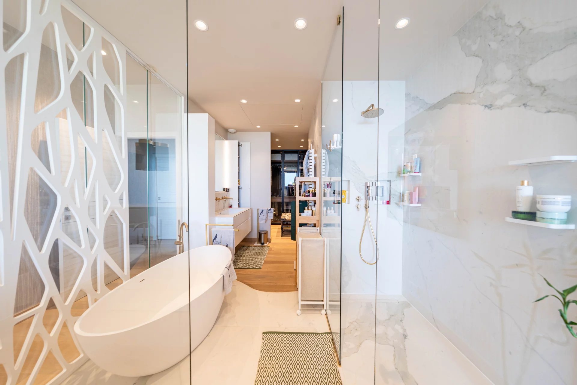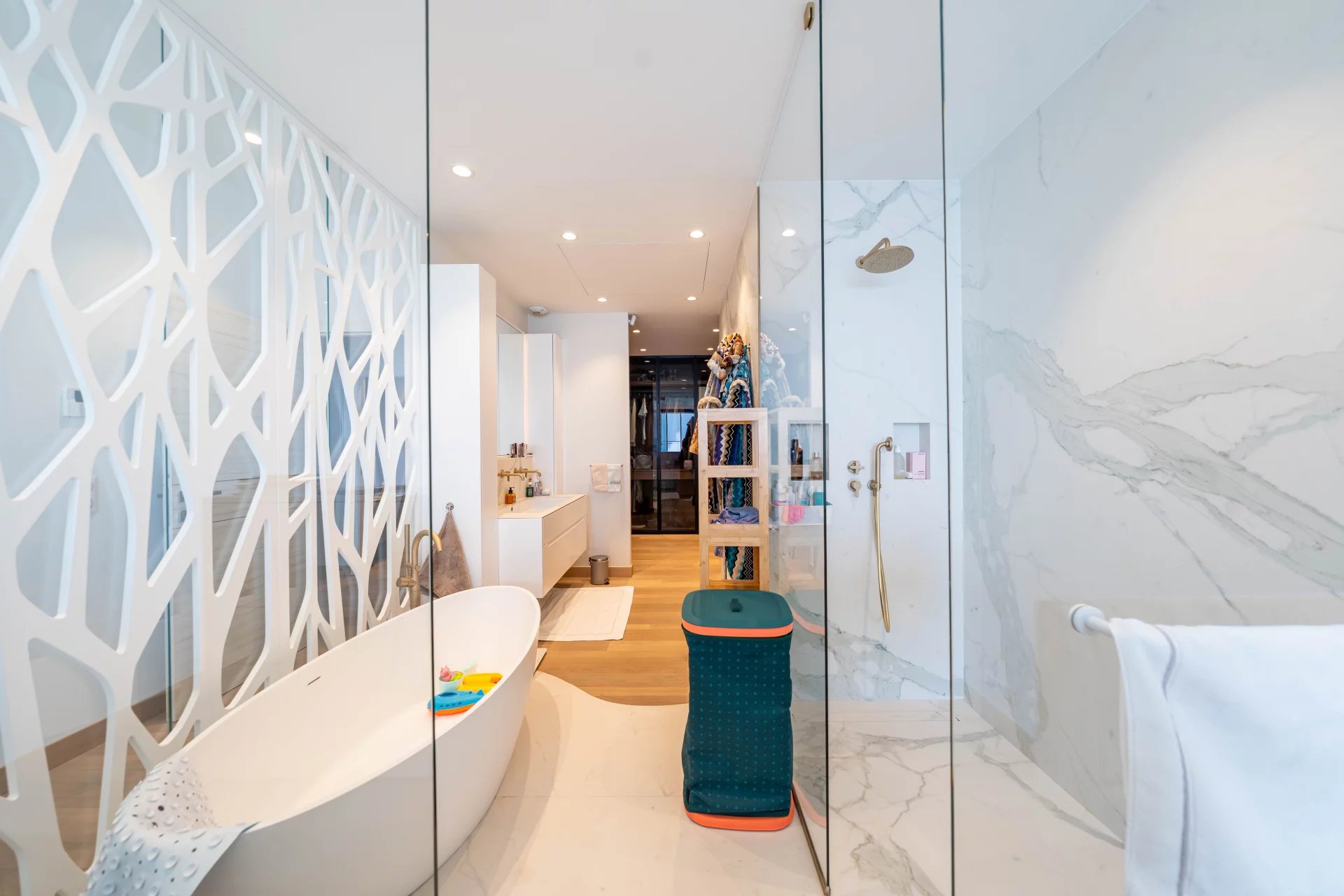 – Second Floor: A grand entrance sets the tone, opening into a luminous reception area that includes a vast living room, formal dining room, study, and a sleek modern kitchen with an adjoining laundry room. A wraparound corner terrace invites you to bask in breathtaking views of the Mediterranean coastline and Monaco’s skyline.