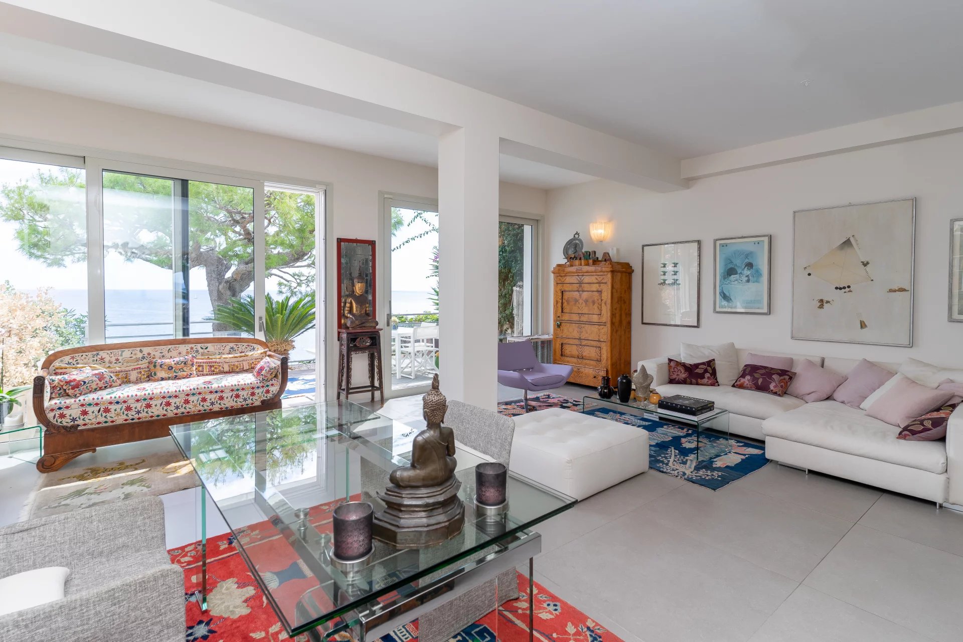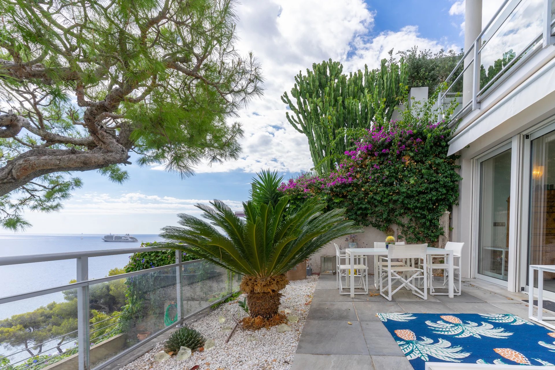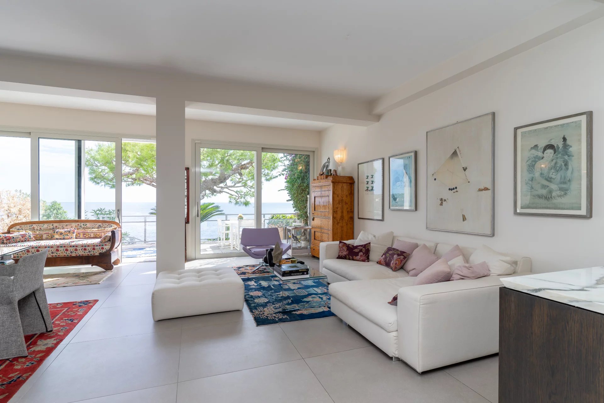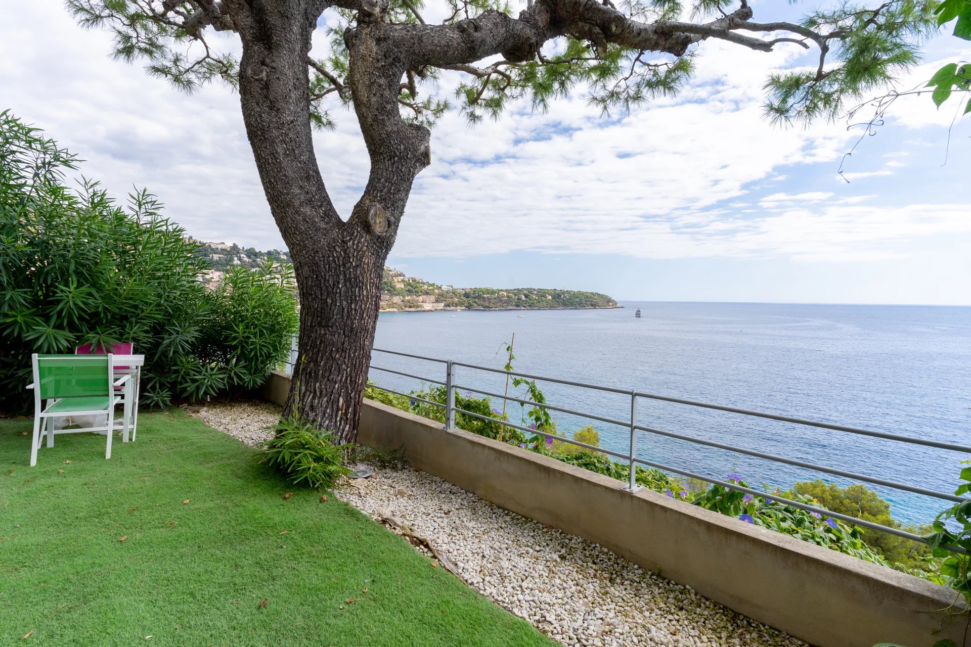 With breathtaking sea views, the apartment comprises an entrance hall, a large living room with bay windows opening onto a terrace and garden, a kitchenette, a laundry room, two bedrooms with en-suite shower rooms.