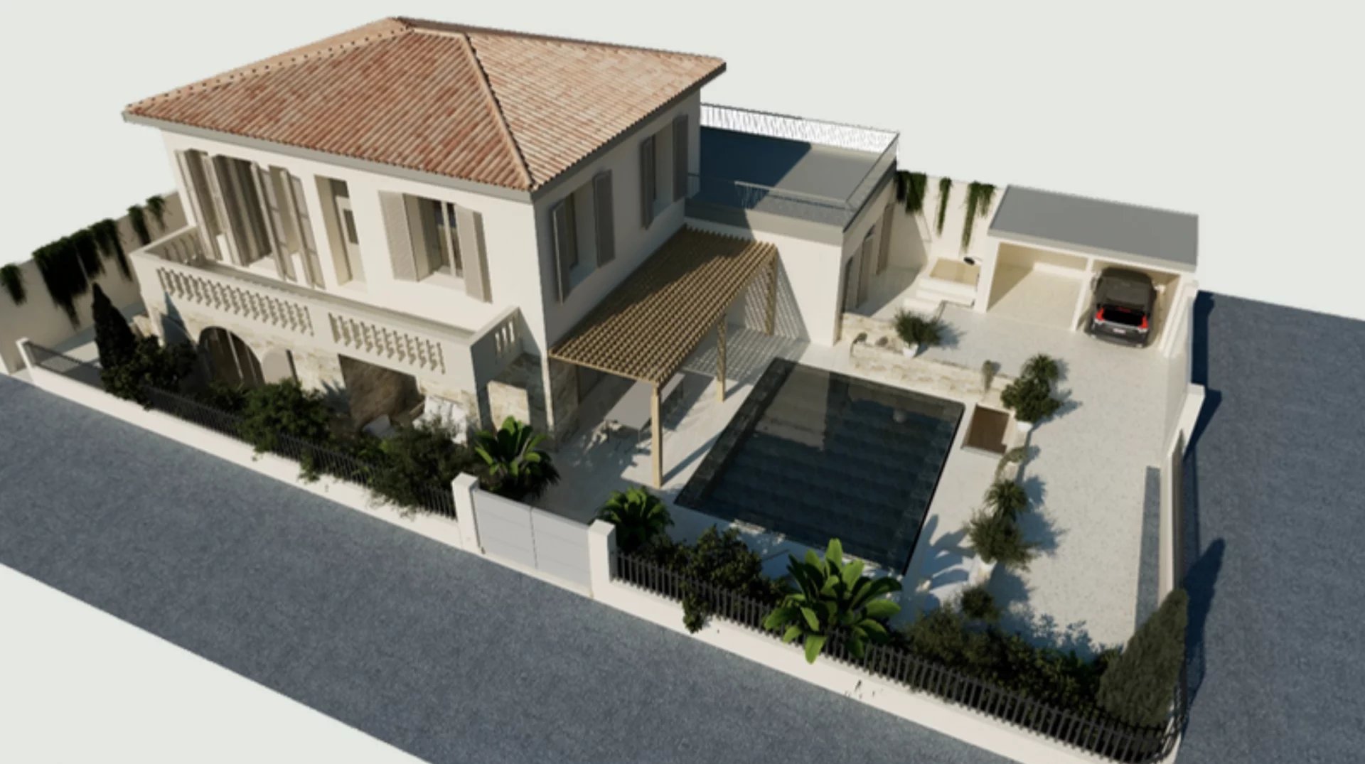 The main house includes on the ground floor an entrance, living area with kitchen, laundry room, WC, veranda and several terraces.
