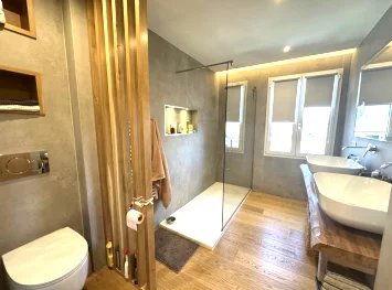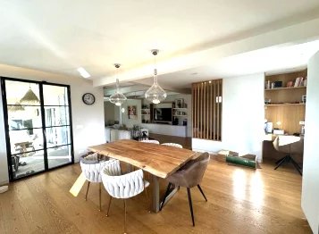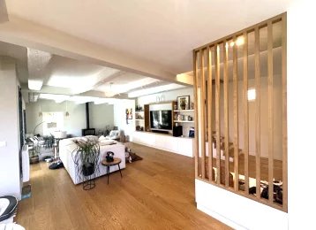 The second floor offers a magnificent, light-filled 80 m2 open-plan living space, comprising a living room, dining room, fully-equipped kitchen, sitting room with wood-burning stove, study, guest toilet, and a 30 m2 veranda harmoniously extending the volumes outwards.