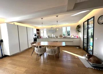 Spread over three levels, the property offers approx. 160 m2 of living space (250 m2 in total). The first floor opens onto a vast 60 m2 garage for up to three vehicles, with direct access to the interior of the house.