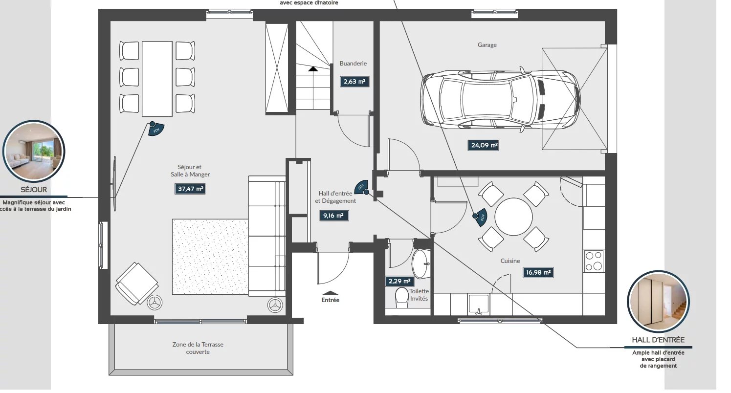 Entrance hall, living room, dining room, kitchen, guest toilet, laundry room, garage and large terrace.