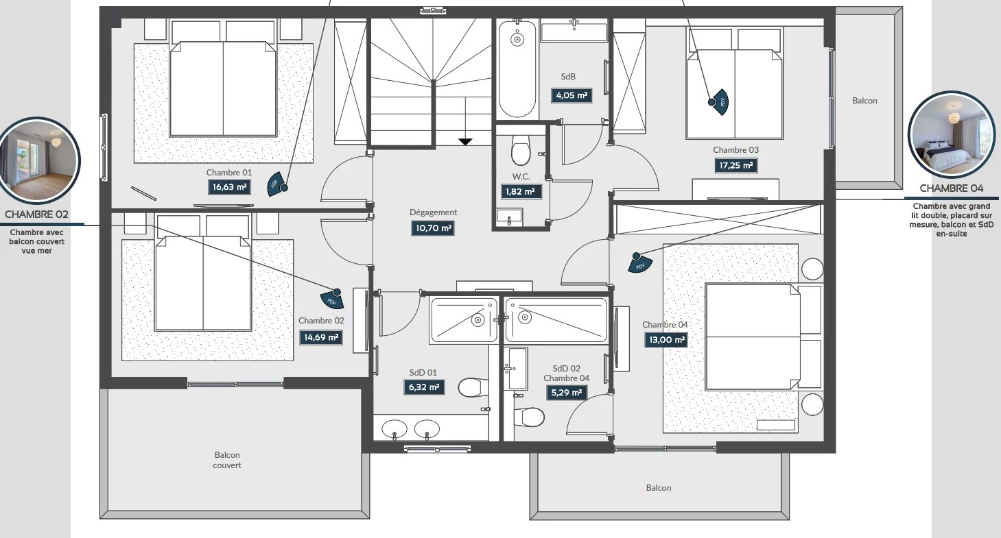 A large bedroom with en suite bathroom, three further bedrooms, a bathroom, a shower room, guest toilet, plus three balconies, one of which is open-plan.