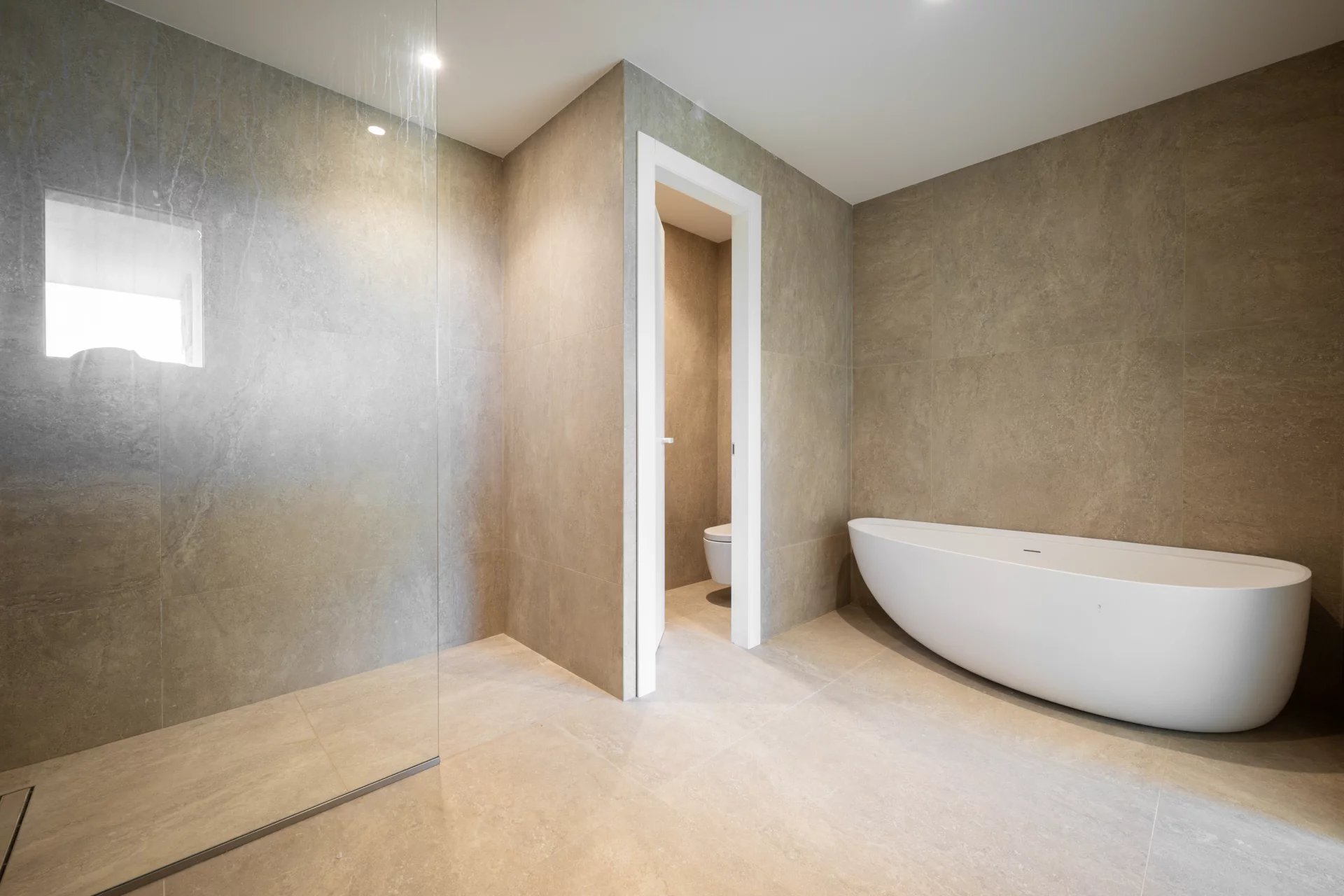 The lower level features four bedrooms, three shower rooms, and direct access to the outdoor areas.